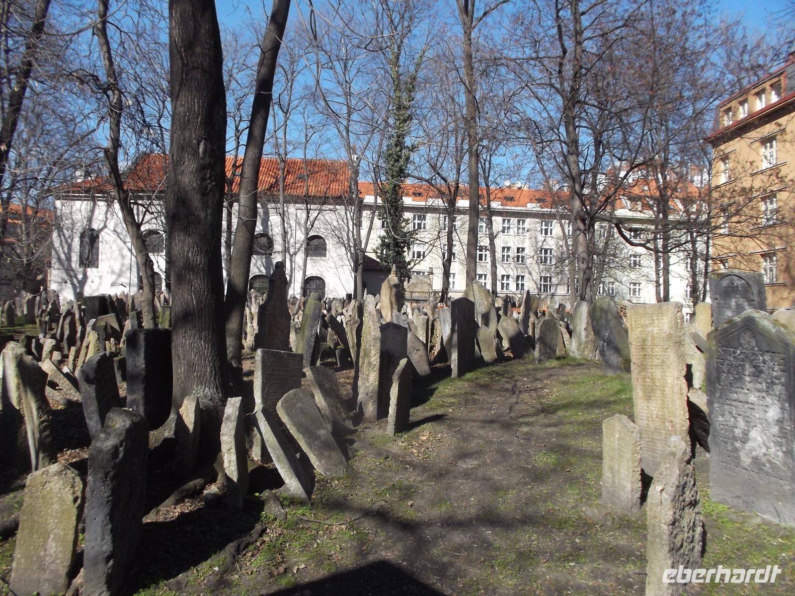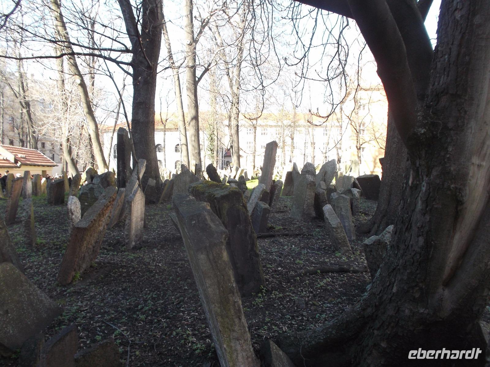Wir verließen den Burgkomplex wieder durch den Ehrenhof und fuhren zur letzten Etappe unserer Reise. Wie in vielen anderen Städten - unter anderem in Trebic, das wir schon besucht hatten - wohnte auch in Prag die jüdische Bevölkerung in abgeschlossenen Vierteln. Das Judenviertel Josefov in Prag zählt zu den größten und besterhaltenen davon. Zahlreiche Sehenswürdigkeiten und Synagogen gibt es hier, die beiden imposantesten davon erwarteten uns noch: Der Jüdische Friedhof und die größte Synagoge.
