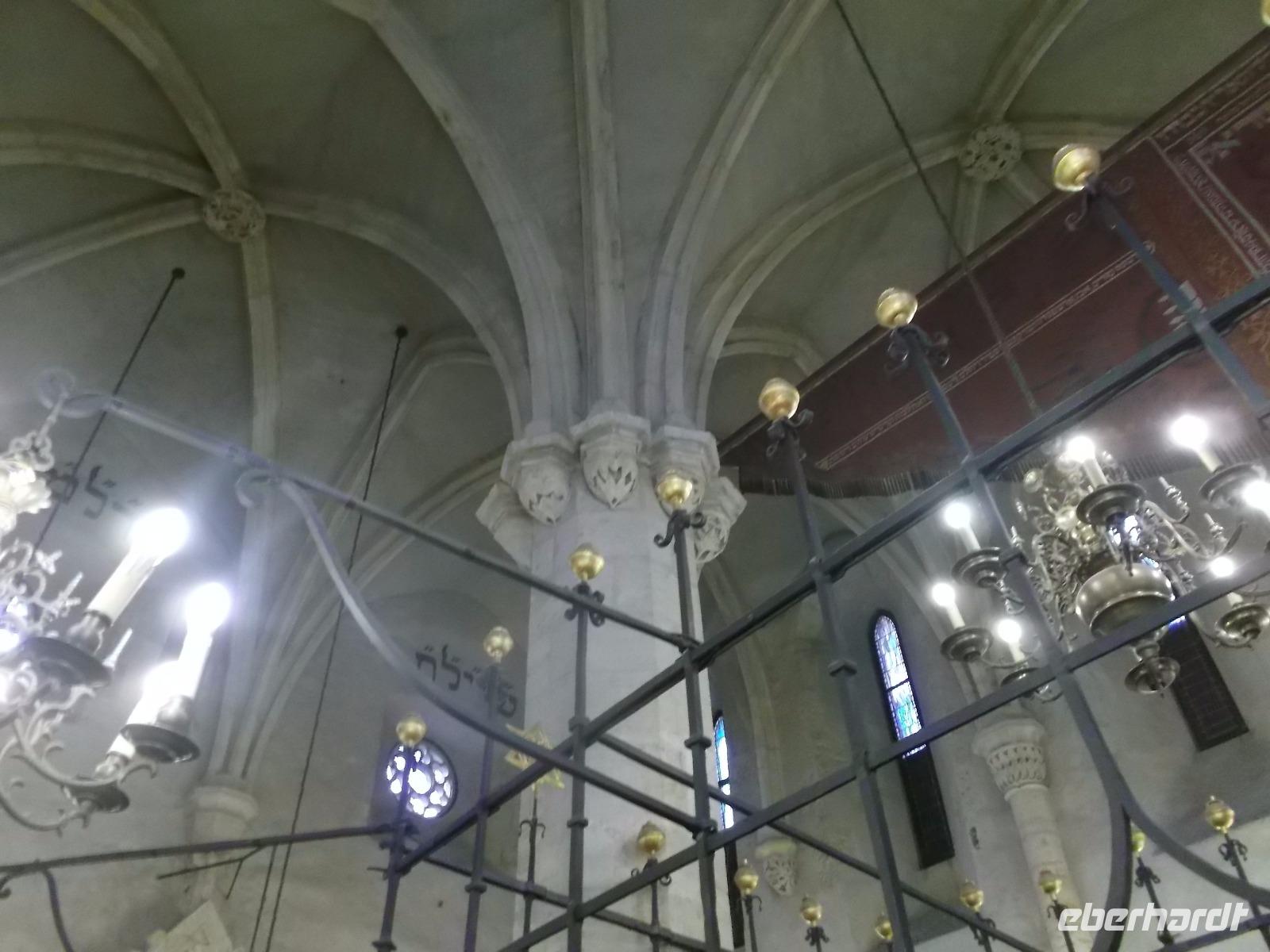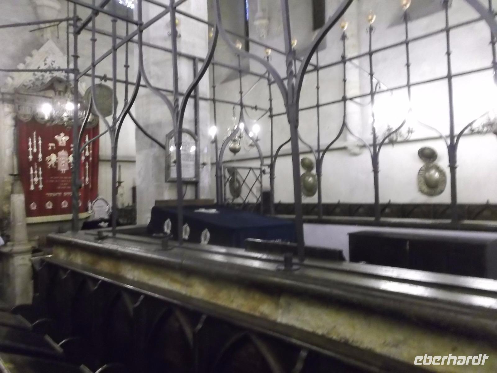 Bis heute hat er sich kaum verändert, behielt etwa seine mittelalterlichen Ausmaße. Da für die jüdischen Friedhöfe ab einem bestimmten Zeitraum keine Erweiterung mehr geduldet wurde, musste die wachsende Bevölkerung hier ihre Verstorbenen in bis zu zwölf Schichten übereinder begraben, was unter anderem eine ungewöhnliche Häufung von Grabsteinen zur Folge hatte. Berühmte Rabbiner liegen hier begraben, unter anderem der legendäre Rabbi Löw, dem man Zauberkräfte zutraute und der den geheimnisvollen und gefährlichen Lehm-Mann „Golem" geschaffen haben soll - bis heute die bekannteste der Prager LegendenVom jüdischen Friedhof gingen wir noch in die „Altneu-Synagoge" - um die Mitte des 13. Jahrhunderts in frühgotischem Stil erbaut und bis heute das religiöse Zentrum der Prager Juden. Allen Unbilden hat das nahezu orginal bewahrte Bauwerk getrotzt und ist damit nicht nur einer der ältesten Bauten überhaupt in Prag, sondern gleichzeitig die älteste unzerstört erhaltene Synagoge in ganz Europa. Um den ungewöhnlichen Namen ranken sich auch wieder Legenden, in denen Engel und Zauberkräfte die Hand im Spiel haben und die gar nicht so unwahrscheinliche Geschichte, dass man beim Bau der Fundamente Rester einer noch älteren Synagoge gefunden habe und so die „neue" auf der „alten" errichten musste...