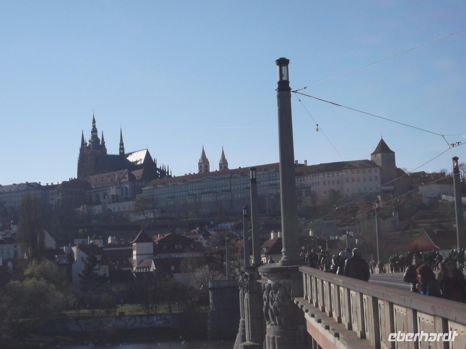Von hier aus, einem schmalen Durchgang neben der Marien- oder Teynkirche, setzten wir unseren Weg über den Altstädter Ring am Rathaus vorbei fort und folgten dem alten „Königsweg", der uns schließlich durch verschiedenste schmale, aber durch viele Souvenirgeschäfte, Gaststätten und Touristen belebte Altstadtgassen bis zur Karlsbrücke führte. Diese älteste erhaltene Brücke über die Moldau stammt aus dem 14. Jh. und verbindet die Altstadt mit dem Stadtteil „Kleinseite" zu Füßen der gewaltigen Prager Burg Hradschin.