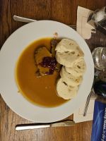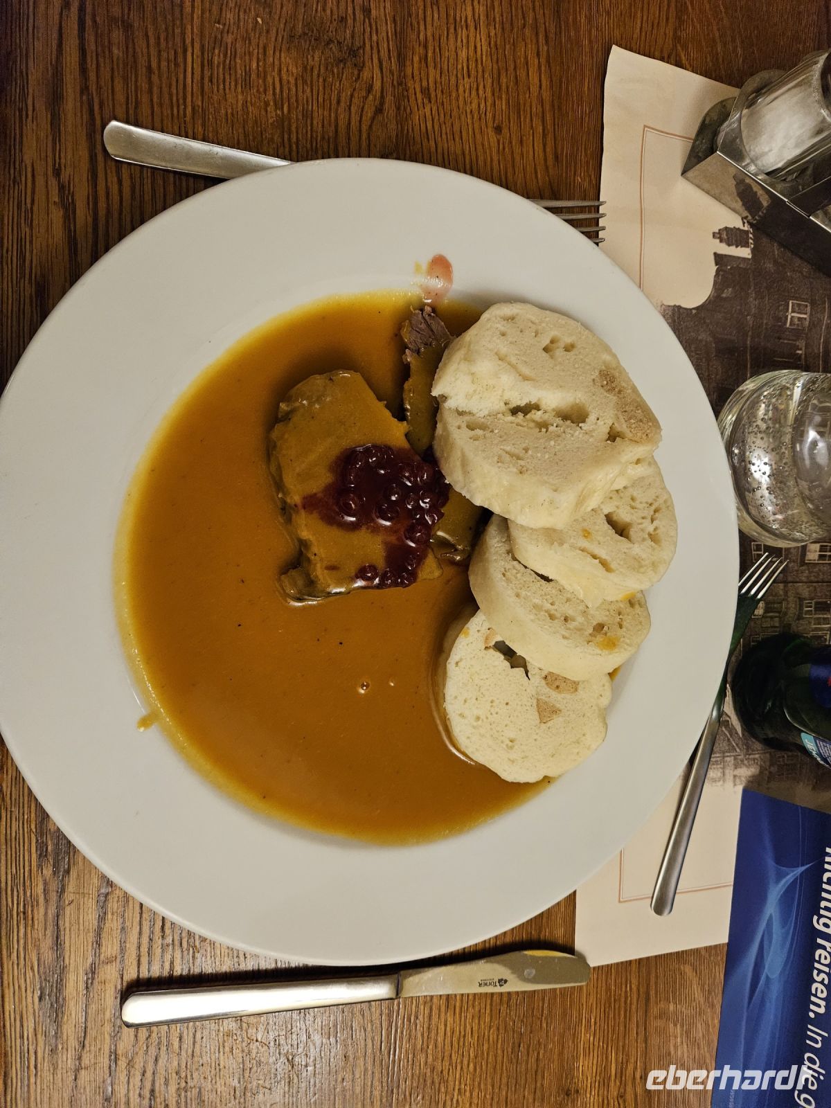 Um 18.30 Uhr trafen wir uns wieder an der Hotelrezeption, um gemeinsam zu der tschechischen Gäststätte „U Medvidku“ zu gehen. Als Vorspeise gab es hier scharfe Würstchen im Teigmantel, als Hauptgericht konnte man zwischen vier deftigen Speisen wählen – zur Auswahl stand unter anderem das Rinderbraten-Gericht „Scickova“, der gemeinsam mit Semmelknödel und einer cremigen Gemüsesauce aus Karotten und Sellerie serviert wird - und als Dessert gab es Apfelstrudel mit Vanilleis und Sahne. Gut gestärkt traten wir den 1 Kilometer langen Rückweg zum Hotel an.
