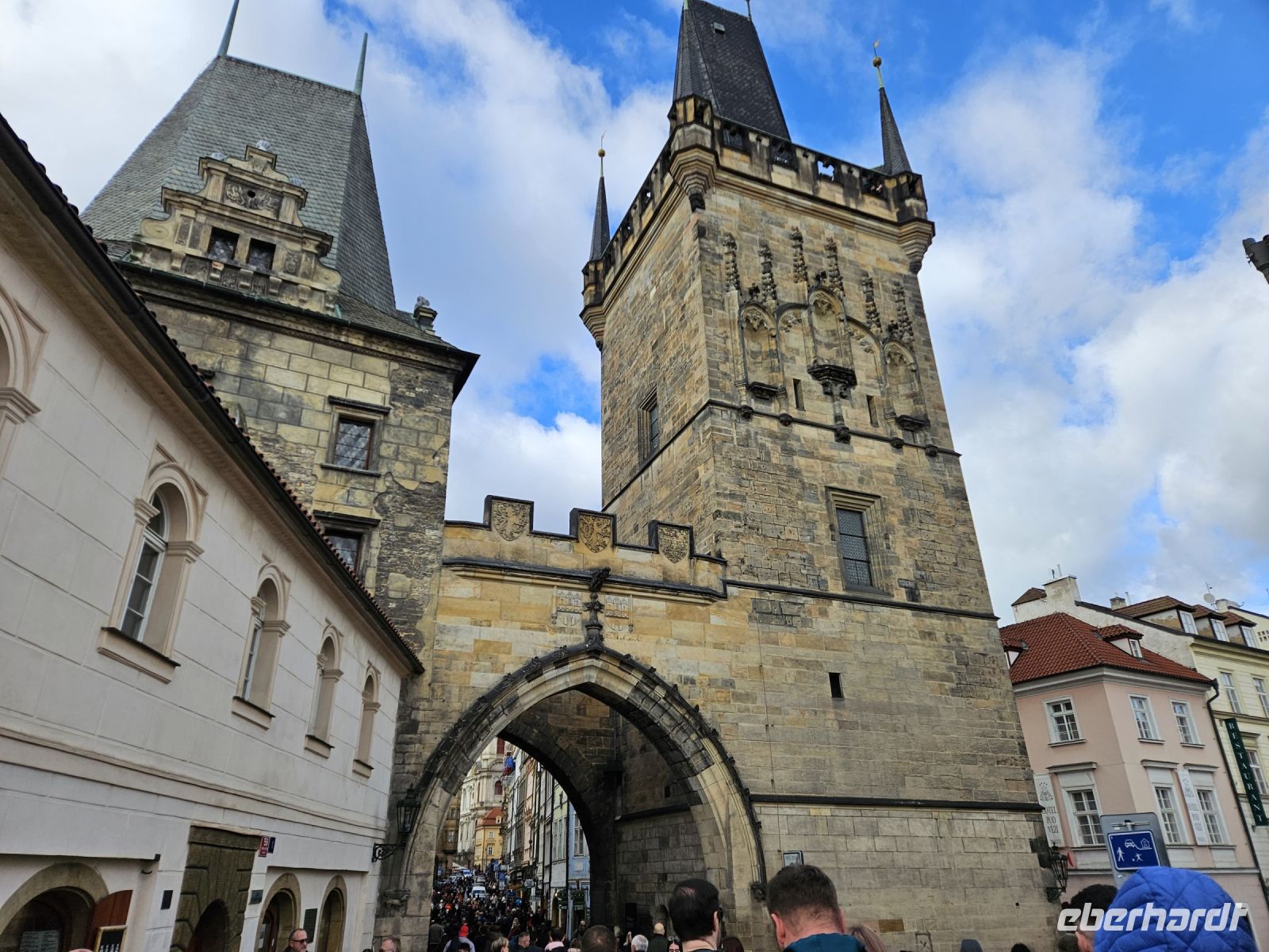 Nachdem wir Euro in tschechische Kronen getauscht und für die Teilnehmer unter 65 Jahren Nahverkehrstickets besorgt hatten (wenn man über 65 Jahre alt ist darf man in Prag kostenfrei mit öffentlichen Verkehrsmitteln fahren), führte uns der Weg weiter zur weltberühmten Karlsbrücke. Eng drängten sich hier die Menschen und das Durchkommen war nicht ganz so einfach.