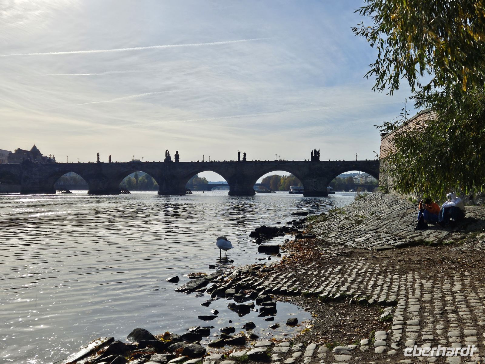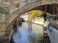 Nach dem Hotelfrühstück trafen wir am Morgen wieder mit Irena. Sie schlug vor den Stadtrundgang dort fortzusetzen, wo wir gestern aufgehört hatten und so fuhren wir mit der Straßenbahnlinie Nr. 15 wieder auf die Prager Kleinseite. Hier schlenderten wir über die Kampa-Insel, von der sich ein besonders schöner Blick auf die Karlsbrücke bietet. Hier befindet sich auch das Franz Kafka Museum, das sich mit dem Leben und Schaffen des Prager Schriftstellers befasst. Der Moldauarm Certovka (Teufelsbach) trennt die Insel Kampa von der Kleinseite. Unter dem Motto „Prager Venedig“ werden in dieser Ecke spezielle Schifffahrten angeboten. Wir überquerten ein weiteres Mal die Karlsbrücke. Diesmal spazierten hier etwas weniger Menschen, als am ersten Tag und diesmal bot sich uns ein besonders guter Blick auf die Statue des heiligen Johannes von Nepomuk.