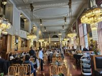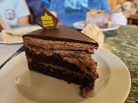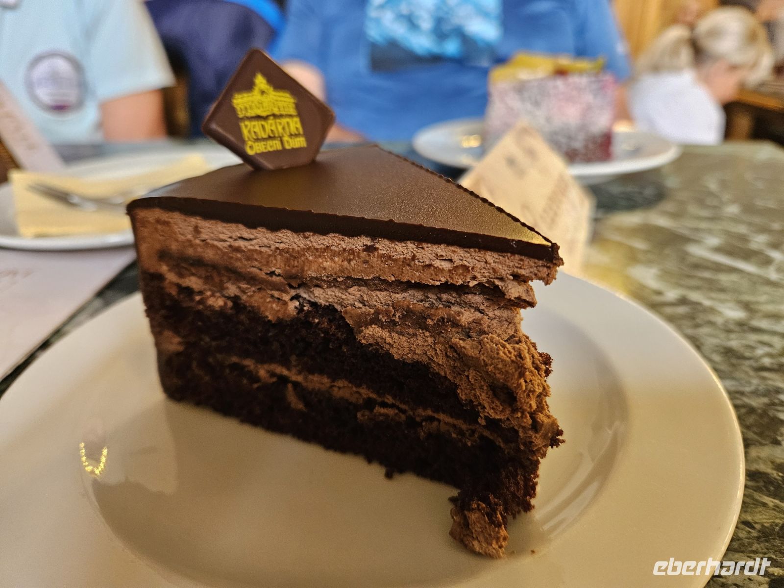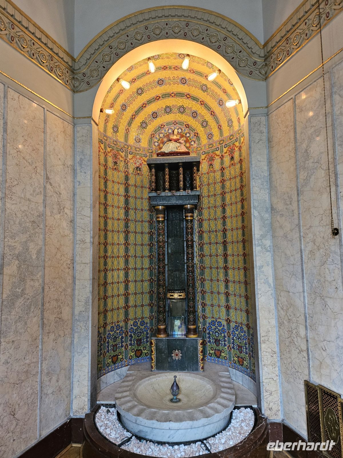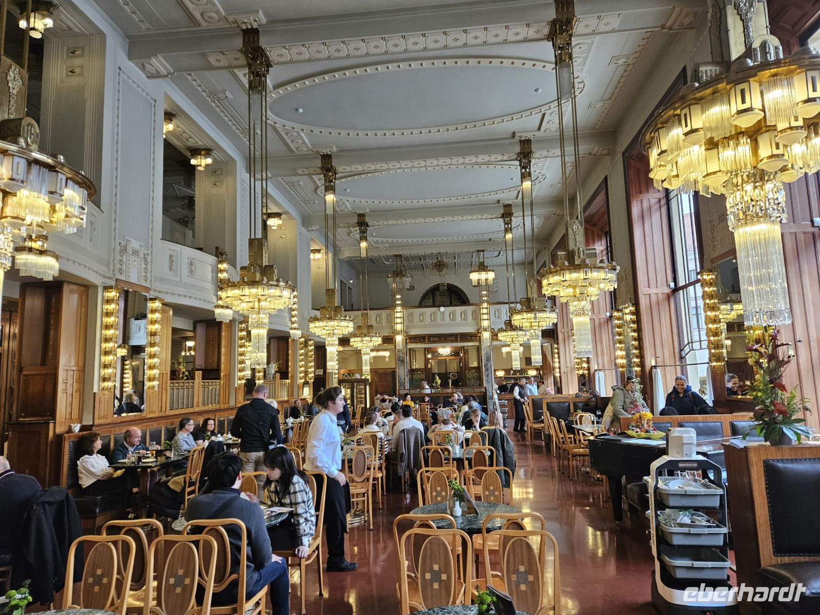 Im Anschluss kehrten wir in das Gemeindehaus-Café ein, das ebenfalls mit seiner Innenausstattung besticht: riesige Kronenleuchter hängen von der Decke und am Ende des Cafés plätschert ein kleiner Brunnen. Bei Kaffee oder Tee und einem großen Kuchenstück, das man aus einer Rollvitrine auswählen konnte, genossen wir den Nachmittag.