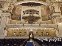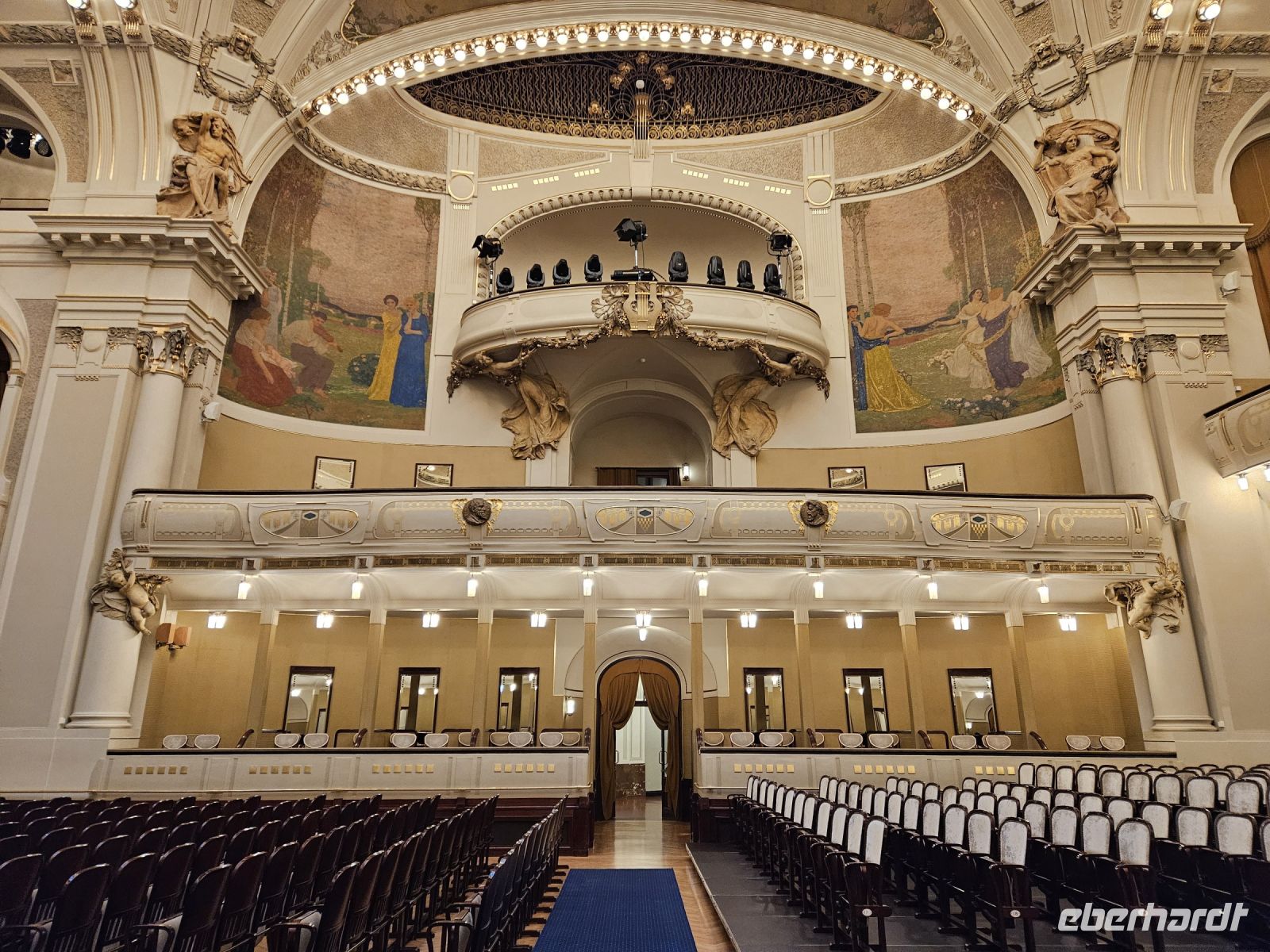 Unser Stadtrundgang mit Irena endete direkt vor dem Gemeindehaus. An der Stelle des mittelalterlichen Königshauses erbaute die Gemeinde Prag ein pompöses Gemeindehaus nach Plänen von Osvald Polivka und Antonin Balsanek. Nur im Rahmen einer Führung hat man die Möglichkeit die Räumlichkeiten des Gemeindehauses von innen zu besichtigen. Aufgrund unserer kleinen Gruppengröße mussten wir an der englischsprachigen Führung teilnehmen – an der Kasse wird aber auf Nachfrage ein ausführlicher Kommentar in deutscher Sprache ausgehändigt. Das Gemeindehaus wurde im Jugendstil erbaut und viele berühmte tschechische Künstler – wie Josef Vaclav Myslbek, Mikolas Ales oder Alfons Mucha - haben an der Innenausstattung mitgewirkt. Im Smetana Saal finden sich beispielsweise die allegorischen Statuen des tschechischen Künstlers Karel Spillar.
