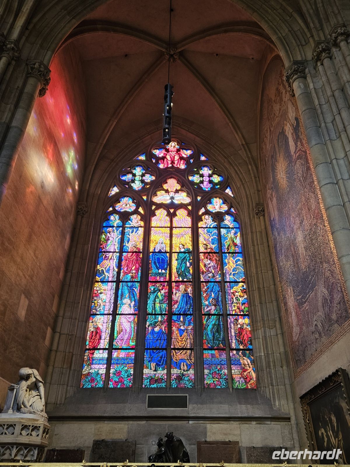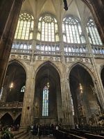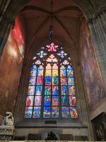 Die Mittagspause verbrachten wir in den Restaurant „Vikarka“. Als kleine Zwischenmahlzeit ist hier die Gulaschsuppe zu empfehlen. Frisch gestärkt stellten wir uns kurz nach 12.00 Uhr in der Schlange zum Veitsdom an. Wir kamen aber schnell voran und schon nach wenigen Minuten, eröffneten sich vor uns die imposanten Räumlichkeiten des Veitsdoms: die Decken reichten mehrere Meter in die Höhe und durch die Buntglasfenster wurde die Kathedrale in warmes, gedimmtes Licht getaucht. Besonders ins Auge stechen die von dem berühmtesten tschechischen Jugendstilmaler Alfons Mucha gestalteten Kirchenfenster.
