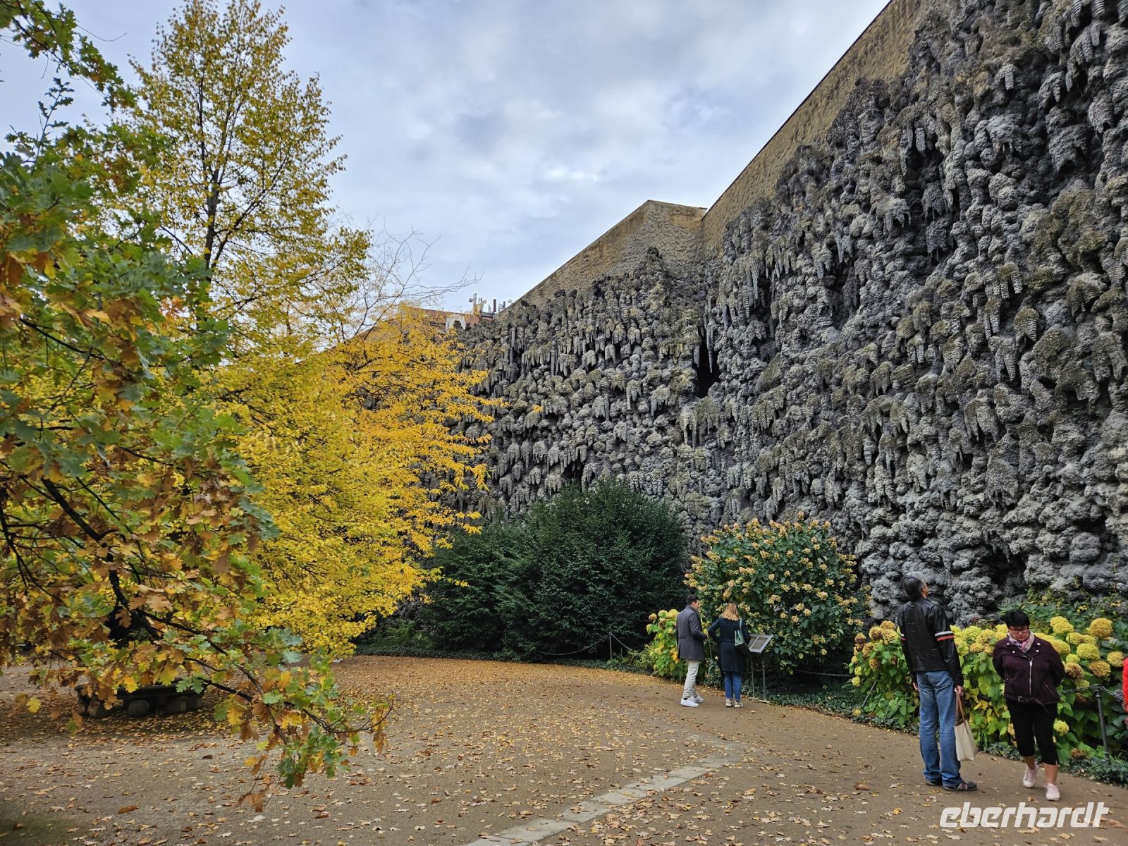Auch die Grabstätten von Kaiser Karl IV. und Rudolf II. sind hier zu besichtigen. Von der Prager Burg – auch Hradschin genannt – bot sich uns ein wunderschöner Blick auf die tschechische Stadt. Bei dieser Aussicht ist mehr als zu verstehen, warum Prag auch gerne als „Stadt der 100 Türme bezeichnet wird. Der Weg führte uns nun bergab zu der Prager Kleinseite In diesem Viertel sind auch die internationalen Botschaften ansässig: die italienische Botschaft befindet sich im großen Schloss Thun-Hohenstein und die amerikanische Botschaft im Schloss Schönborn. Die deutsche Botschaft befindet sich im Lobkowicz-Palais. Am 30.09.1989 verkündete Der Bundesaußenminister der DDR – Hans-Dietrich Genscher – auf dem Balkon der Deutschen Botschaft in Prag, die Ausreisegenehmigung für Tausende DDR-Flüchtlinge. Somit ist dieser Ort auch von immenser historischer Bedeutung. Unser Rundgang mit Irena endete am Palais Wallenstein. Bis 1945 befand sich der Palast im Besitz der Nachkommen des kaiserlichen Reichsfürsten Albrecht von Wallenstein. Sein glorioser Aufstieg, der politische Fall und seine Ermordung durch den Kaiser wurde von Friedrich Schiller in der Dramen-Trilogie „Wallenstein“ aus dem Jahr 1799 geschildert. Heute ist der Palast Sitz des Senats des Parlaments der Tschechischen Republik. Der Wallenstein-Garten ist nur noch bis Ende Oktober geöffnet und wir hatten noch das Glück die Pfauen auf dem Gelände stolzieren zu sehen und die Bronzestatuen des niederländischen Bildhauers Adriaen de Vries zu bewundern. Auf der sogenannten „Schwarzen Wand“ sind unzählige kleine Grotten, aber auch Gesichter und Tiere, wie Frosche und Schlangen zu erkennen.