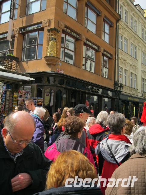 Fr 2o.04.12 Recht ausgeruht tafen wir unsere örtliche RL Jana,die uns vom Hotel abholte.Zuerst schlenderten wir zum Nationalmuseum und der Wenzelsplatz lag lang ausgesteckt vor uns.Wir liefen in Richtung Pulverturm und von dort fast auf dem alten Krönungsweg zum Altstädter Ring,-dem vielleicht schönsten Platz Prags-.Seit dem Hochmittelalter Schauplatz großer Ereignisse- Ritterspiele,Hinrichtungen,religiöse Veranstaltungen,Hochzeiten,Festzüge und Treff unzähliger neugieriger Touristen.Sie finden sich dort kurz vor Stundenschlag ,ein um zum Rathausturm zu Schauen. "Der Tod läutet das Glöckchen, dreht die Sanduhr, die Zeit verrinnt.Die 12 Apostel u.Jesus Cristus erscheinen.Der Türke schüttelt den Kopf-vorbei ist vorbei-und die Türchen schließen sich bis zur nächsten Stunde.Die Astronomische Uhr bietet seit mehr als 500 Jahren dies reißvolle Schauspiel.Nun endlich Mittagspause.Am J.Hus Denkmal treffen wir wieder zusammen und schauen kurz in der Josefstadt vorbei,um einen kleinen Einblick vom ehem. jüdischen Getto Prags zu bekommen.Über die Pariser Prachtstr.erreichen wir unsere Schiffsanlegestelle Cech-Brücke.Von der Moldau aus haben wir einen herrlichen Blick auf Prag und können uns dabei noch ausruhen.Der Wenzelsplatz empängt uns wieder und wir lassen den Abend in einen Lokal im histo.Gewand ausklingen.