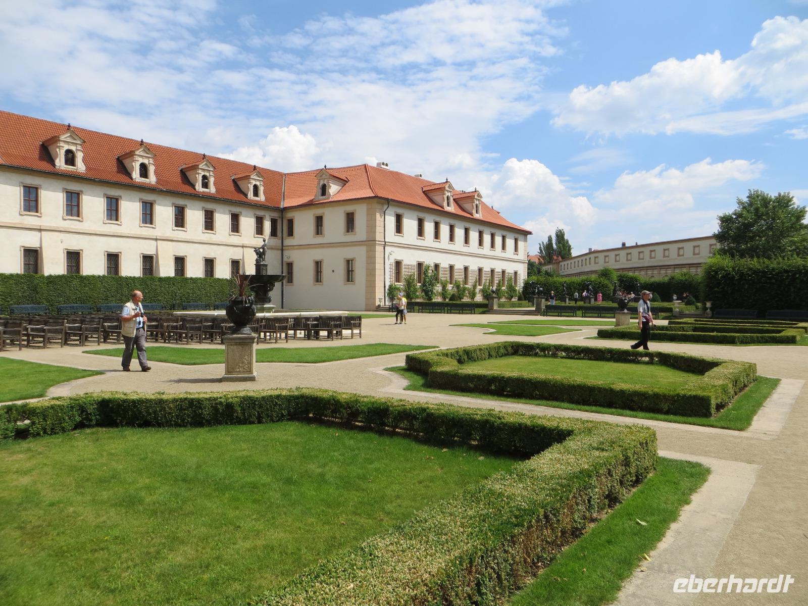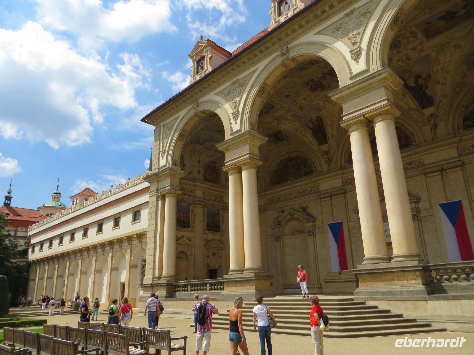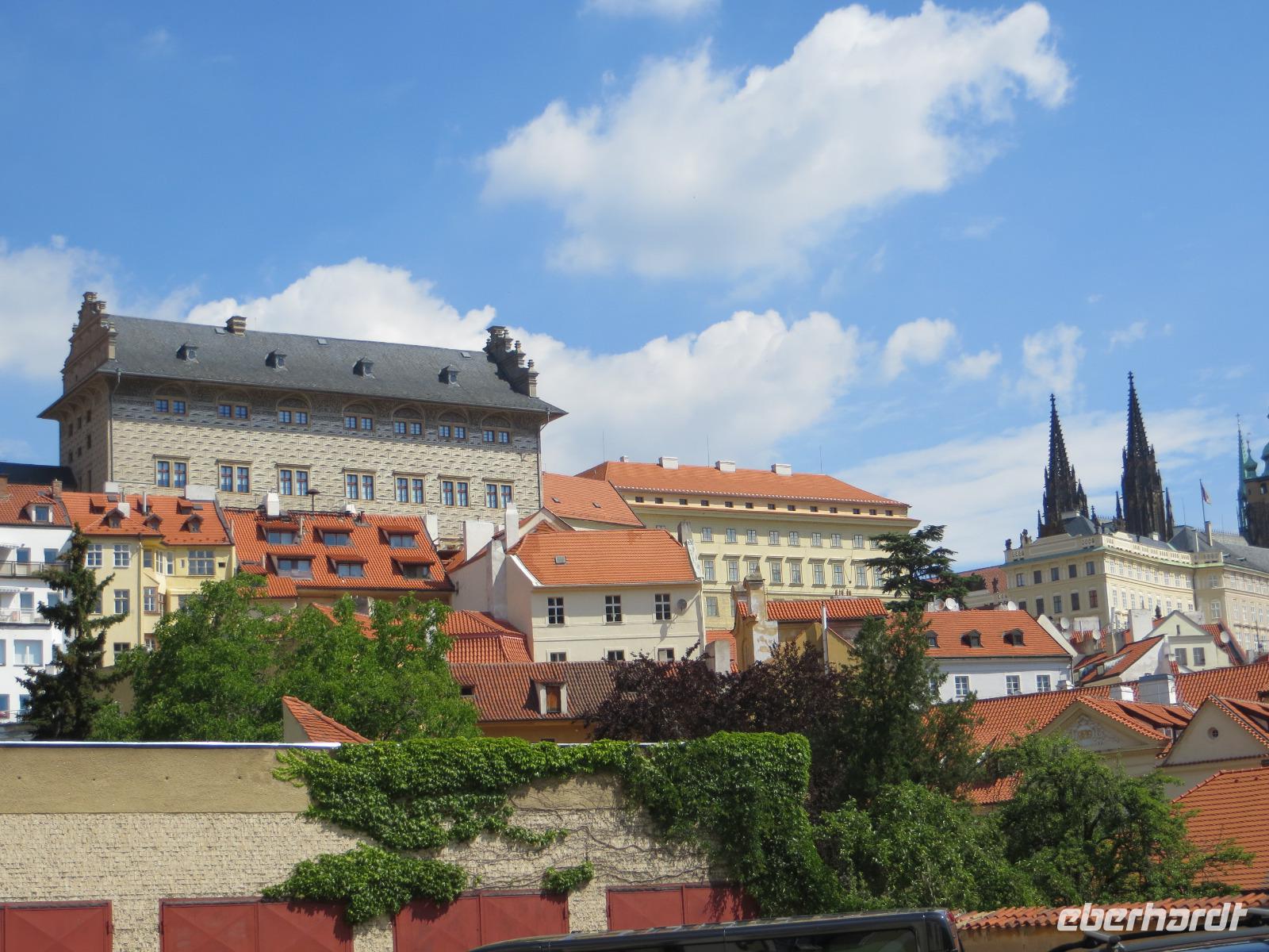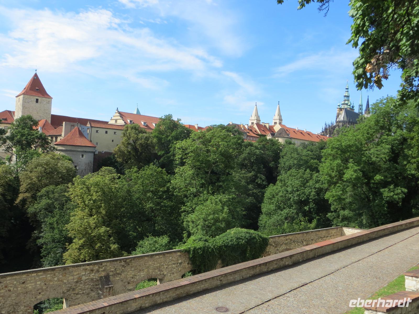 Eigentlich kann man vom Hotel Diplomat gut zu Fuß durch ein Prominentenwohngebiet laufen. Aber der Tag könnte lang werden, weshalb wir mit der Straßenbahn fuhren und bereits vor zehn Uhr an den Königlichen Gärten um Einlass (Sicherheitskontrolle) begehrten. Die einst gesperrte Parkanlage im englischen Stil gestattet nun Blick auf Renaissancebauten im Park und Ausblicke auf den Hradschin. Auf dem Hradschin waren wir natürlich nicht die Einzigen; an einem Freitag wie diesem, waren aber wohl die tschechischen Tagesausflügler weniger. So war die Schlange am St. Veits-Dom in kurzer Zeit zu bewältigen, die Palastsäle schnell erreicht, auch die romanischen Gewölbe der ältesten Kirche in Prag fast besinnlich zu durchdringen und das Goldene Gäßchen gefahrlos zu sehen.