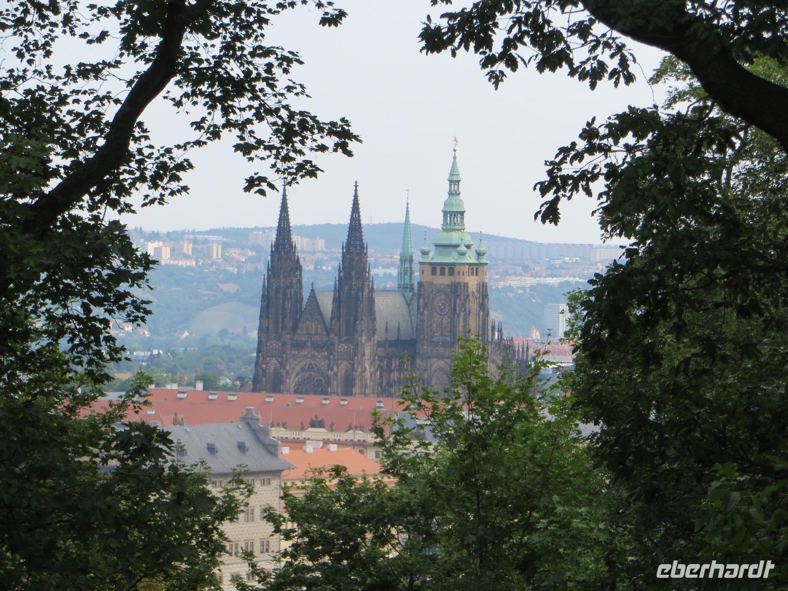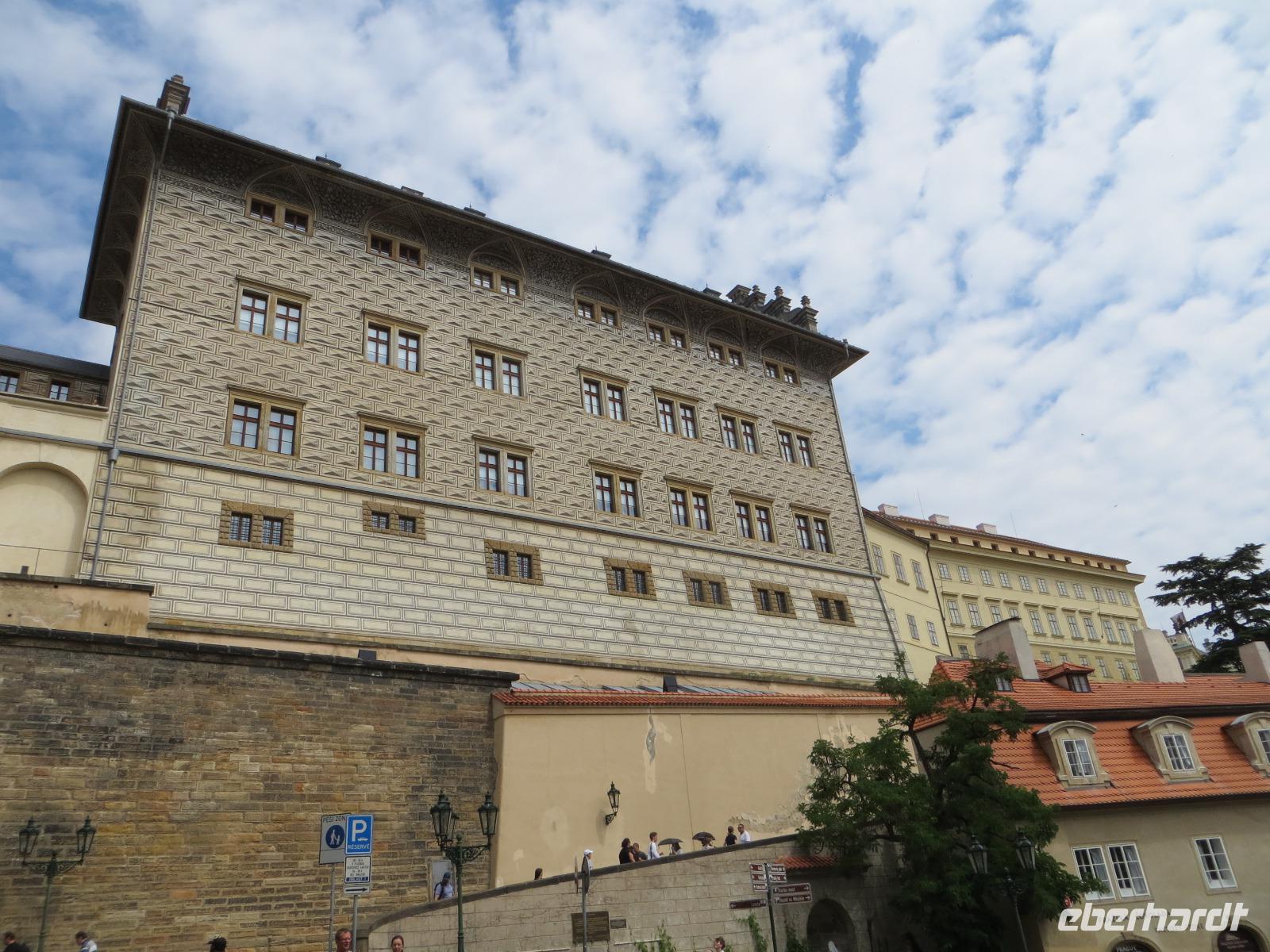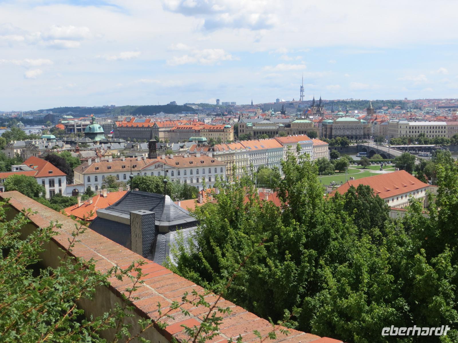 Eigentlich kann man vom Hotel Diplomat gut zu Fuß durch ein Prominentenwohngebiet laufen. Aber der Tag könnte lang werden, weshalb wir mit der Straßenbahn fuhren und bereits vor zehn Uhr an den Königlichen Gärten um Einlass (Sicherheitskontrolle) begehrten. Die einst gesperrte Parkanlage im englischen Stil gestattet nun Blick auf Renaissancebauten im Park und Ausblicke auf den Hradschin. Auf dem Hradschin waren wir natürlich nicht die Einzigen; an einem Freitag wie diesem, waren aber wohl die tschechischen Tagesausflügler weniger. So war die Schlange am St. Veits-Dom in kurzer Zeit zu bewältigen, die Palastsäle schnell erreicht, auch die romanischen Gewölbe der ältesten Kirche in Prag fast besinnlich zu durchdringen und das Goldene Gäßchen gefahrlos zu sehen.