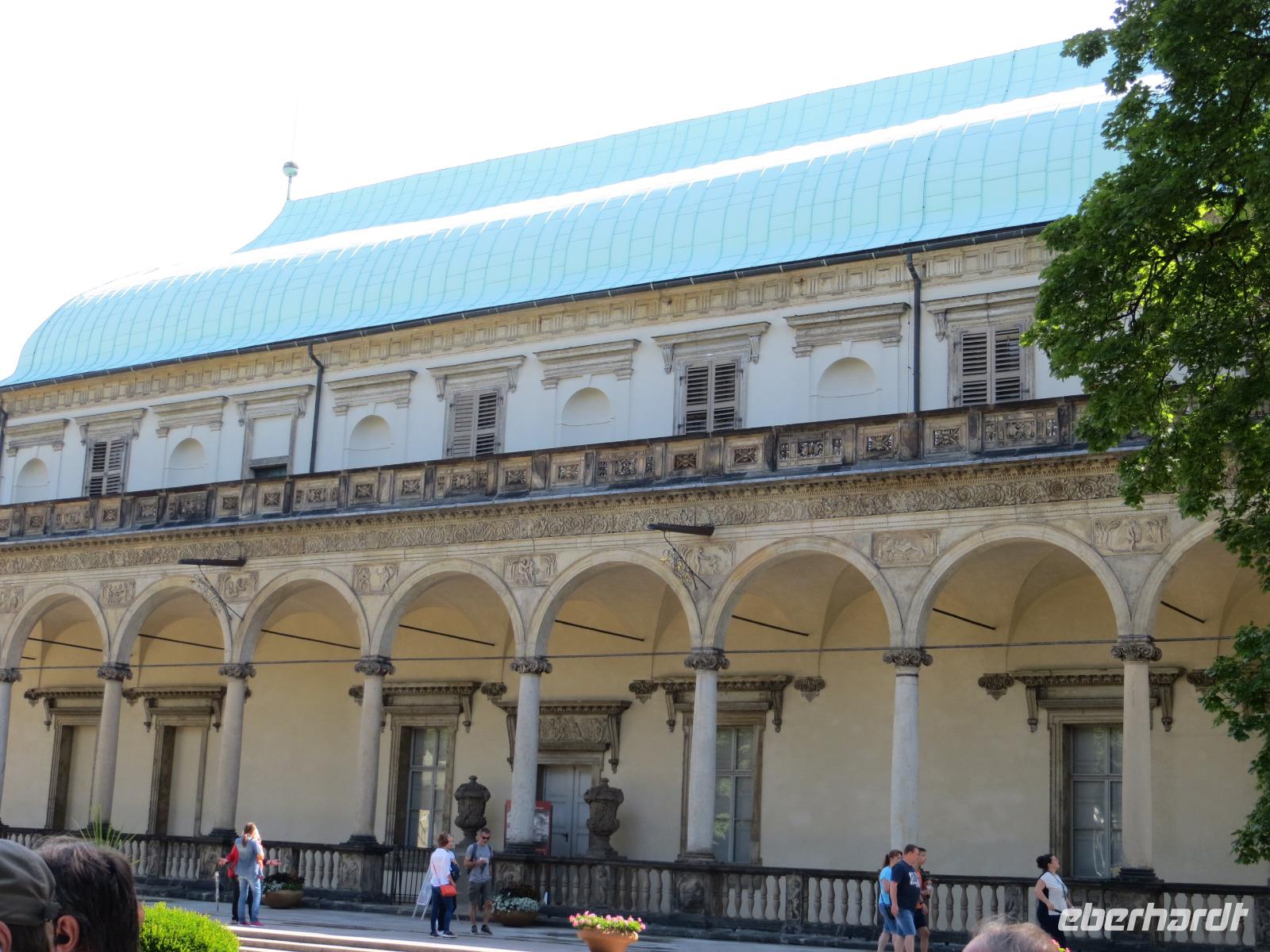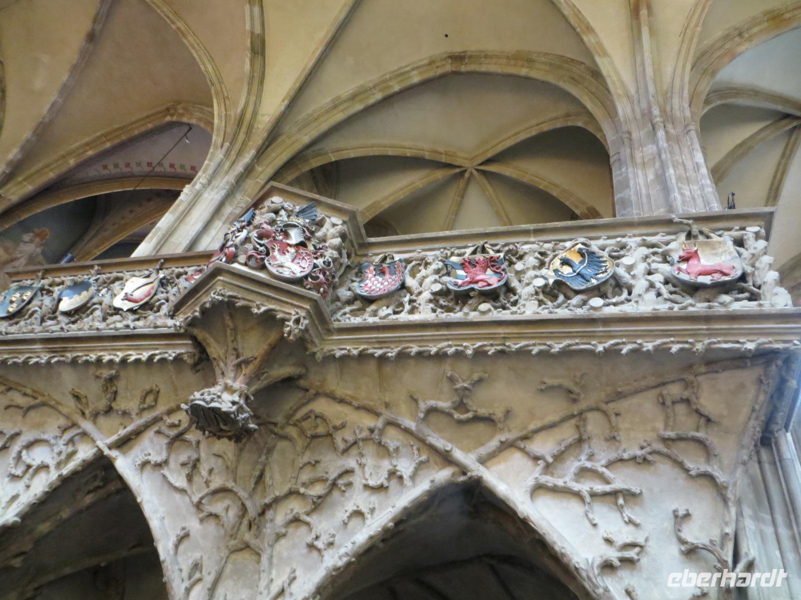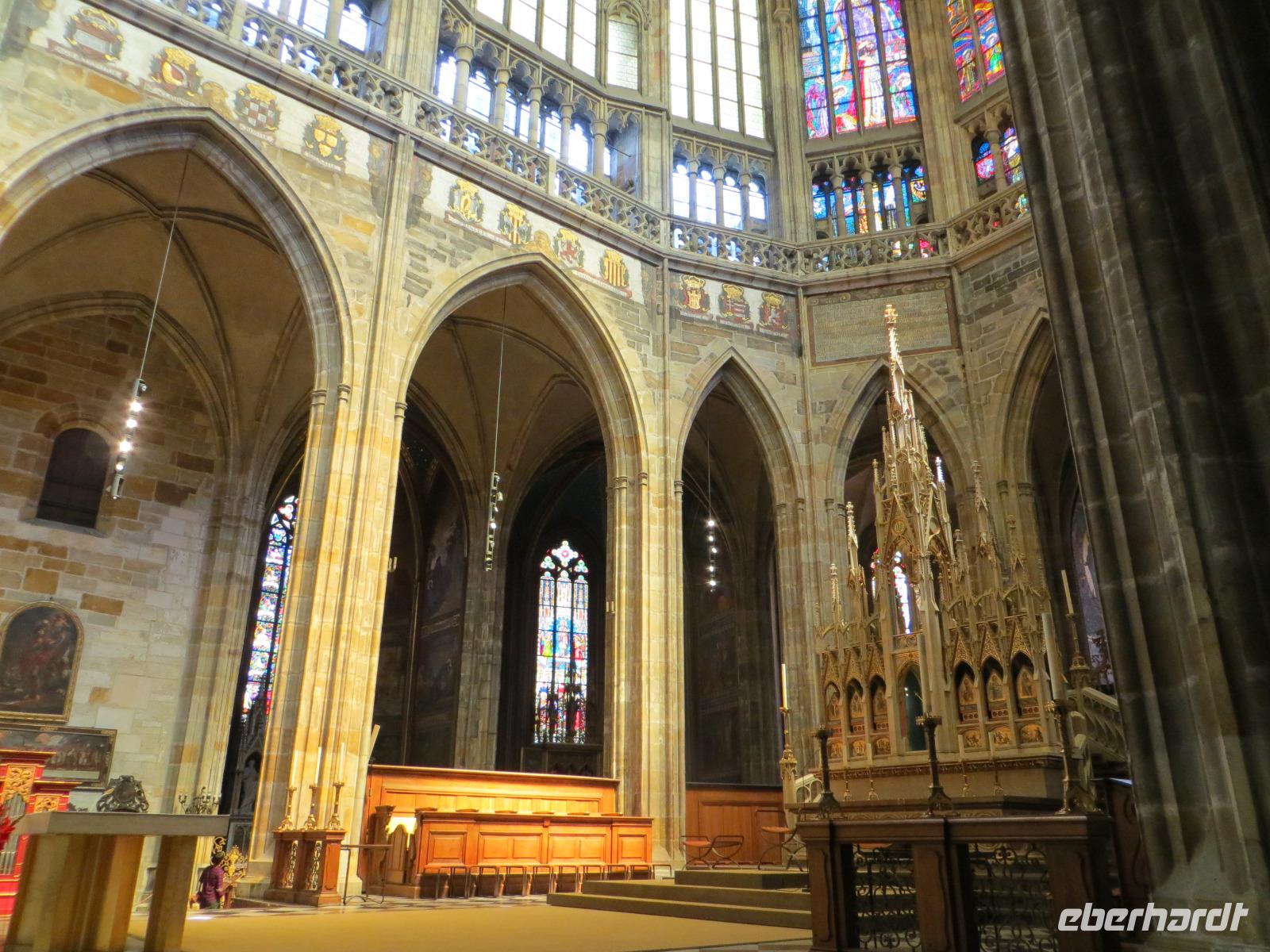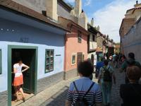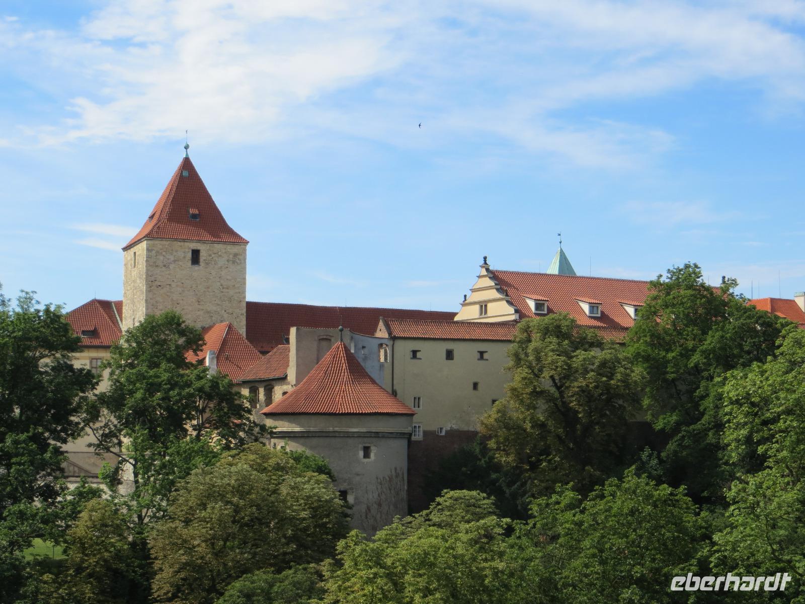 Eigentlich kann man vom Hotel Diplomat gut zu Fuß durch ein Prominentenwohngebiet laufen. Aber der Tag könnte lang werden, weshalb wir mit der Straßenbahn fuhren und bereits vor zehn Uhr an den Königlichen Gärten um Einlass (Sicherheitskontrolle) begehrten. Die einst gesperrte Parkanlage im englischen Stil gestattet nun Blick auf Renaissancebauten im Park und Ausblicke auf den Hradschin. Auf dem Hradschin waren wir natürlich nicht die Einzigen; an einem Freitag wie diesem, waren aber wohl die tschechischen Tagesausflügler weniger. So war die Schlange am St. Veits-Dom in kurzer Zeit zu bewältigen, die Palastsäle schnell erreicht, auch die romanischen Gewölbe der ältesten Kirche in Prag fast besinnlich zu durchdringen und das Goldene Gäßchen gefahrlos zu sehen.
