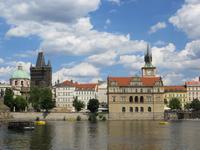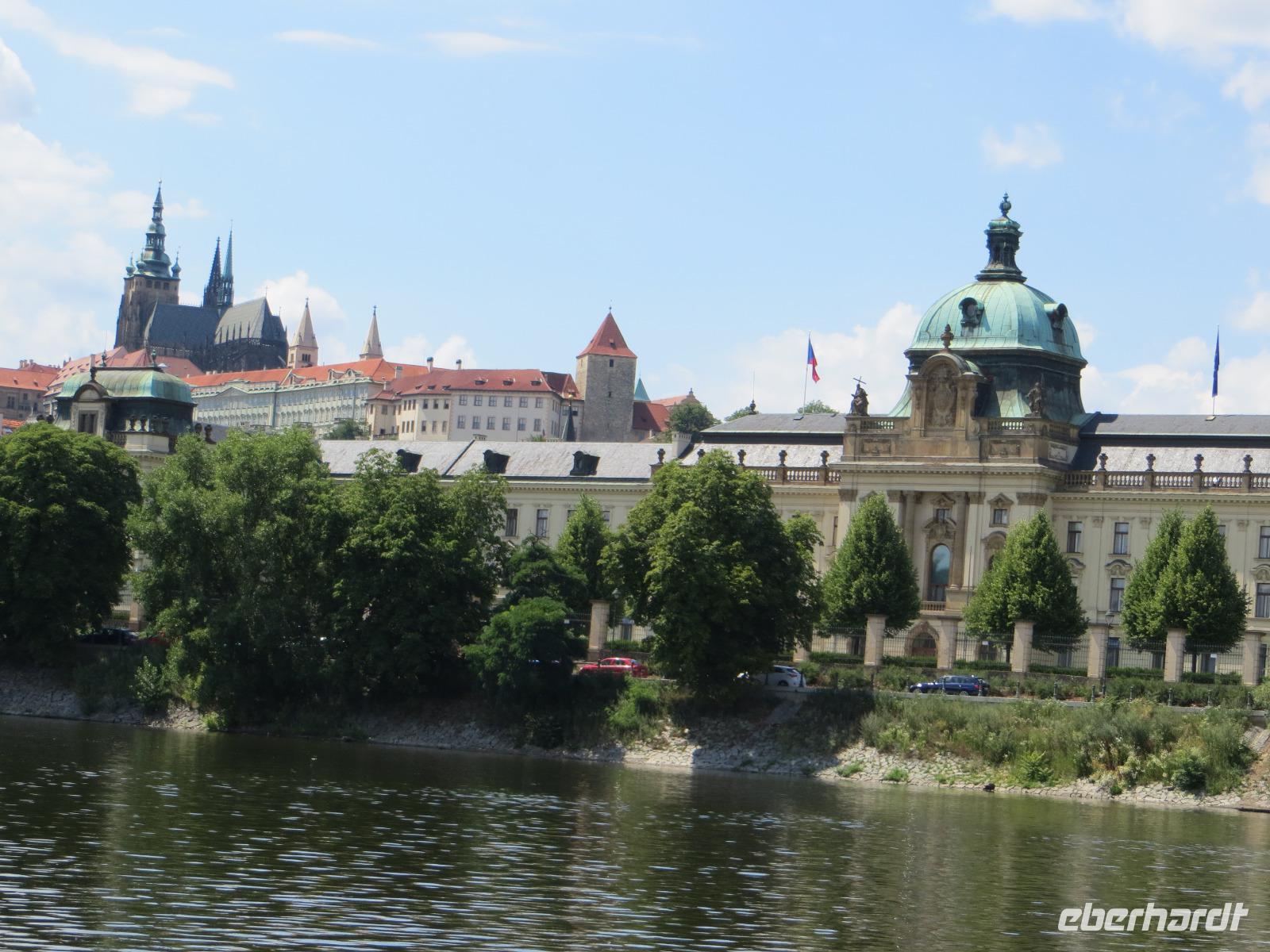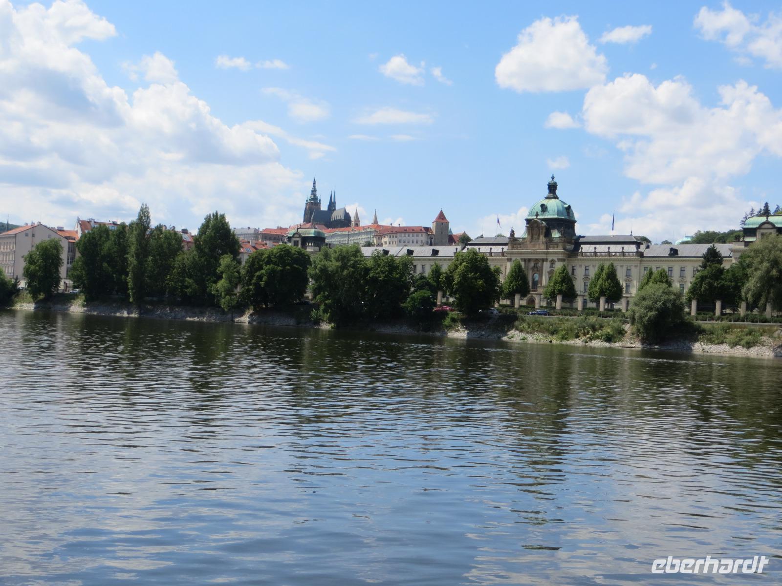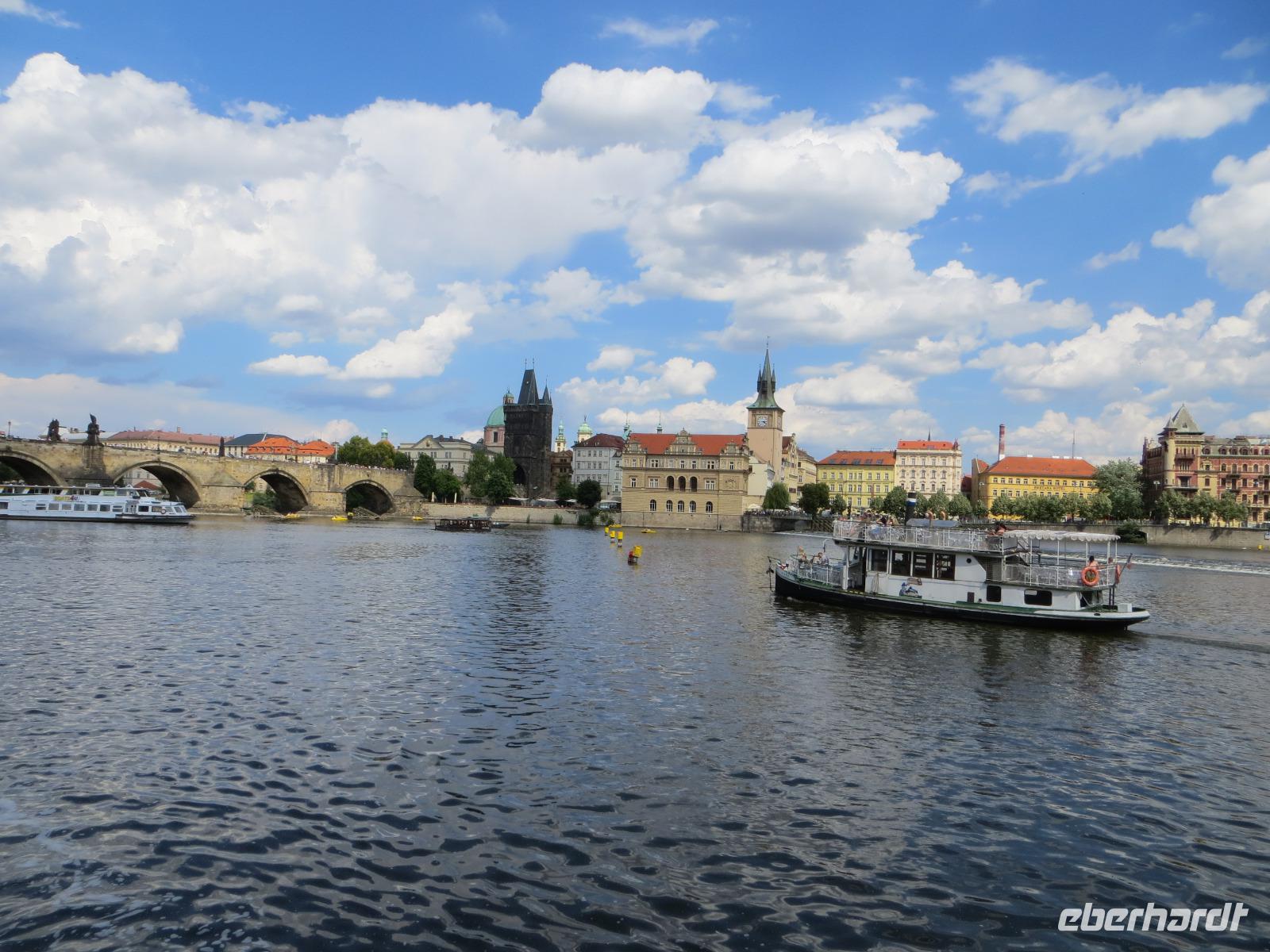 Pünklich fünfzehn Uhr legte das Schiff ab - machte folglich nochmals ein Anlegemanöver - dann waren wir alle komplett. Wir fuhren bis zum Wehr nahe der Kampa-Halbinsel und vis-a-vis des Smetana-Hauses, wendeten und fuhren moldauabwärts Richtung Florence. Wider der Wettervorhersage blieb es trocken. Bis zum fakultativen Abendprogramm war noch Zeit, zum Beispiel für einen Besuch im naheliegenden Jüdischen Viertel Josefov, wo ein Rundgangsticket den Besuch mehrerer Synagogen und des jüdischen Friedhofs ermöglicht.