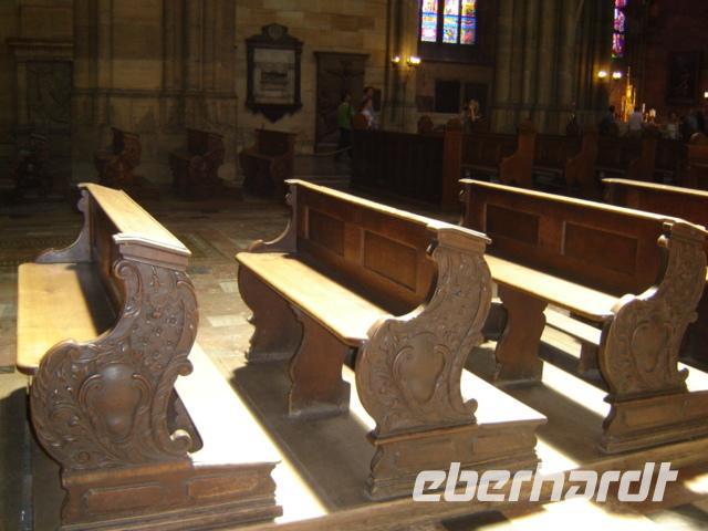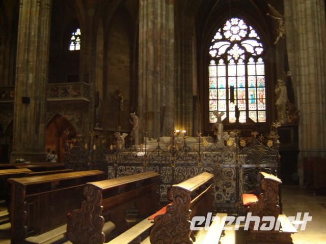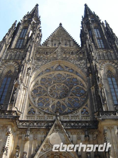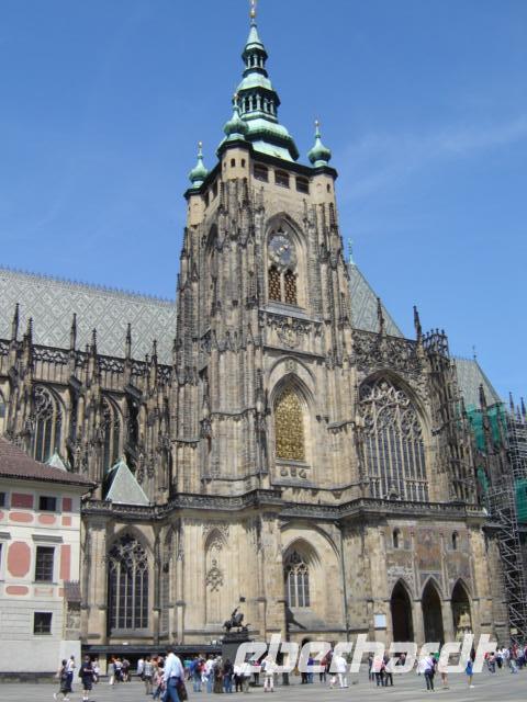 Trotz, dass wir die Braut in ihrem Hochzeitskleid nicht sehen konnten, brachen wir mit heiterer Stimmung auf zum Wahrzeichen Prags, der Prager Burg (Hradschin). Das Wetter war traumhaft schön für einen Blick auf die Skyline der Moldaumetropole. Der St. Veits Dom besticht mit seiner überwältigenden Bauweise im Stil der Pralter Gotik. Die schönen Lichteinfälle durch die großen bunten Fenster im Jugendstil von Alfons Mucha schufen eine friedvolle Atmosphäre. Gefesselt hat uns Jana wieder mit ihrer Geschichte zum Heiligen Paulus, einer der zwölf Apostel, die am größten Fenster des Doms abgebildet sind. Ist es das Gesicht einer Frau oder eines jungen Mannes?