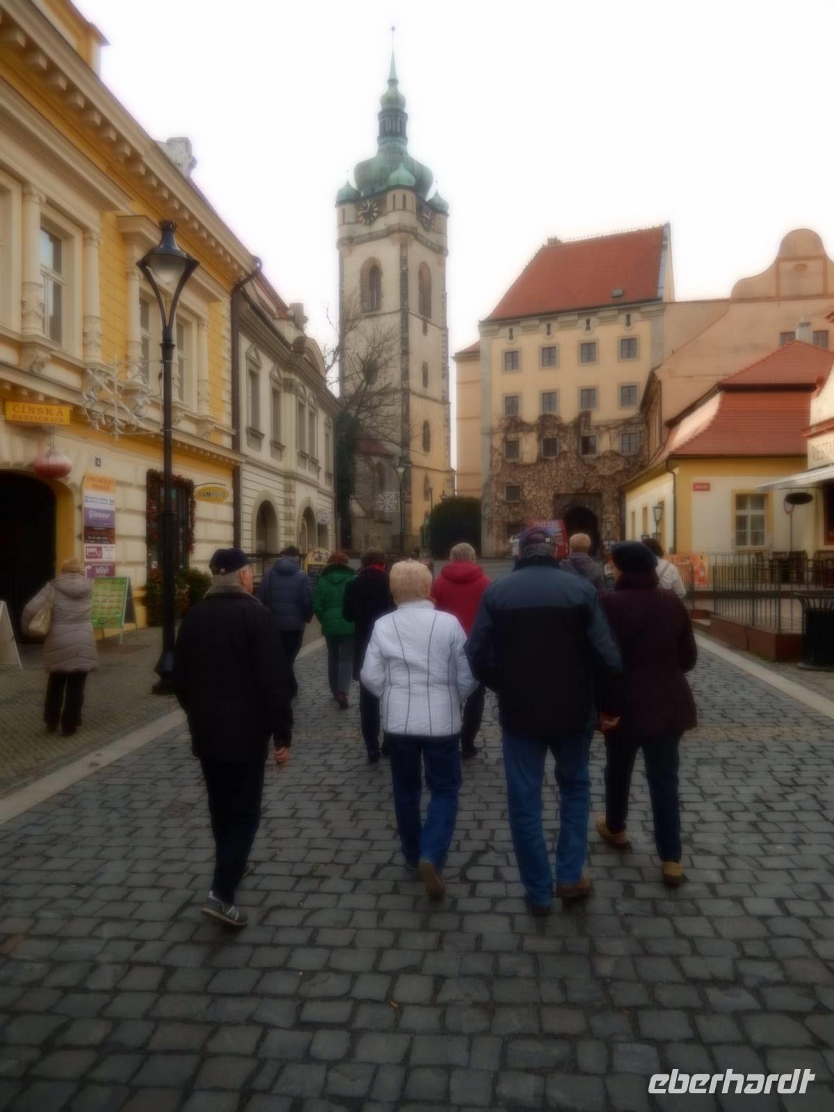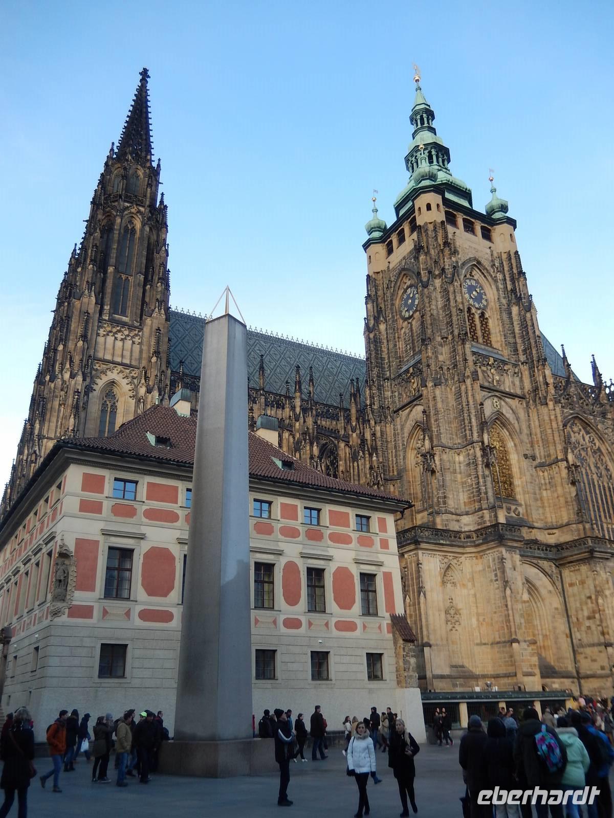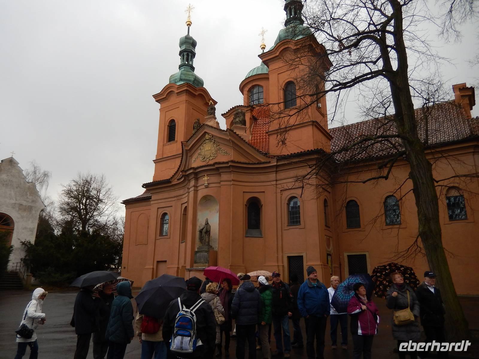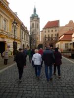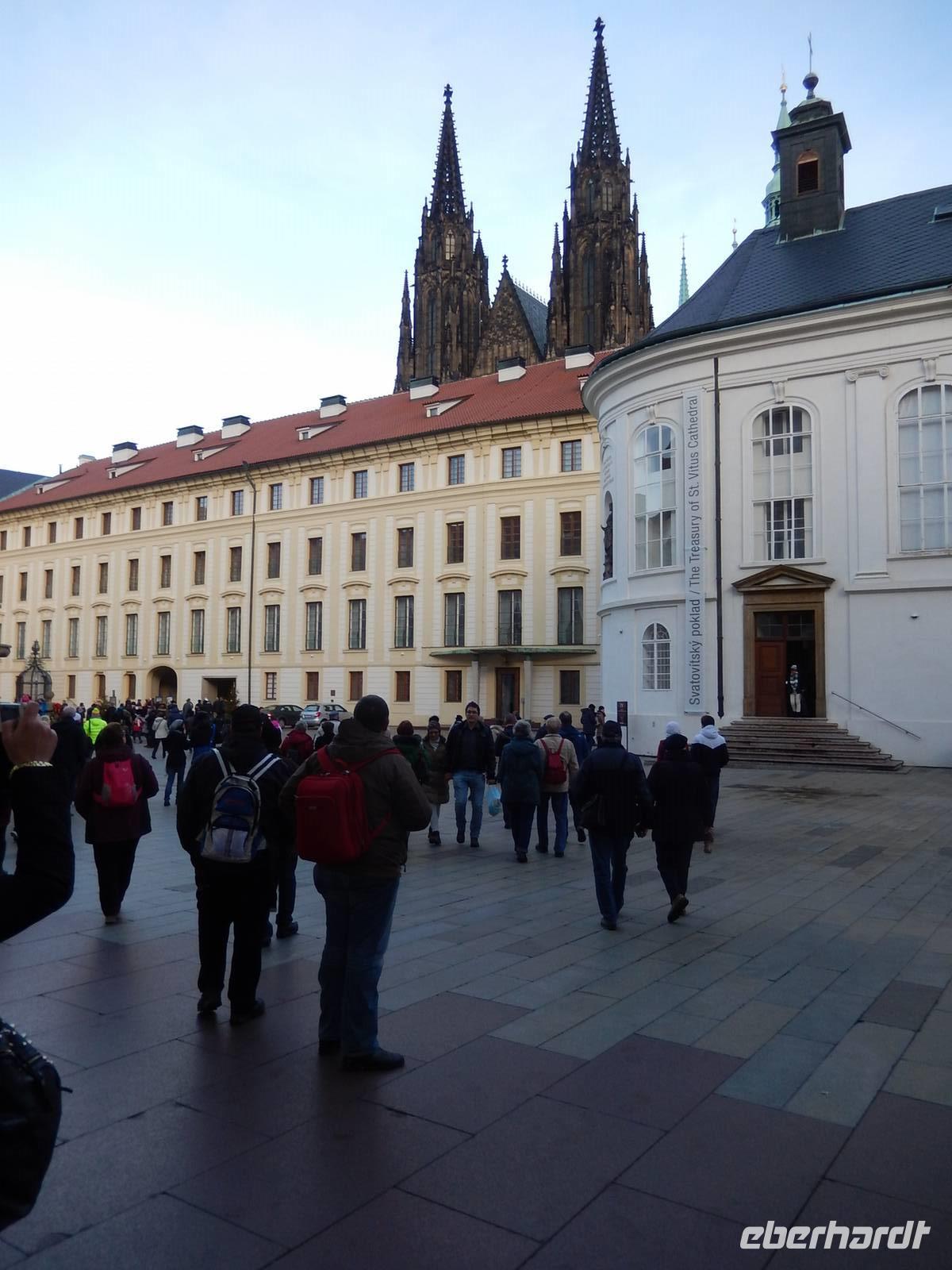 Nach gutem Schlaf wurden wir zum reichhaltigen Frühstücksbuffet mit Musik vom Klavier verwöhnt und konnten uns für den bevorstehenden anstrengenden Tag stärken. Das Buffet ließ keine Wünsche offen und gut gelaunt trafen wir uns in der Lobby und dort auf unsere freundliche Stadtführerin Irena, die uns die kommenden Tage begleiten sollte. Unsere erste Station war der Berg Petrin, den wir eigentlich mit einer Standseilbahn erreichen wollten. Leider wird diese im Moment gewartet und da uns noch einige Kilometer an diesem Tag erwarten sollten, haben wir uns für eine bequeme Anreise per Kleinbus-Taxi entschieden. Kurz vor 10 Uhr waren wir da und unsere erste Station hieß Spiegelsaal... So manch einer fühlte sich zurückversetzt in Kindertage beim Bewundern der Spiegelbilder. Wir haben herzlich gelacht! Und dann standen wir am Eiffelturm - richtig gelesen, am Eiffelturm. Ein wenig kleiner als das Original in Paris, aber für unsere Zwecke optimal. Zum einen handelt es sich dabei um eine Sehenswürdigkeit, die nicht zum Standardprogramm in Prag gehört udn zum anderen hat man von hier einen fantastischen Ausblick über Prag. So konnten wir auch ein paar schöne Fotos schießen. Einige von uns sparten sich dabei den Aufzug, der uns noch knarrenderweise nach oben gebracht hatte und spazierten die 299 Stufen wieder turmab. Eisiger Wind aber auch tolle Blicke waren der Lohn. Nach diesen Höhepunkten begann der anstrengende Teil des Tages. Zuerst spazierten wir gemütlich mit Irena in Richtung Burgviertel. Plötzlich rannte Uwe vom Ende der Gruppe ganz nach vorn - eine sportliche Höchstleistung! Grund dafür war die Intuition ein traumhaftes Gruppenbild zu schießen, in Ruhe vor der Kulisse von Prag bevor wir uns in Richtung Burg bewegen. Vorbei am Lorettoplatz suchen wir uns aber erstmal ein Restaurant zur Stärkung. Wir kehren im "Nepomuk" ein und jeder stärkt sich individuell für die folgenden Kilometer. Das Essen ist schmackhaft - zumindest bei den meisten - und die Bedienung... naja, wichtig ist ja, dass wir pünktlich zur Wachablösung vor den Toren des Hradschin stehen. Spätestens ab hier merken wir auch, wie attraktiv die tschechische Hauptstadt für Touristen aus aller Welt ist. Es fällt Irena nicht imemr leicht unsere eigentlich angenehm kleine Gruppe immer zusammen zu halten, aber mit orangen Handschuhen und auberginfarbene Schirm und bei diesen top disziplinierten Gästen geht natürlich alles gut. Und so bewundern wir im Alten Königspalast natürlich die historisch berühmte Böhmische Kanzel, von der aus der Prager Fenstersturz 1618 quasi den 30-jährigen Krieg auslöste... Anschließend stehen die St. Georgs Basilika und das Goldene Gässchen auf dem Programm und mit Irena an unserer Seite bleibt keine Frage unbeantwortet. Zum Schluss schlüpfen wir noch in den monumentalen St. Veits-Dom und lauschen den Geschichten von Nepomuk und dem Heiligen Wenzel. Am Ende haben wir ein bisschen Zeitnot, denn unser voll gepacktes Programm wartet mit dem nächsten Höhepunkt. An der Haltestelle Prager Burg steigen wir in eine