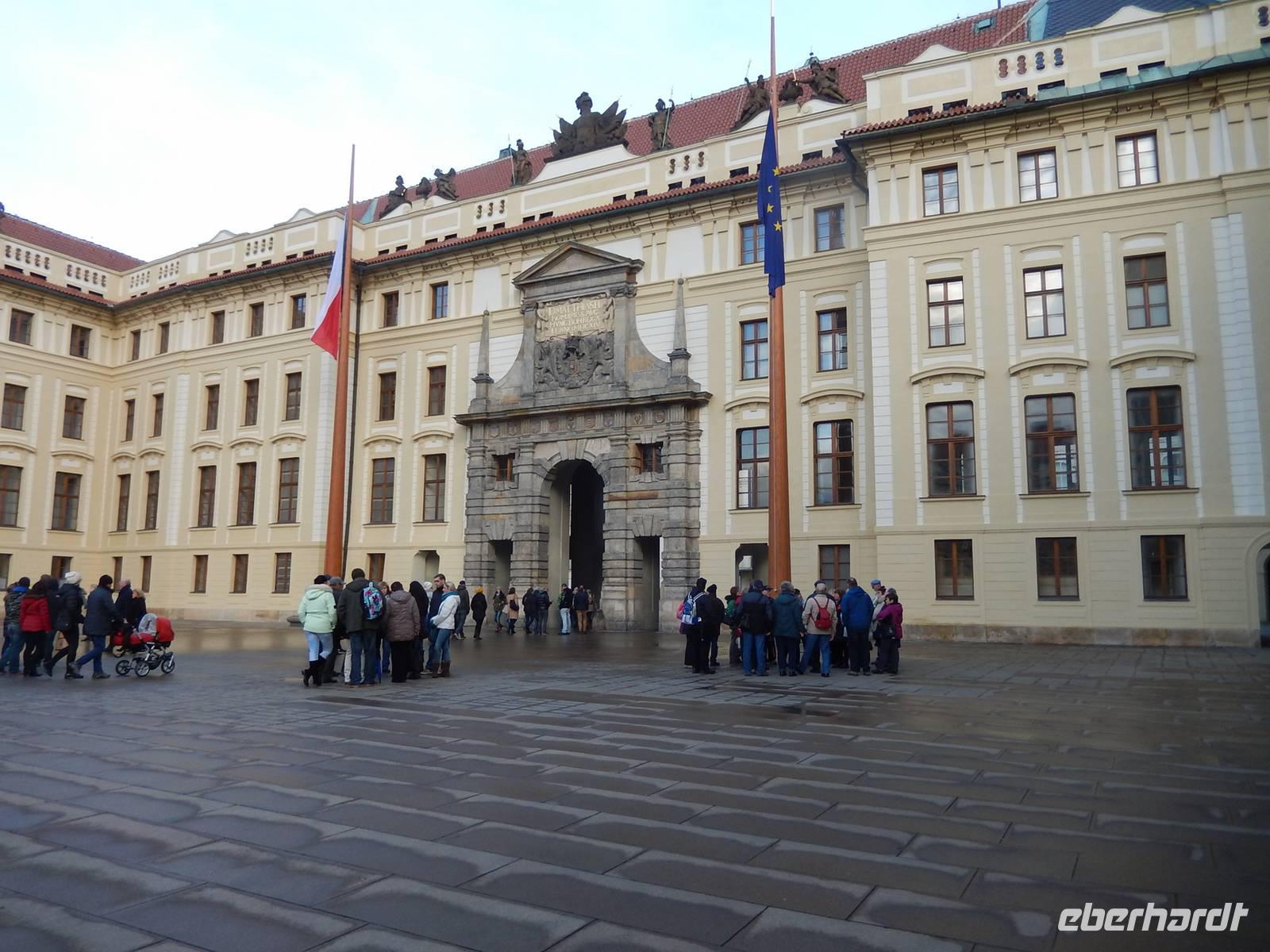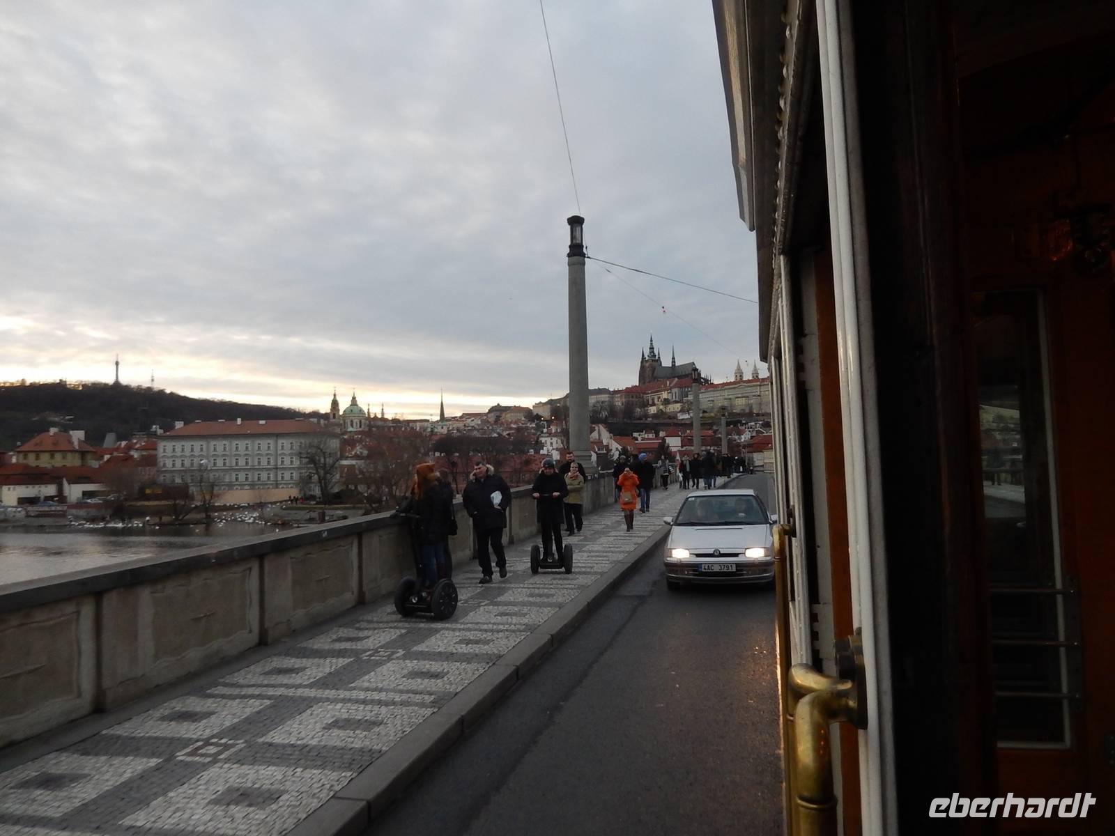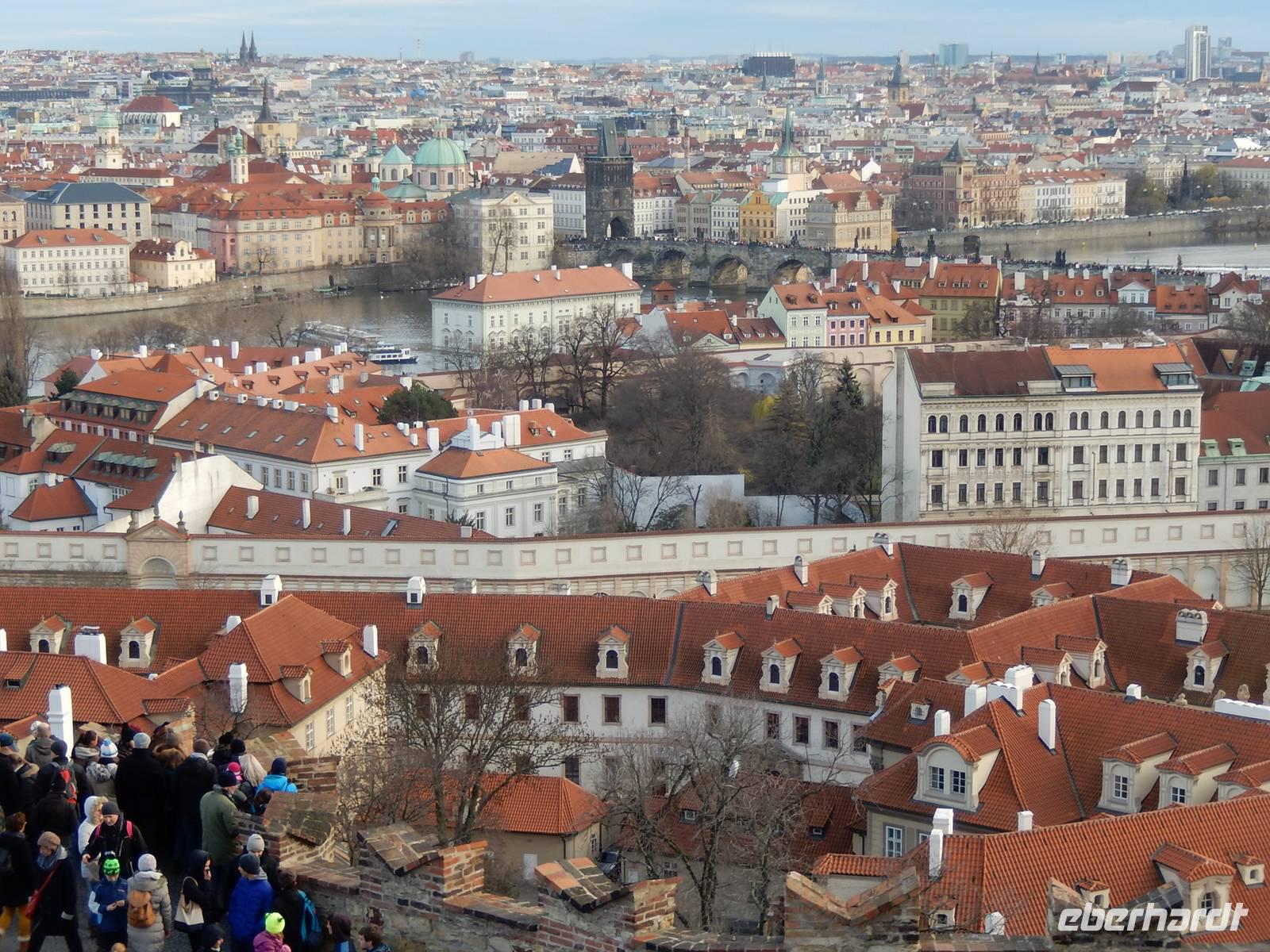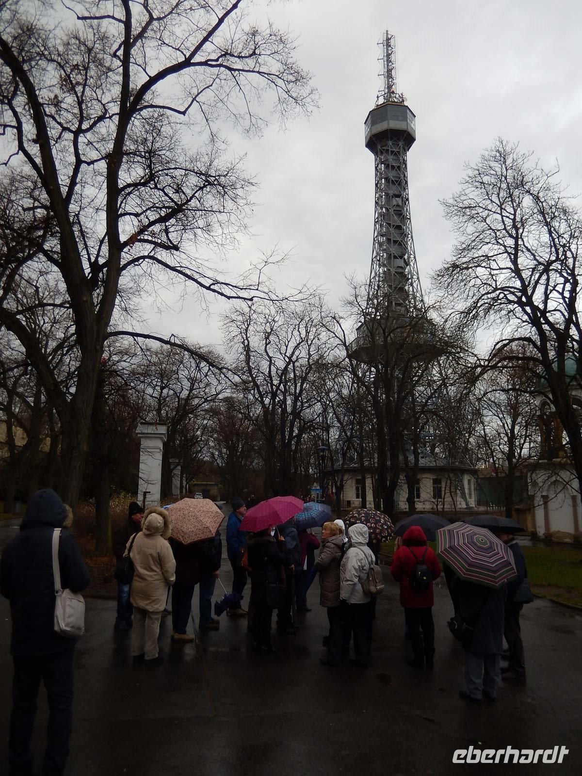 Nach gutem Schlaf wurden wir zum reichhaltigen Frühstücksbuffet mit Musik vom Klavier verwöhnt und konnten uns für den bevorstehenden anstrengenden Tag stärken. Das Buffet ließ keine Wünsche offen und gut gelaunt trafen wir uns in der Lobby und dort auf unsere freundliche Stadtführerin Irena, die uns die kommenden Tage begleiten sollte. Unsere erste Station war der Berg Petrin, den wir eigentlich mit einer Standseilbahn erreichen wollten. Leider wird diese im Moment gewartet und da uns noch einige Kilometer an diesem Tag erwarten sollten, haben wir uns für eine bequeme Anreise per Kleinbus-Taxi entschieden. Kurz vor 10 Uhr waren wir da und unsere erste Station hieß Spiegelsaal... So manch einer fühlte sich zurückversetzt in Kindertage beim Bewundern der Spiegelbilder. Wir haben herzlich gelacht! Und dann standen wir am Eiffelturm - richtig gelesen, am Eiffelturm. Ein wenig kleiner als das Original in Paris, aber für unsere Zwecke optimal. Zum einen handelt es sich dabei um eine Sehenswürdigkeit, die nicht zum Standardprogramm in Prag gehört udn zum anderen hat man von hier einen fantastischen Ausblick über Prag. So konnten wir auch ein paar schöne Fotos schießen. Einige von uns sparten sich dabei den Aufzug, der uns noch knarrenderweise nach oben gebracht hatte und spazierten die 299 Stufen wieder turmab. Eisiger Wind aber auch tolle Blicke waren der Lohn. Nach diesen Höhepunkten begann der anstrengende Teil des Tages. Zuerst spazierten wir gemütlich mit Irena in Richtung Burgviertel. Plötzlich rannte Uwe vom Ende der Gruppe ganz nach vorn - eine sportliche Höchstleistung! Grund dafür war die Intuition ein traumhaftes Gruppenbild zu schießen, in Ruhe vor der Kulisse von Prag bevor wir uns in Richtung Burg bewegen. Vorbei am Lorettoplatz suchen wir uns aber erstmal ein Restaurant zur Stärkung. Wir kehren im "Nepomuk" ein und jeder stärkt sich individuell für die folgenden Kilometer. Das Essen ist schmackhaft - zumindest bei den meisten - und die Bedienung... naja, wichtig ist ja, dass wir pünktlich zur Wachablösung vor den Toren des Hradschin stehen. Spätestens ab hier merken wir auch, wie attraktiv die tschechische Hauptstadt für Touristen aus aller Welt ist. Es fällt Irena nicht imemr leicht unsere eigentlich angenehm kleine Gruppe immer zusammen zu halten, aber mit orangen Handschuhen und auberginfarbene Schirm und bei diesen top disziplinierten Gästen geht natürlich alles gut. Und so bewundern wir im Alten Königspalast natürlich die historisch berühmte Böhmische Kanzel, von der aus der Prager Fenstersturz 1618 quasi den 30-jährigen Krieg auslöste... Anschließend stehen die St. Georgs Basilika und das Goldene Gässchen auf dem Programm und mit Irena an unserer Seite bleibt keine Frage unbeantwortet. Zum Schluss schlüpfen wir noch in den monumentalen St. Veits-Dom und lauschen den Geschichten von Nepomuk und dem Heiligen Wenzel. Am Ende haben wir ein bisschen Zeitnot, denn unser voll gepacktes Programm wartet mit dem nächsten Höhepunkt. An der Haltestelle Prager Burg steigen wir in eine