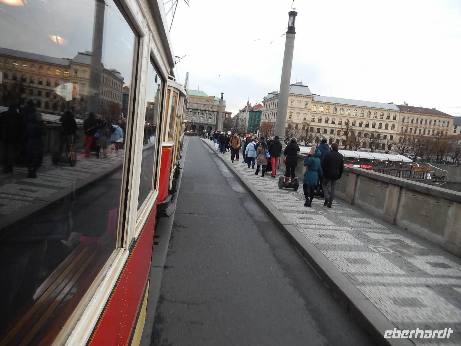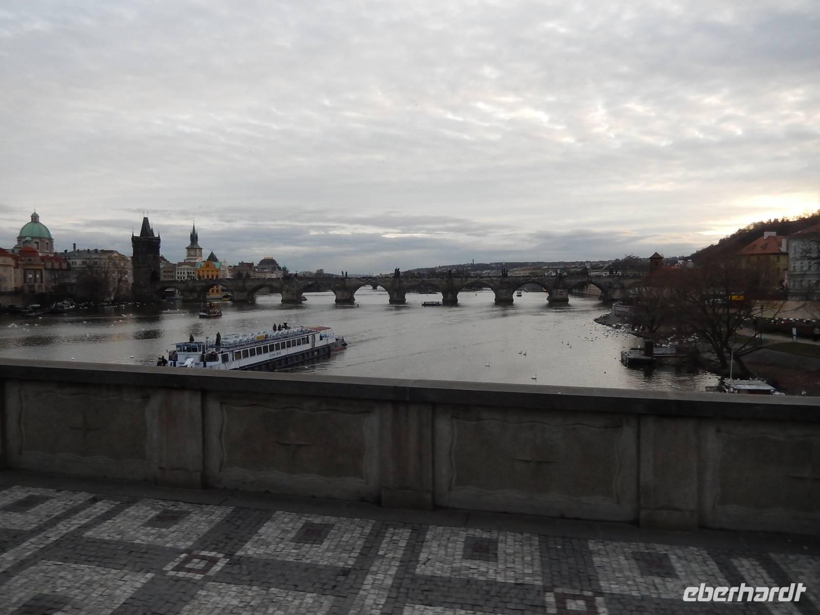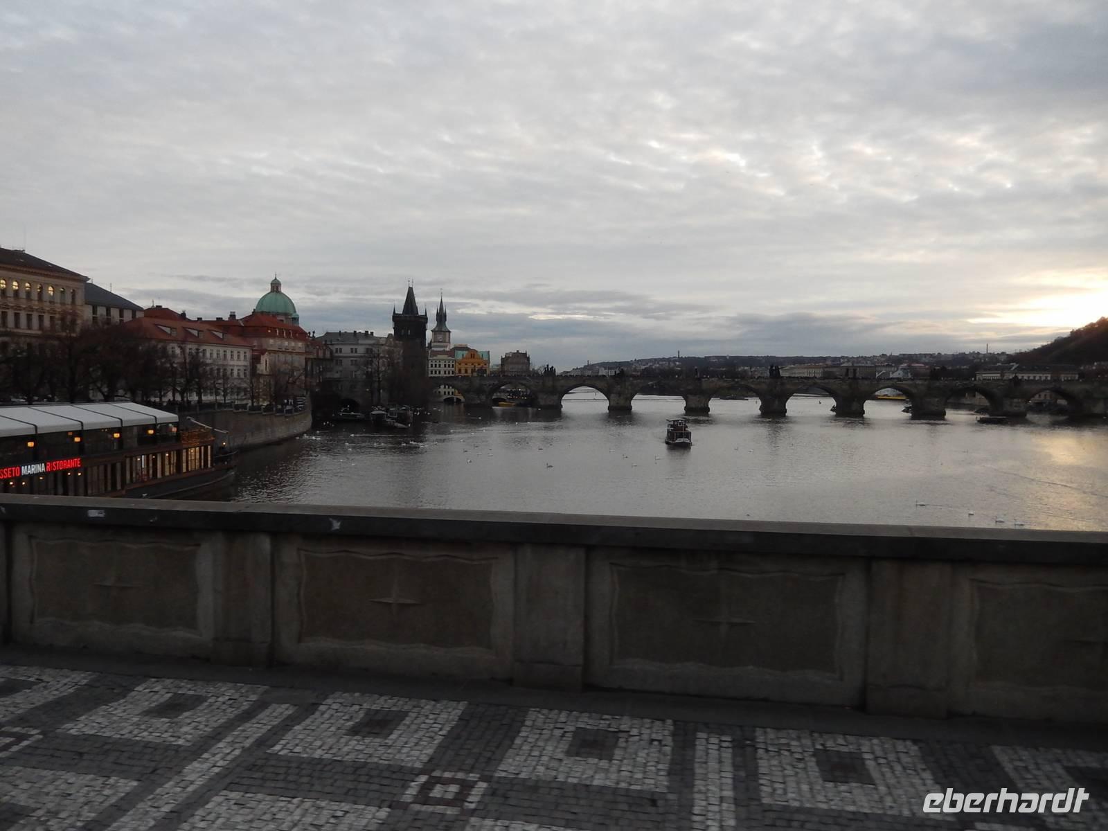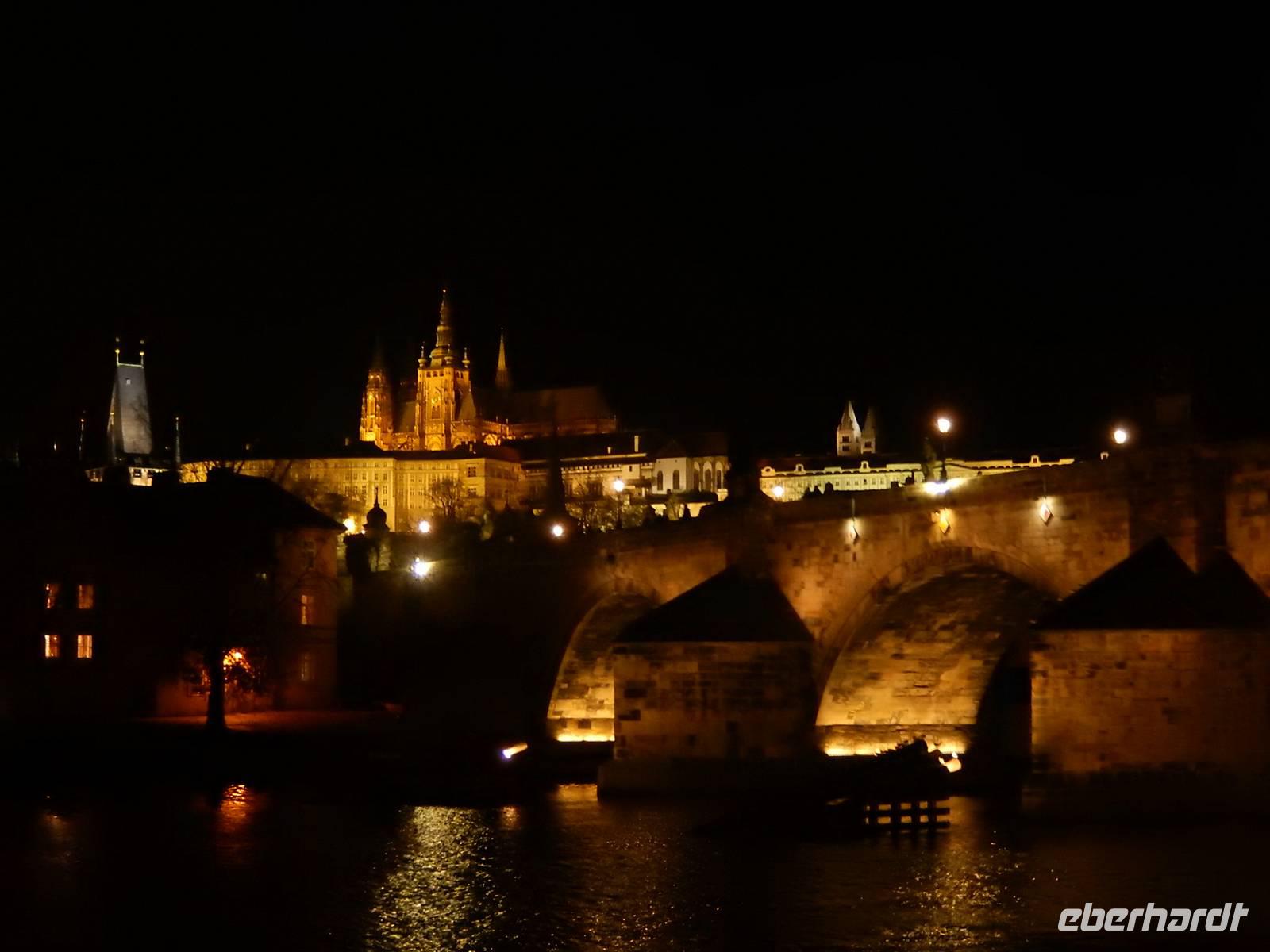 und werden - wie es sich für uns gehört- mit einem prickelnden Glas Sekt empfangen. Anschließend "schaukeln" wir durch Prag vorbei an so ziemlich allen Sehenswürdigkeiten bis zum Platz der Republik, der gerade um die Ecke von unserem Hotel liegt. Kurz Frischmachen ist angesagt, denn der Tag in Prag ist für uns noch lange nicht vorbei. Ein weiterer Blickwinkel auf die Sehenswürdigkeiten der Moldau-Metropole erwartet uns, diesmal von der Moldau aus. Wir spazieren durch weihnachtlich geschmückte Straßen zur Schiffsanlegestelle an der Juristischen Fakultät und besteigen ein Boot der Reederei Natal, um bei einem rustikal-tschechischen Buffet romantisch angestrahlte Bauwerke entlang der Moldau zu bewundern. Die Aufenthaltszeiten in diversen Schleusen nutzen wir zum probieren von Gulasch, Käsesalat oder Prager Naschwerk und selbstverständlich dürfen ein paar nächtliche Schnappschüsse nicht fehlen. Bis zu dieser späten Stunde versorgt uns Irena mit Informationen und ein freundlicher Harmonikaspieler mit bekannten Weisen, auch wenn die angekündigten Weihnachtslieder ziemlich kurz kommen. Dies tut unserer Laune aber keinen Abbruch und so ist nach dieser Moldau-Schifffahrt für die meisten der Abend in Prag noch nicht zu Ende... Noch ein Weihnachtsmarkt-Besuch oder doch ein Absacker in einem altbekannten oder neu kennengelernten Restaurant - jeder lässt den Abend heute individuell (lange) ausklingen.
