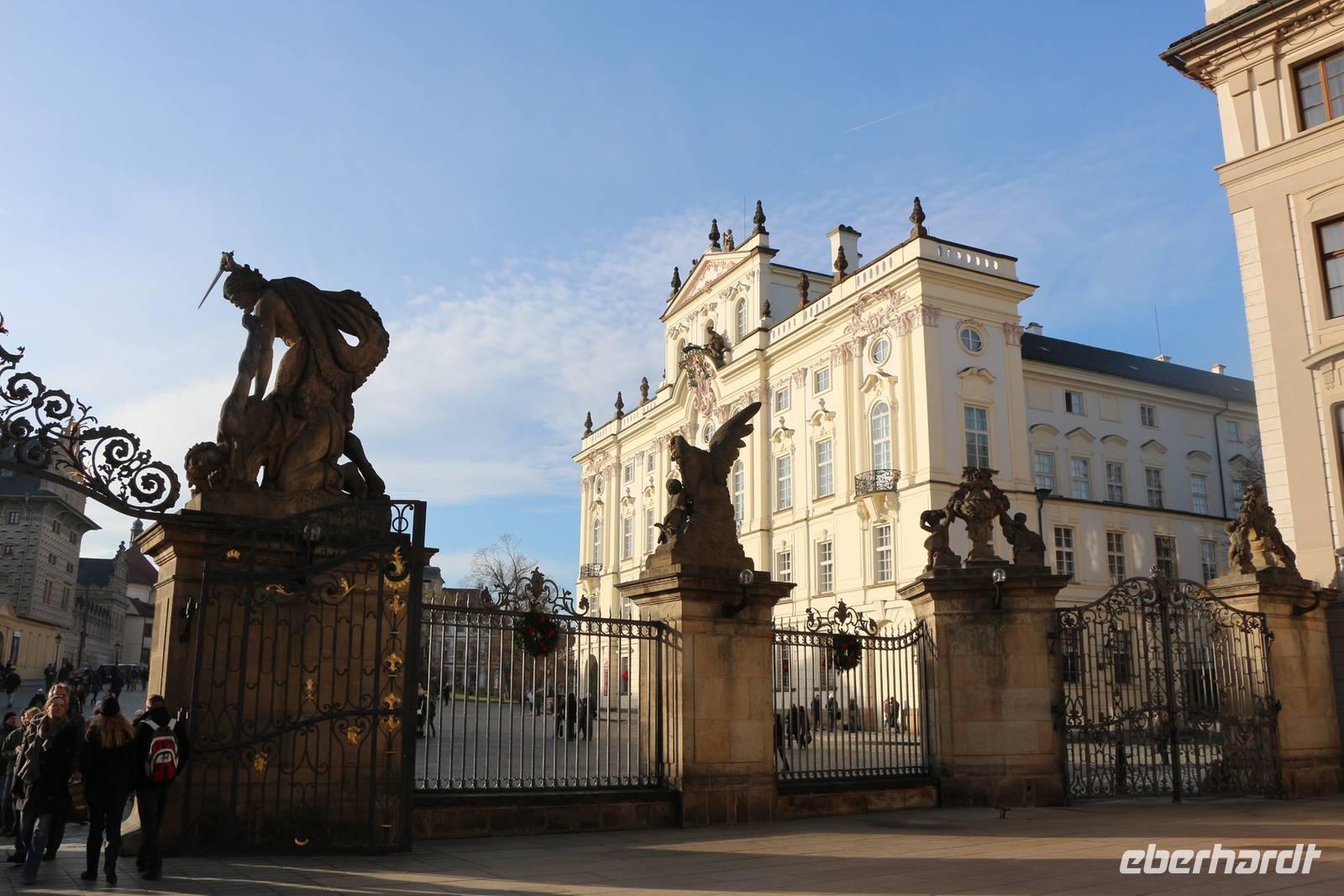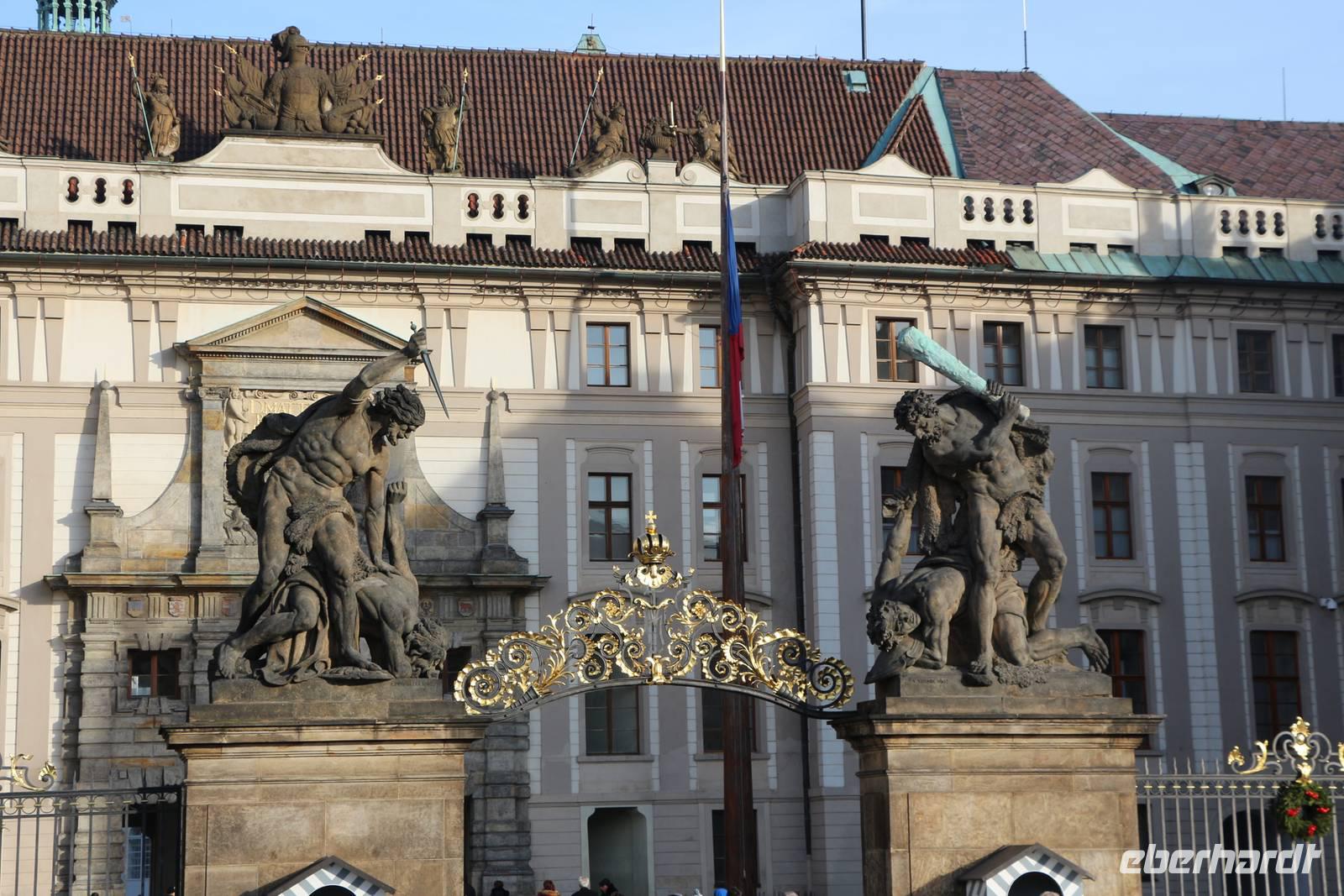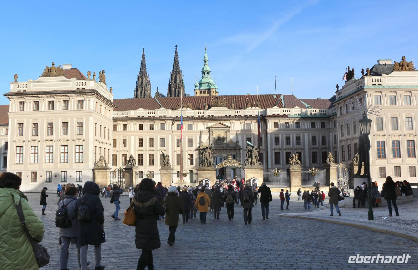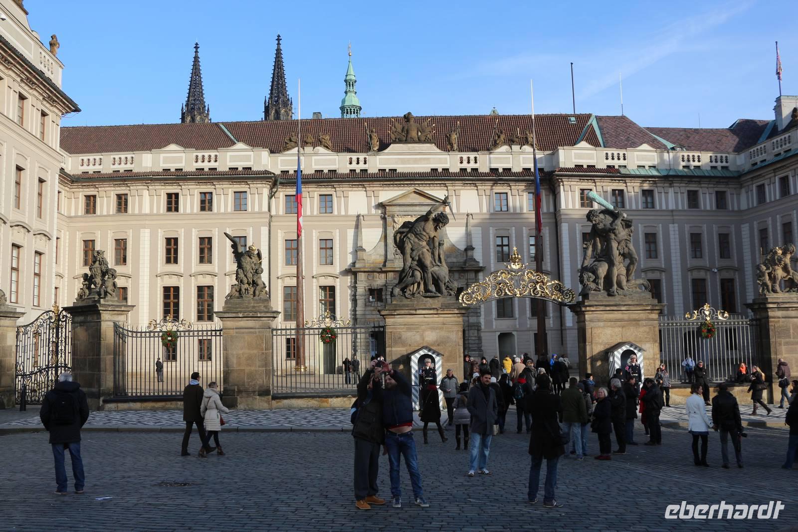 Weiter ging es zur berühmten Prager Burg auf dem Burgberg Hradschin. Über viele Jahrhunderte in immer neuen Baustilen gebaut und erweitert, gibt die Prager Burg Einblicke in die wechselvolle Geschichte der Stadt. Am Hradschiner Platz und in den einzelnen Burghöfen bestaunten wir Palais aus Barock und Jugendstil. Der Eingang zur Prager Burg wird nicht nur von zwei riesigen Sandstein-Giganten bewacht, sondern auch von der Leibgarde der Regierung. Die hübsch gekleideten jungen Männer werden täglich auf Tausenden Fotos abgelichtet.
