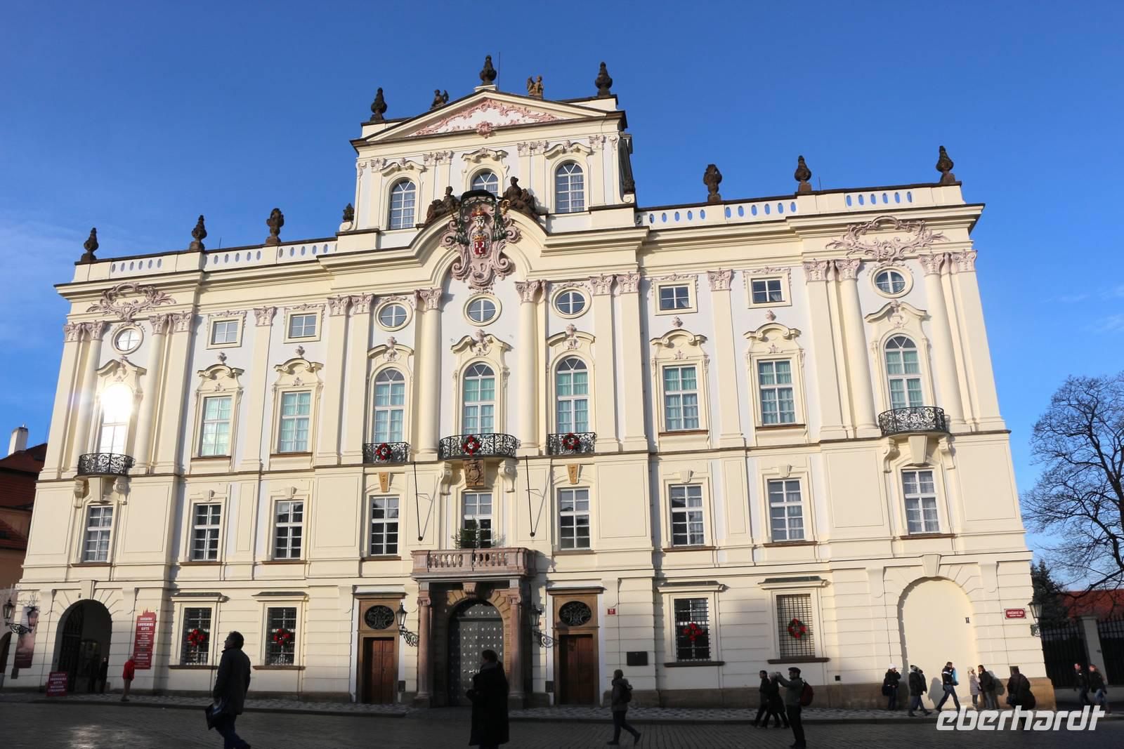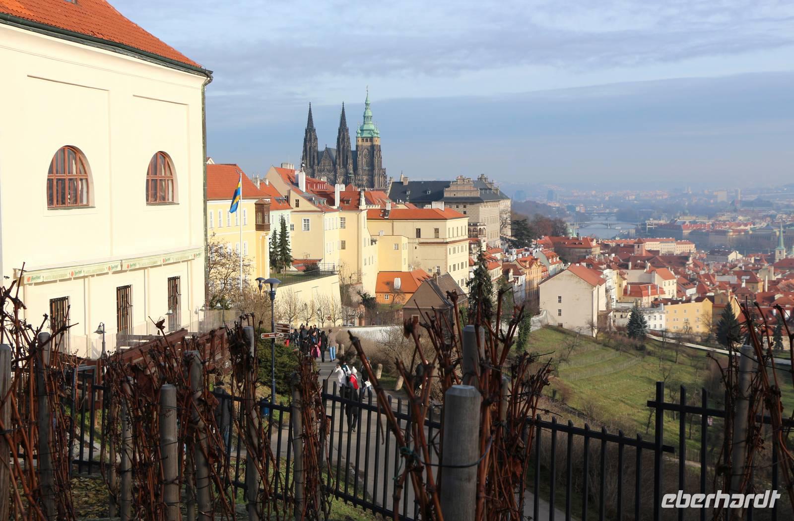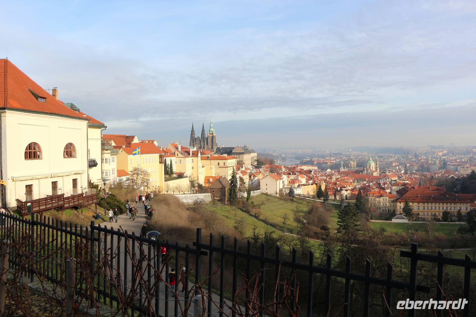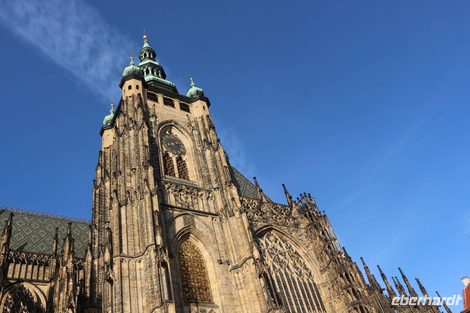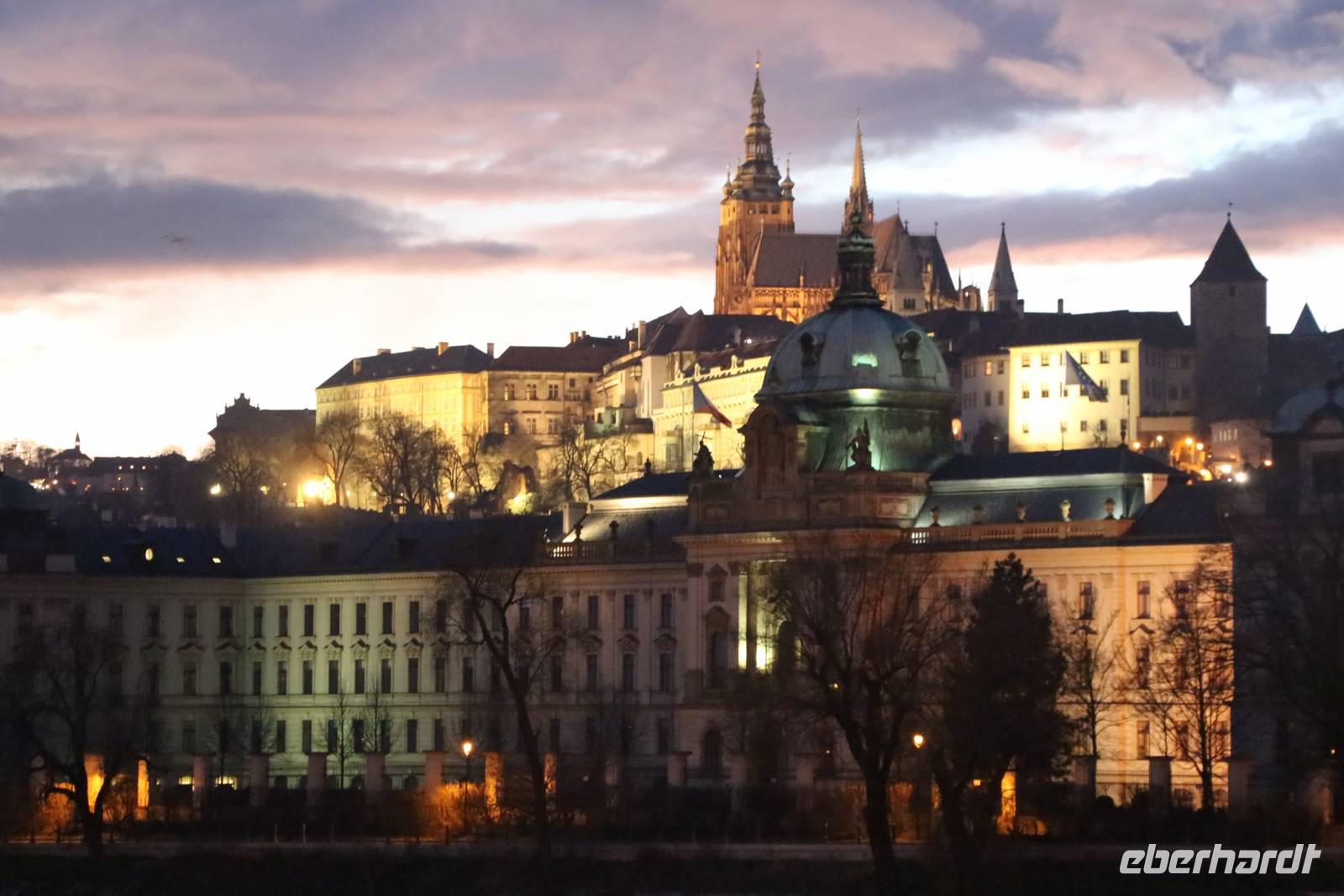 Weiter ging es zur berühmten Prager Burg auf dem Burgberg Hradschin. Über viele Jahrhunderte in immer neuen Baustilen gebaut und erweitert, gibt die Prager Burg Einblicke in die wechselvolle Geschichte der Stadt. Am Hradschiner Platz und in den einzelnen Burghöfen bestaunten wir Palais aus Barock und Jugendstil. Der Eingang zur Prager Burg wird nicht nur von zwei riesigen Sandstein-Giganten bewacht, sondern auch von der Leibgarde der Regierung. Die hübsch gekleideten jungen Männer werden täglich auf Tausenden Fotos abgelichtet.
