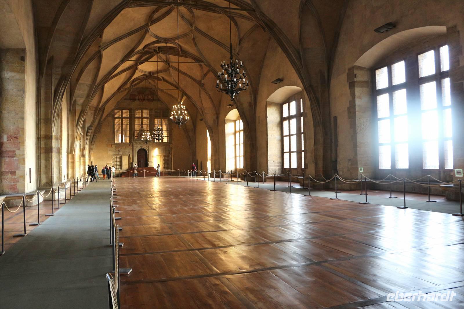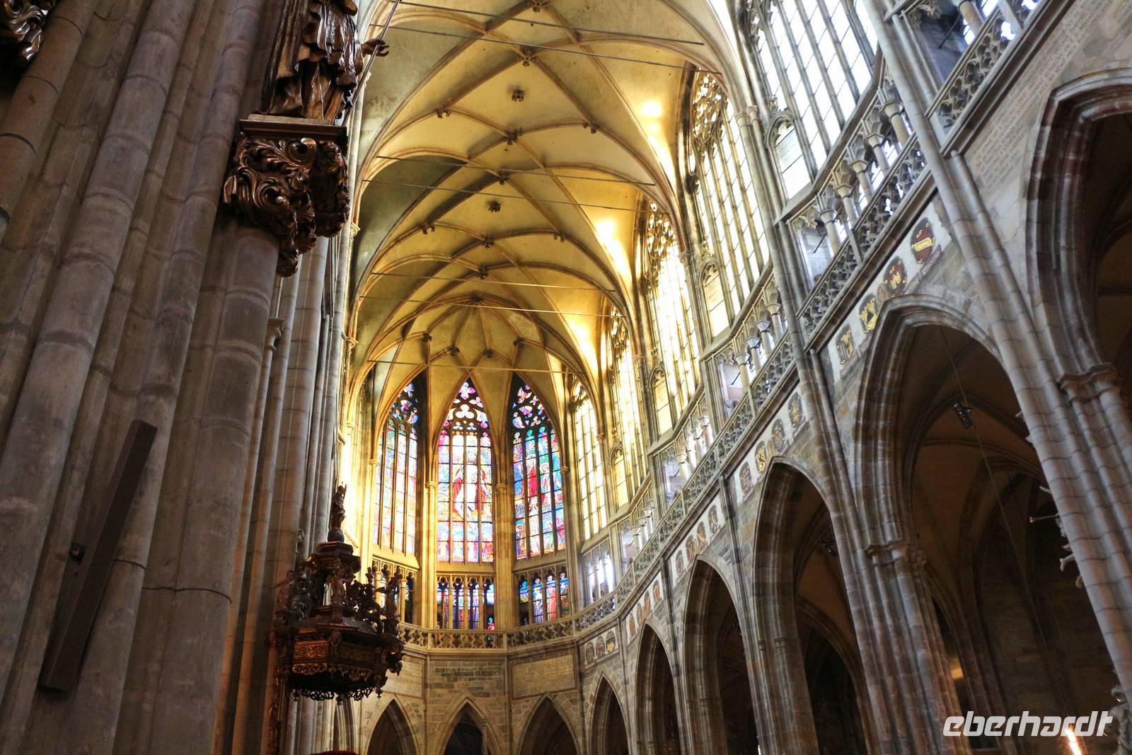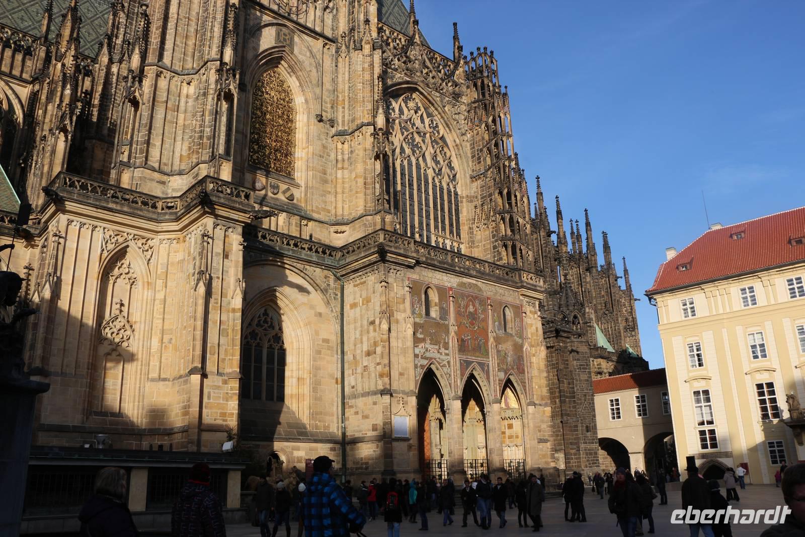 Bei unserer Führung besichtigten wir auch den beeindruckenden gotischen St. Veits Dom mit seinem reichen Schmuck aus Holz, Silber, Bleiglas und Gold. An der Seite des Doms befindet sich die berühmte Goldene Pforte, durch die alle Könige Böhmens bei Ihrer Krönungszeremonie gingen. In den Innenräumen des Königspalastes besichtigten wir auch den Wladislaw-Saal, in dem die Ritter und Gefolgsleute des Königs früher sogar zu Pferde hinein ritten. Und wir sahen das Fenster des zweiten Prager Fenstersturzes, der bekanntlich zum verheerenden Dreißigjährigen Krieg führte.