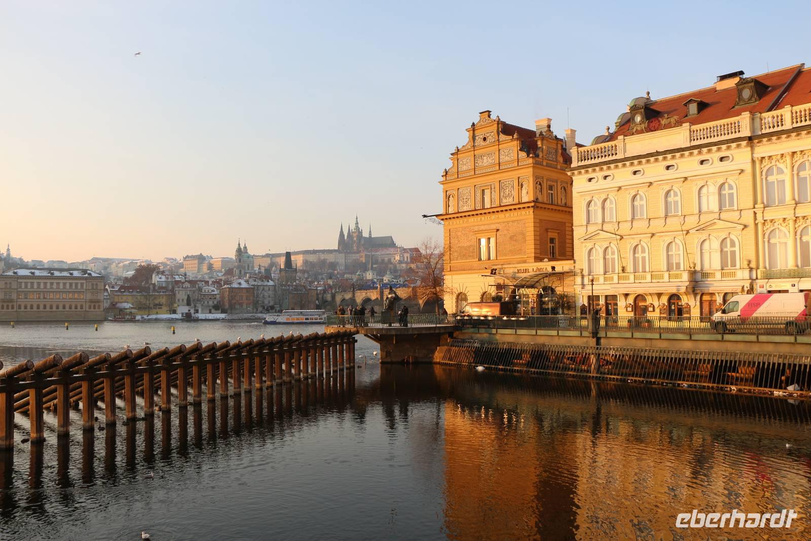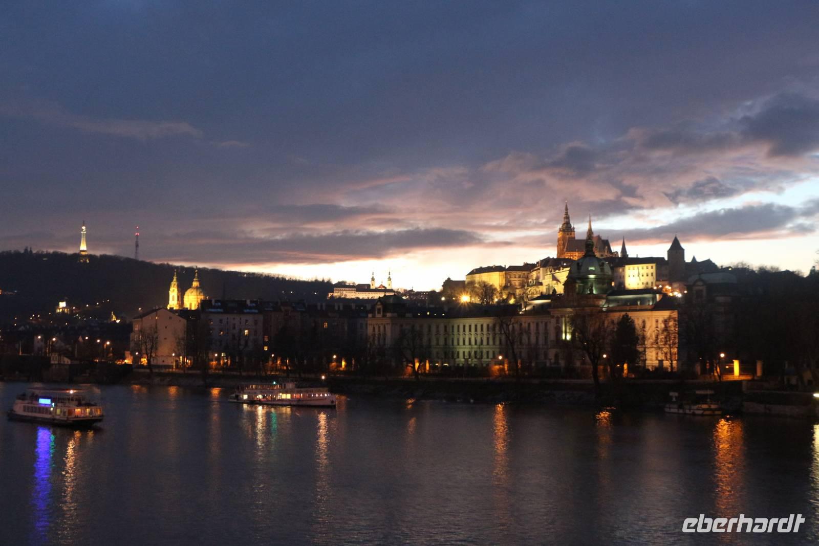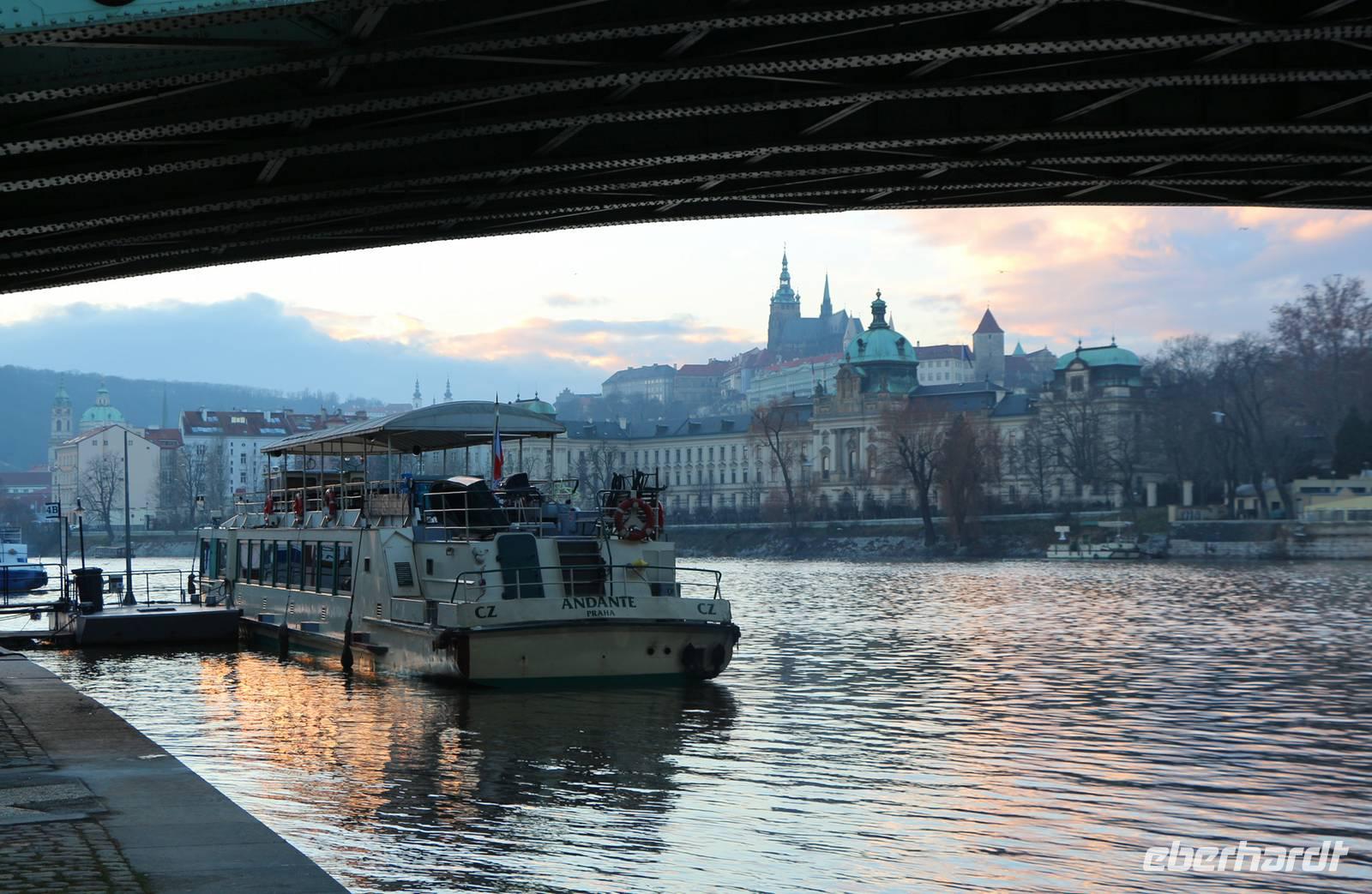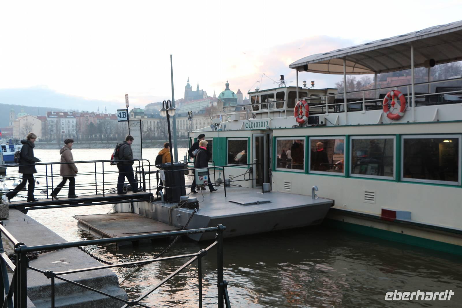 Am Nachmittag trafen wir uns wieder am Altstädter Ring und gingen gemeinsam zurück zur Cech-Brücke, wo unser Schiff für die einstündige Moldau-Schifffahrt wartete. Vom Wasser aus bekamen wir noch einmal ganz neue Ausblicke auf die Stadt und die Uferpromenaden an der Moldau. Dabei erhielten wir über Lautsprecher die deutschen Erklärungen zu den Sehenswürdigkeiten links und rechts des Schiffes. Bei Tee, Kaffee und Glühwein genossen wir die wohlige Wohnzimmer-Atmosphäre auf dem Schiff.