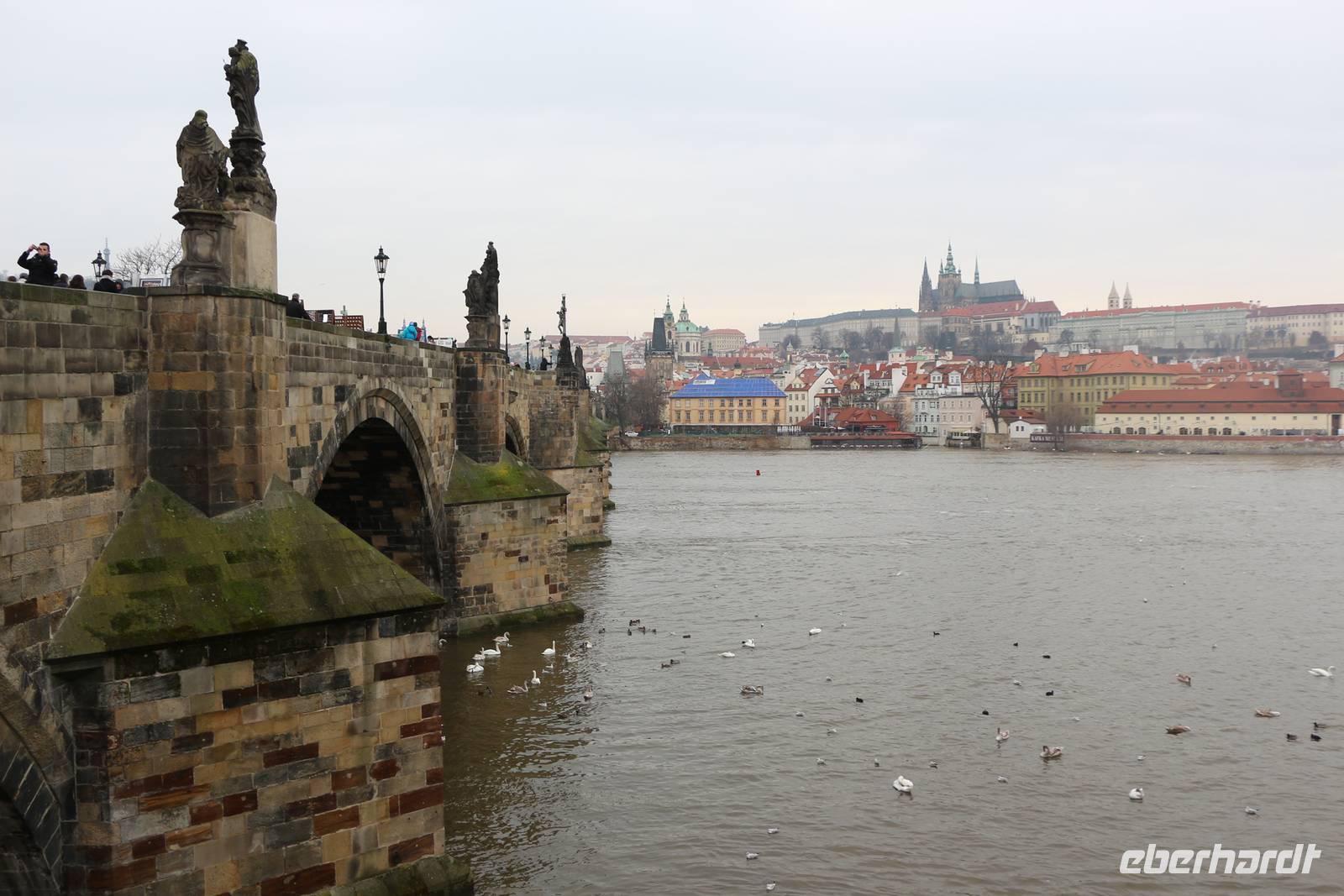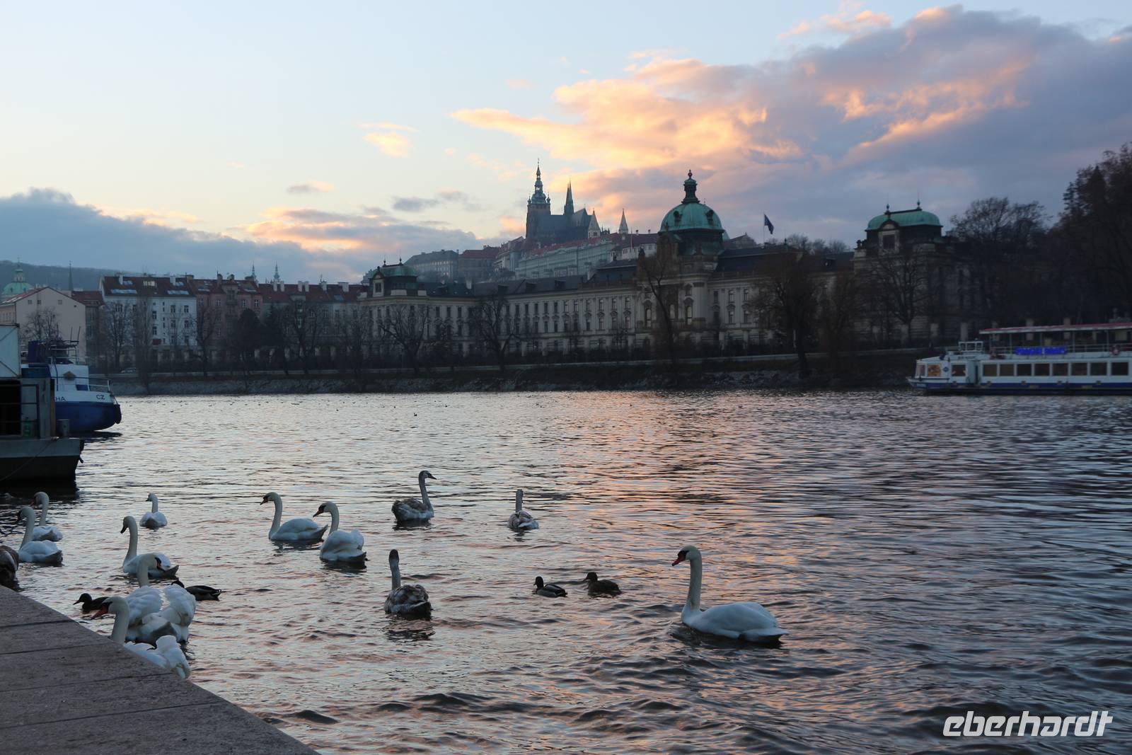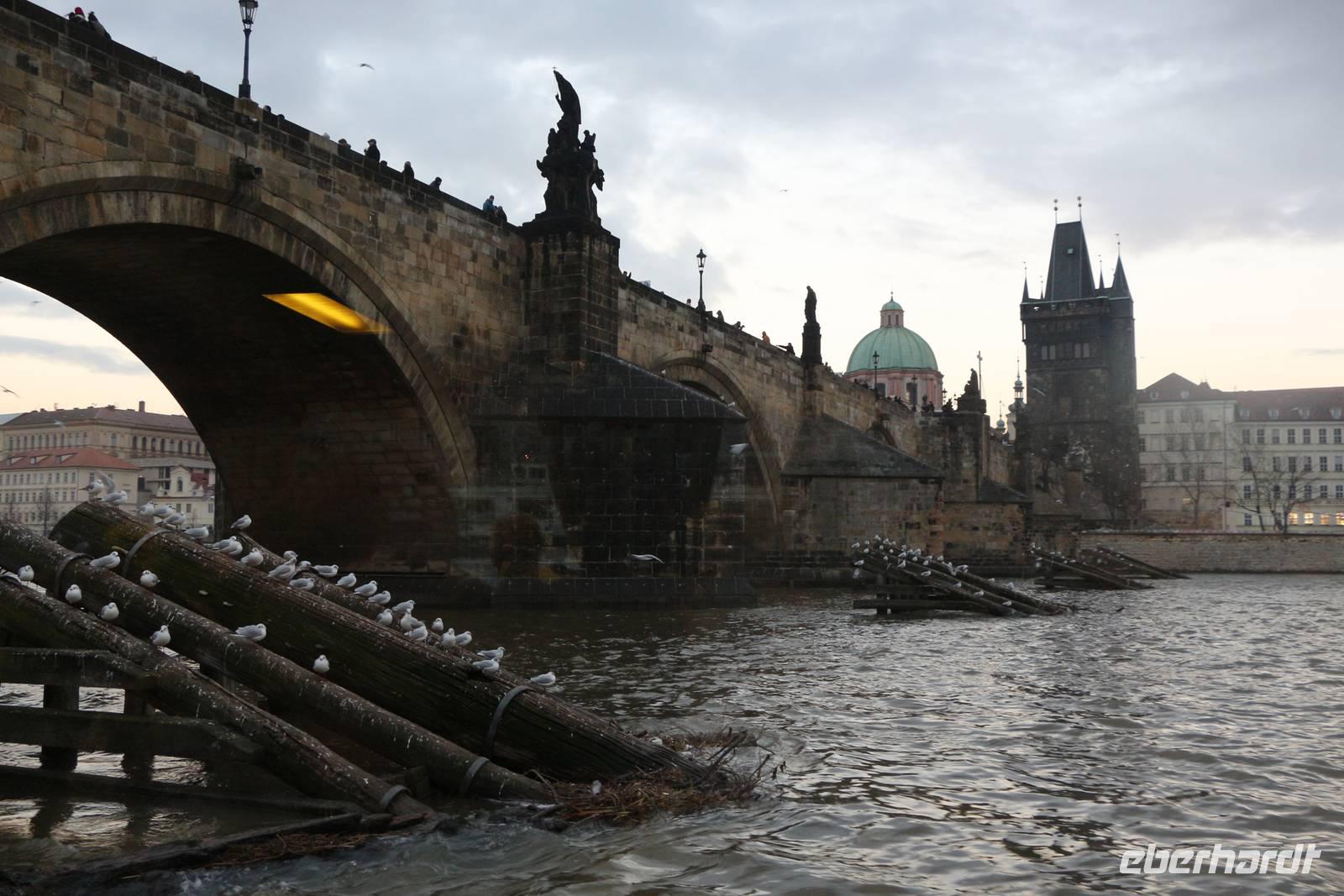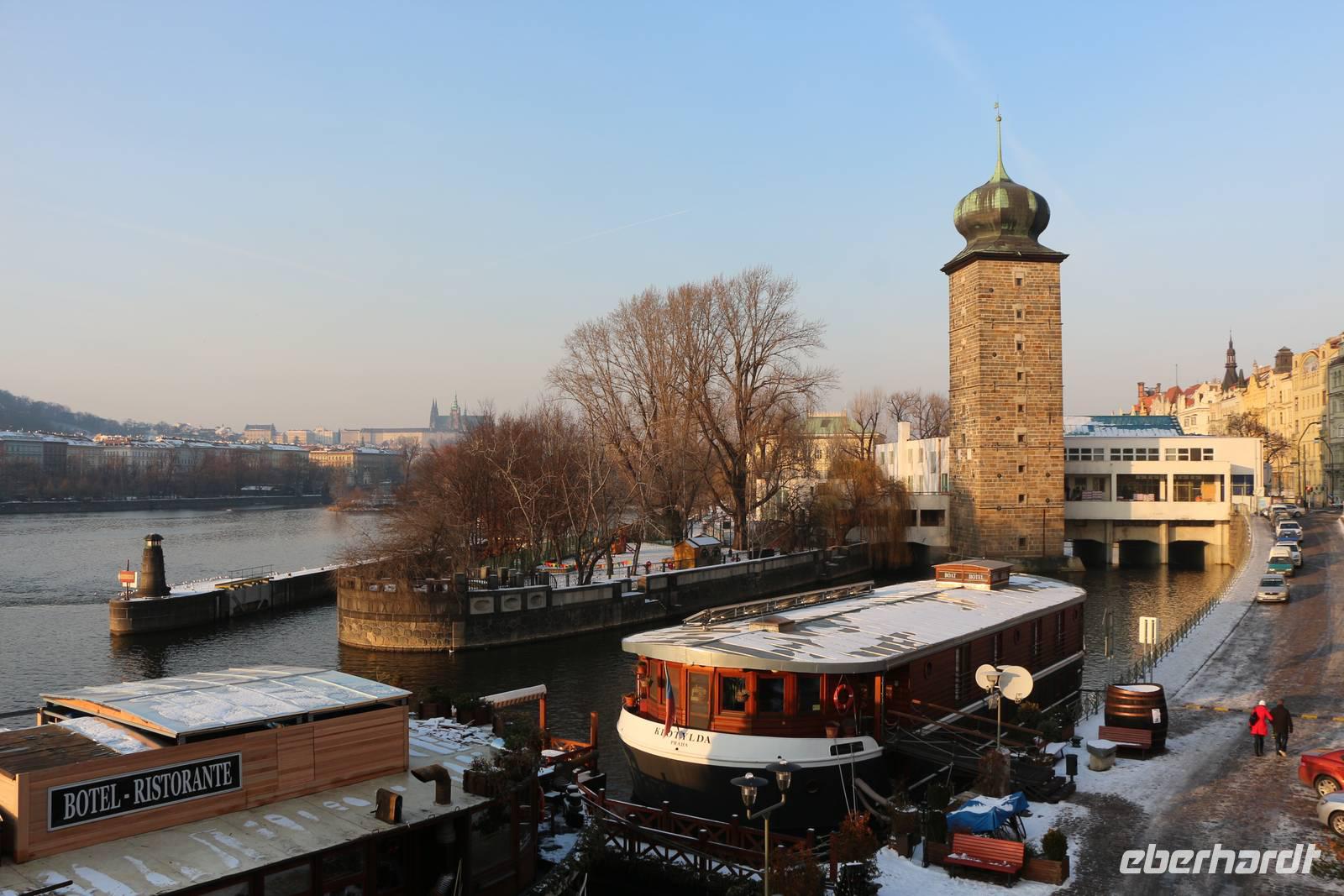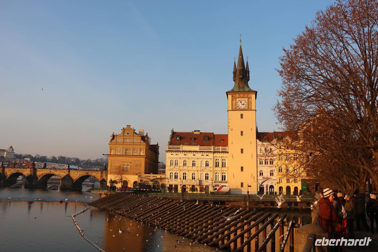 Am Nachmittag trafen wir uns wieder am Altstädter Ring und gingen gemeinsam zurück zur Cech-Brücke, wo unser Schiff für die einstündige Moldau-Schifffahrt wartete. Vom Wasser aus bekamen wir noch einmal ganz neue Ausblicke auf die Stadt und die Uferpromenaden an der Moldau. Dabei erhielten wir über Lautsprecher die deutschen Erklärungen zu den Sehenswürdigkeiten links und rechts des Schiffes. Bei Tee, Kaffee und Glühwein genossen wir die wohlige Wohnzimmer-Atmosphäre auf dem Schiff.