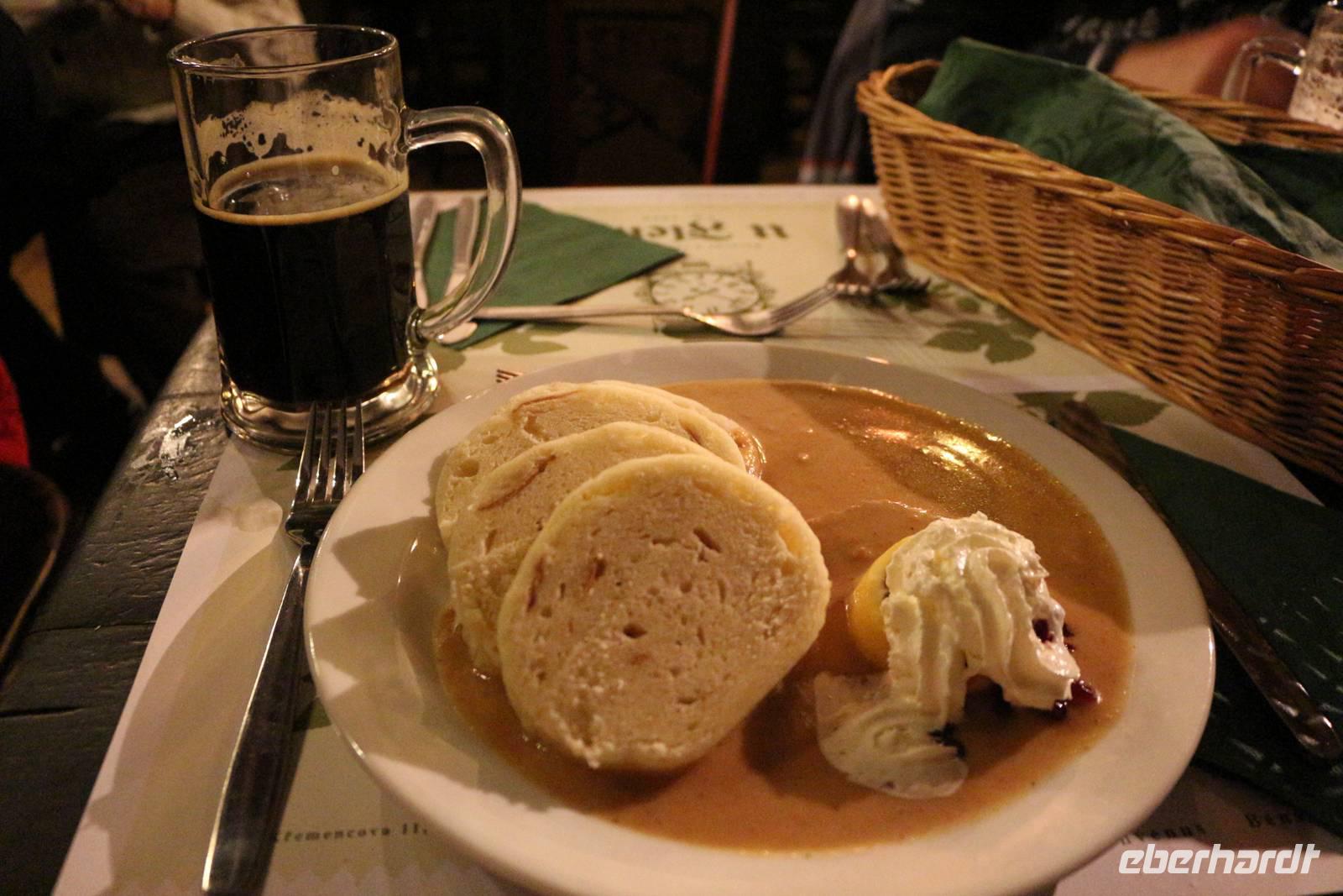 Bevor wir mit dem Bus in die Neustadt fuhren, legten wir eine kleine Pause zum Umziehen und Frischmachen im Hotel ein. Zum Abendessen waren wir nämlich heute im ältesten und bekanntesten Bierrestaurant Prags eingeladen - dem Restaurant "U Fleku". Hier ging es urig und gemütlich zu. Ein deftiges 3-Gang-Menü mit böhmischen Spezialitäten wie Prager Schinken und Gulasch mit Knödeln versüßte uns den Abend. Dazu gab es das berühmte dunkle und sehr starke Fleksche Bier und Stimmungsmusik live gespielt. Es wurde kräftig mitgesungen und in fröhlicher Runde ging es am späten Abend zurück ins Hotel, wo wir den Tag in der Bar ausklingen ließen.