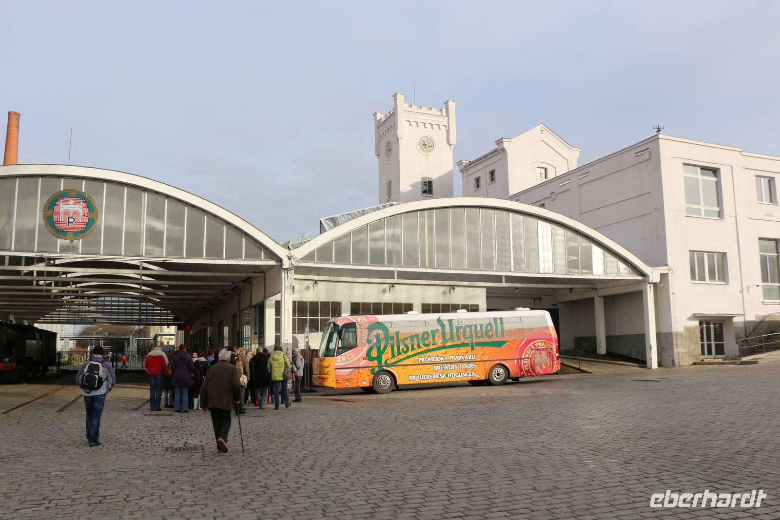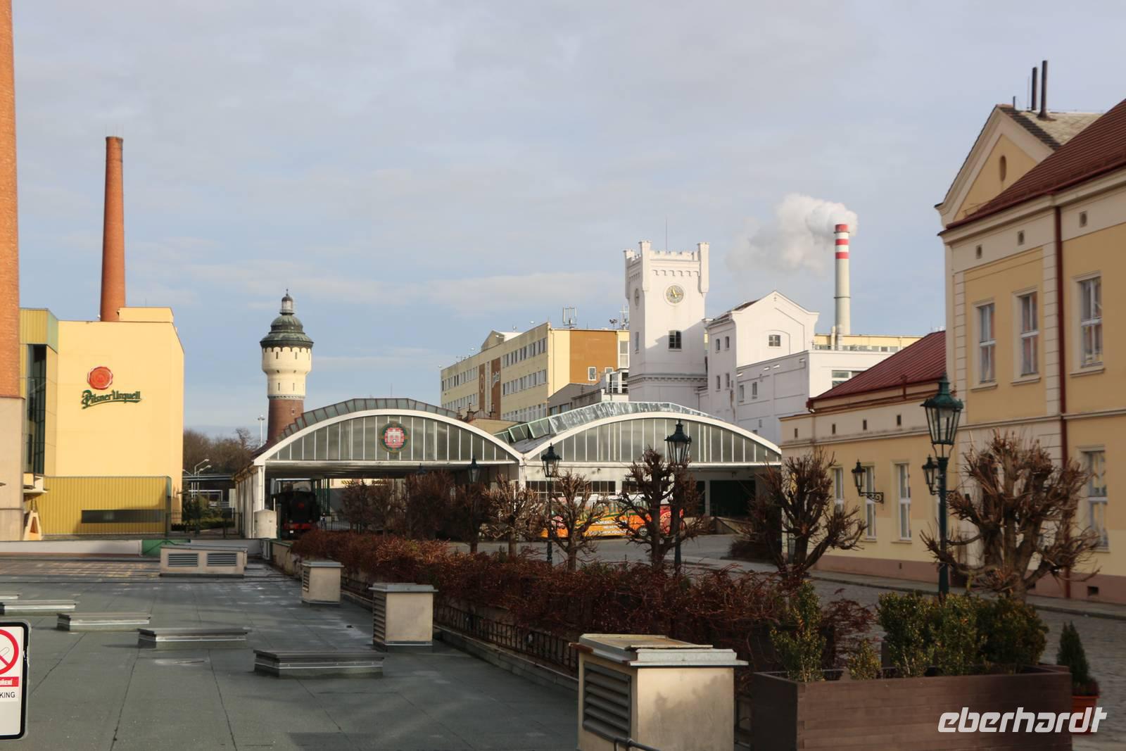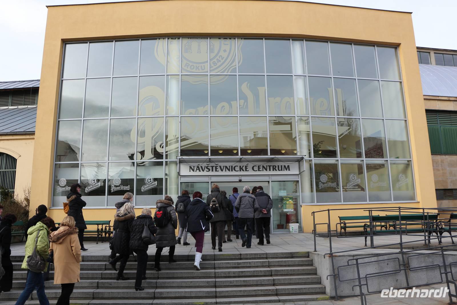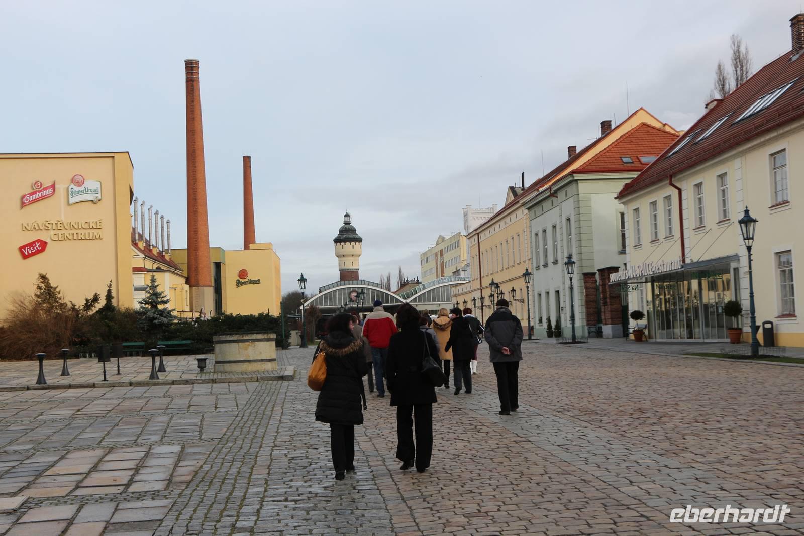 Am Silvestertag unternahmen wir einen Ausflug in das etwa eine Stunde entfernte Pilsen. Die Stadt ist vor allem bekannt durch die Skoda-Werke und die Pilsener Urquell Brauerei. Letztere stand natürlich auf unserem Besichtigungsprogramm. Hier wurde 1842 das untergärige Lagerbier erfunden und hergestellt, was heute als Vorgänger aller modernen Lagerbier-Sorten gilt. Mit einem Brauerei-Bus ging es zuerst zum historischen Wasserturm, durch den das Quellwasser für das Pilsener aus der Region gepumpt wurde. Wir dürfen sogar einen Blick hinein werfen. Dann besichtigten wir das neue und das alte Sudhaus mit den riesigen Kupferpfannen. Heute läuft die Brauerei natürlich ganz modern computergesteuert, aber wir sahen auch einige traditionelle Werkzeuge und geschichtsträchtige Fotos aus der Geschichte der Brauerei. In den modernen Museumsräumen sehen wir einen Film über die Pilsener Urquell Brauerei und lernen die einzelnen Bestandteile des Bieres - Gerste und Malz, Hefe, Hopfen und Quellwasser - kennen. Dann ging es hinunter in die weitläufigen, kilometerlangen Gärkeller, wo wir auch ein Pilsener Urquell Jungbier direkt aus dem Eichenfass probierten. Lecker!
