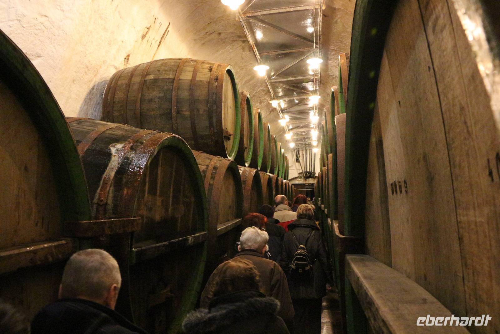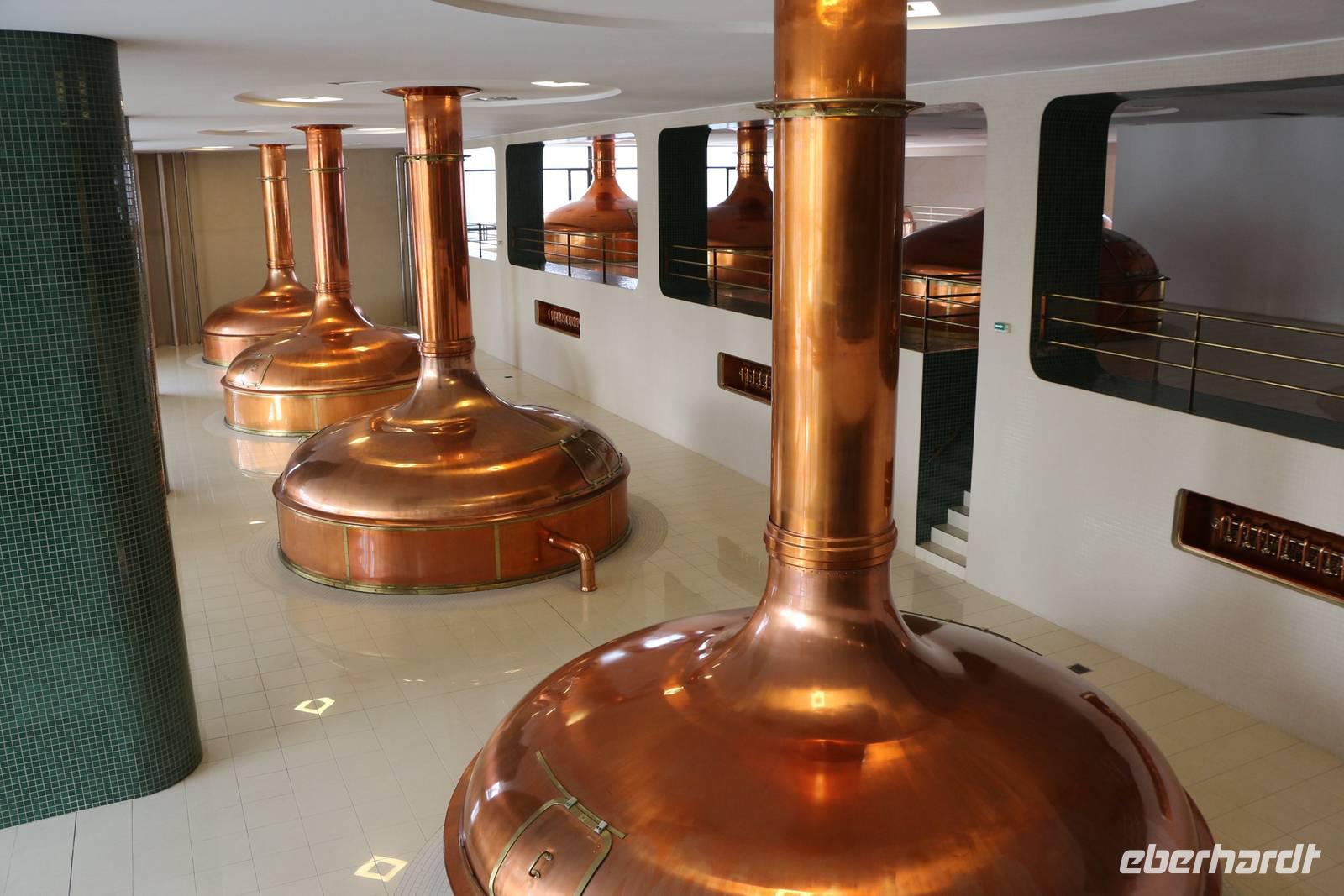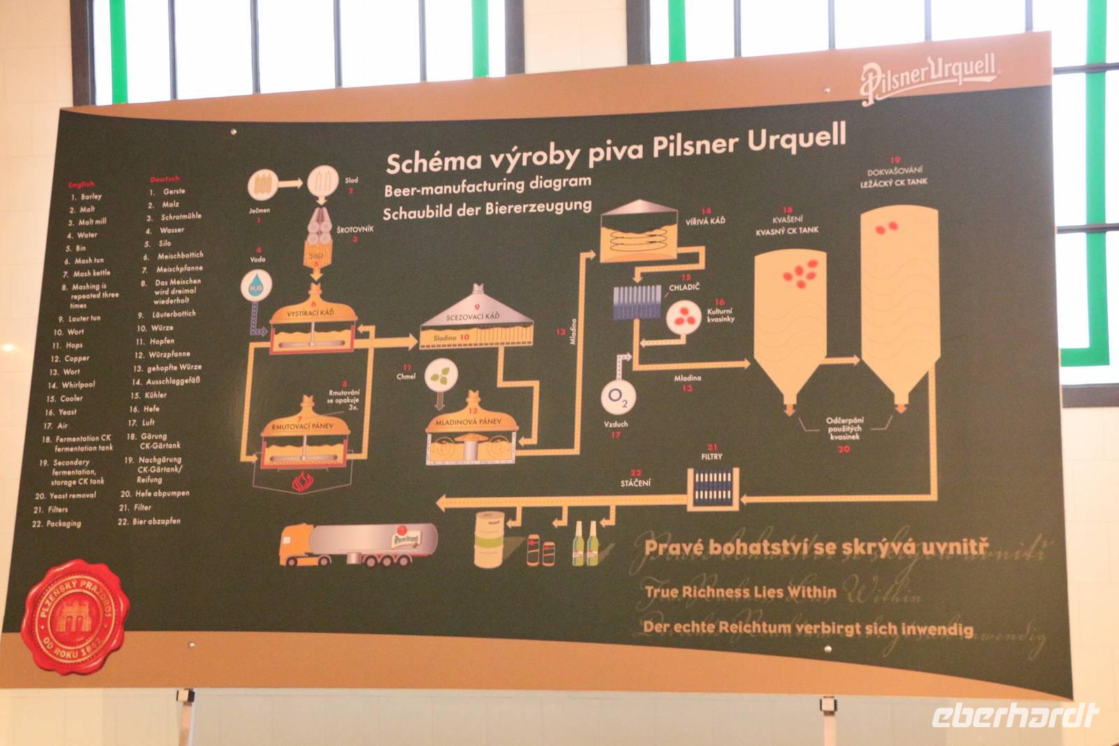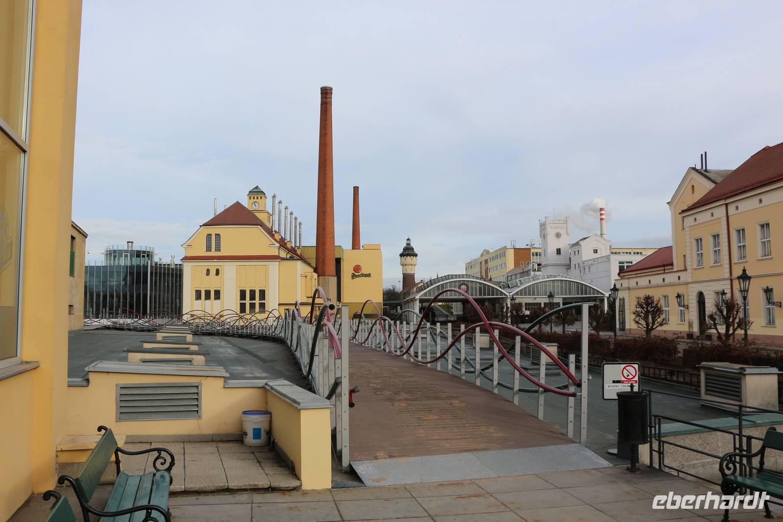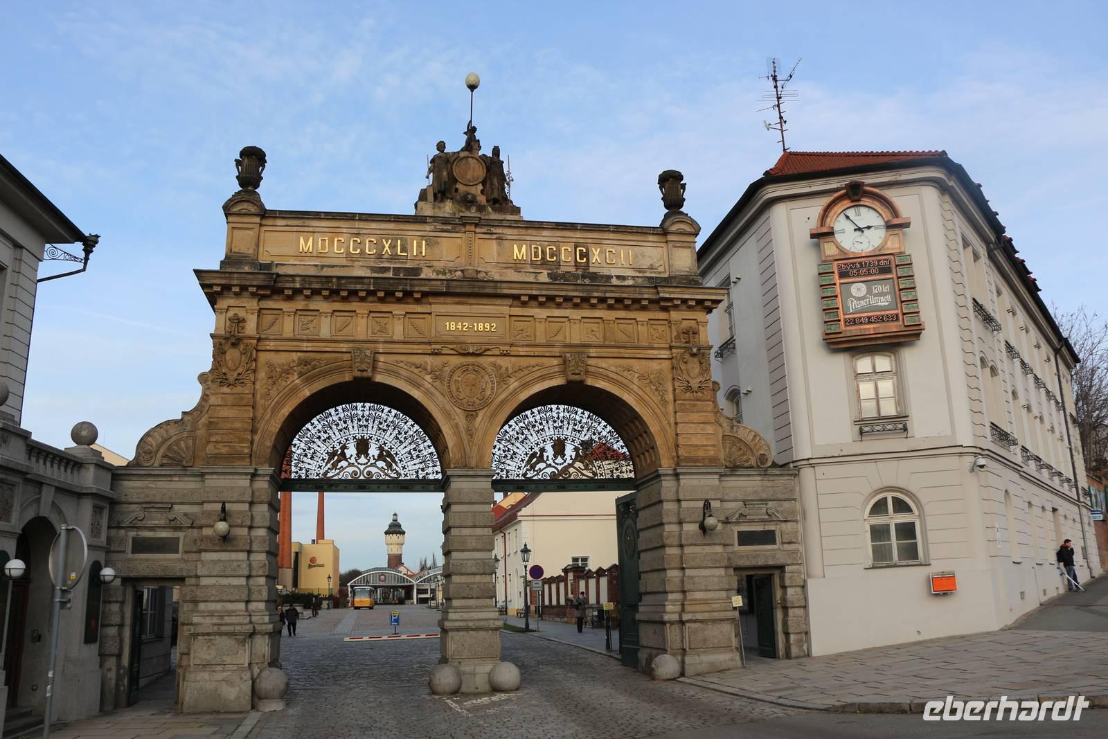 Am Silvestertag unternahmen wir einen Ausflug in das etwa eine Stunde entfernte Pilsen. Die Stadt ist vor allem bekannt durch die Skoda-Werke und die Pilsener Urquell Brauerei. Letztere stand natürlich auf unserem Besichtigungsprogramm. Hier wurde 1842 das untergärige Lagerbier erfunden und hergestellt, was heute als Vorgänger aller modernen Lagerbier-Sorten gilt. Mit einem Brauerei-Bus ging es zuerst zum historischen Wasserturm, durch den das Quellwasser für das Pilsener aus der Region gepumpt wurde. Wir dürfen sogar einen Blick hinein werfen. Dann besichtigten wir das neue und das alte Sudhaus mit den riesigen Kupferpfannen. Heute läuft die Brauerei natürlich ganz modern computergesteuert, aber wir sahen auch einige traditionelle Werkzeuge und geschichtsträchtige Fotos aus der Geschichte der Brauerei. In den modernen Museumsräumen sehen wir einen Film über die Pilsener Urquell Brauerei und lernen die einzelnen Bestandteile des Bieres - Gerste und Malz, Hefe, Hopfen und Quellwasser - kennen. Dann ging es hinunter in die weitläufigen, kilometerlangen Gärkeller, wo wir auch ein Pilsener Urquell Jungbier direkt aus dem Eichenfass probierten. Lecker!