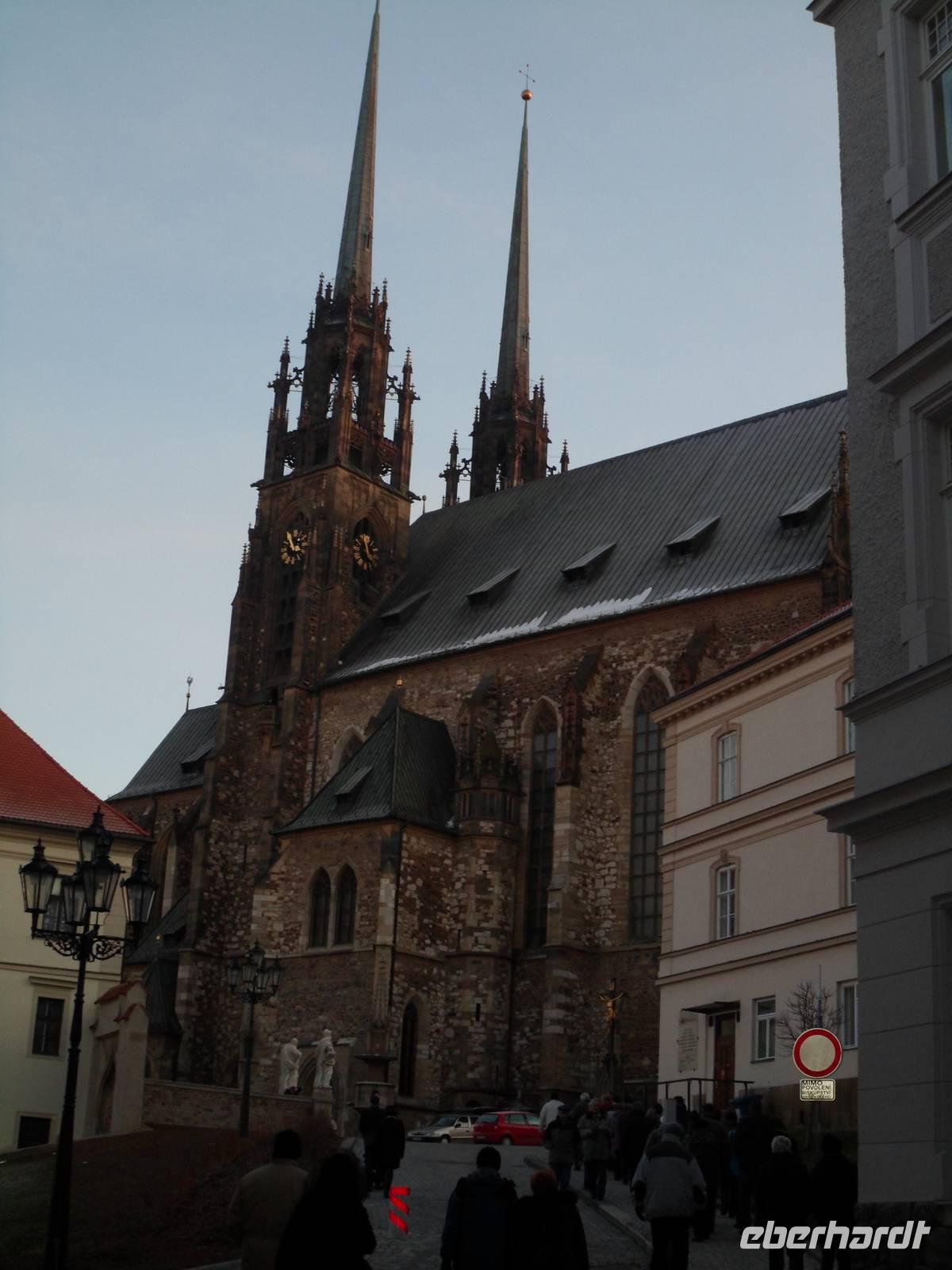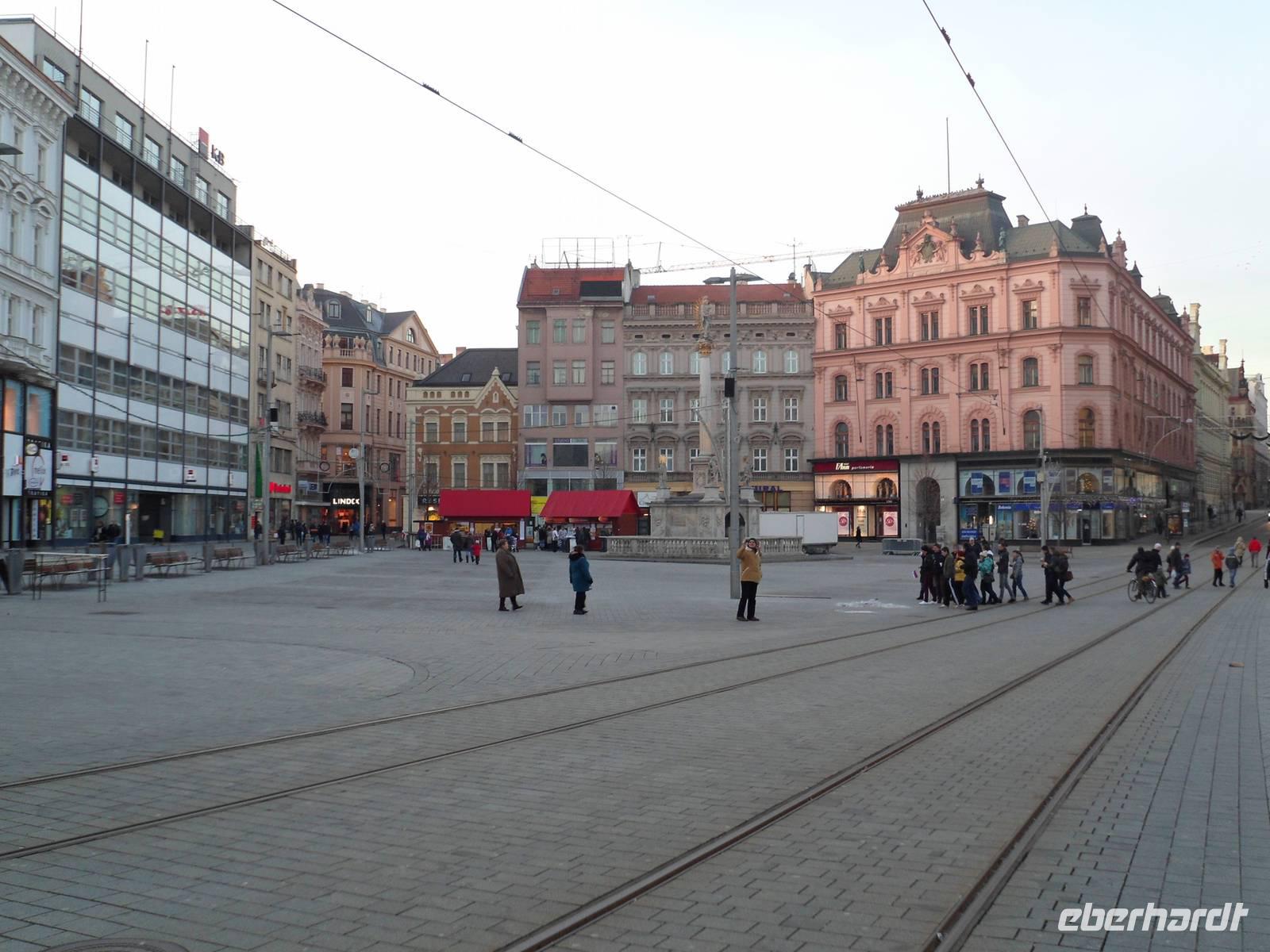 Wieder zurück zum Bus fuhren wir zum Stadtzentrum. Hier am Busparkplatz begann unser Rundgang durch die südmährische Hauptstadt Brünn, vorbei an der Universität zur St. Jakobs-Kirche, deren Turm der höchste der Stadt ist. Der Platz davor war früher ein Friedhof. Nach der Besichtigung führte unser Weg zum tropfenförmigen Herz der Stadt - der Platz der Freiheit - mit Häusern aus verschiedenen Epochen, der Pestsäule, der neuen astronomischen Uhr sowie vielen Einkaufsmöglichkeiten, und immer wieder in regelmäßigen Abständen holperte die Straßenbahn über den Platz. Das schönste Haus ist das Haus der Herren von Lipa, ein wunderschönes Renaissancegebäude. Es roch wunderbar nach Glühwein und süßem Gebäck - verführerisch.