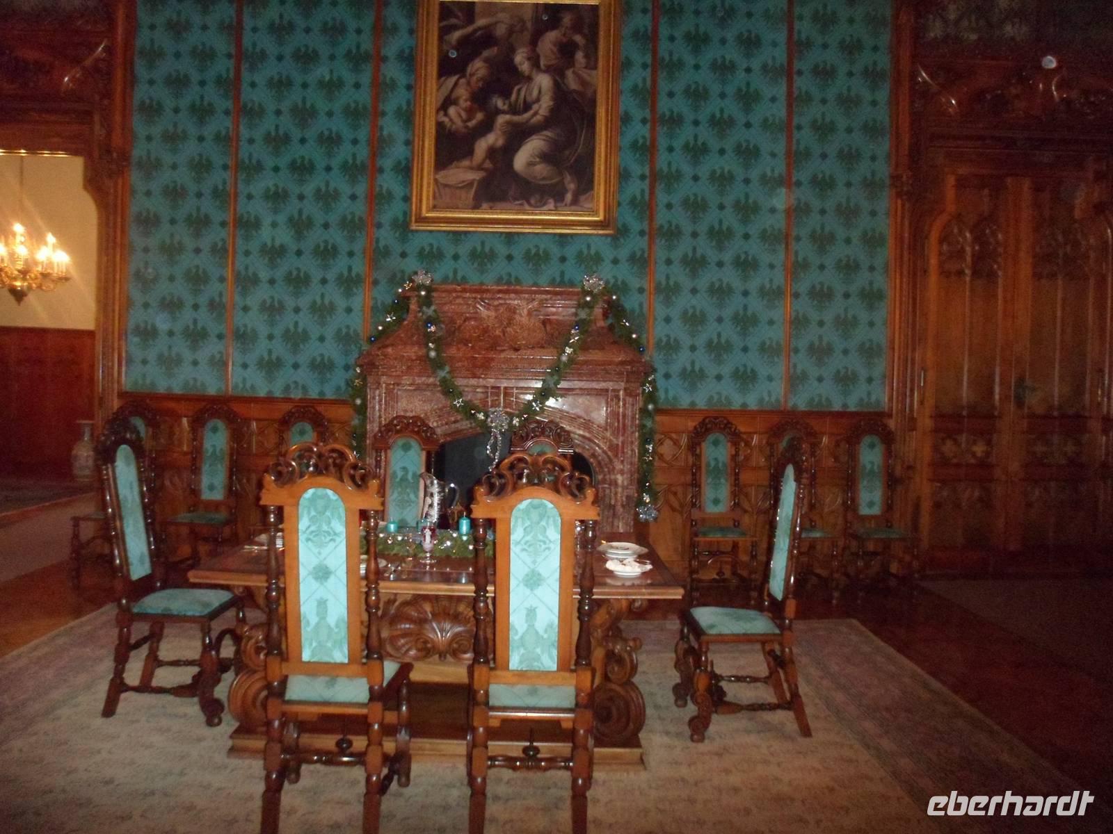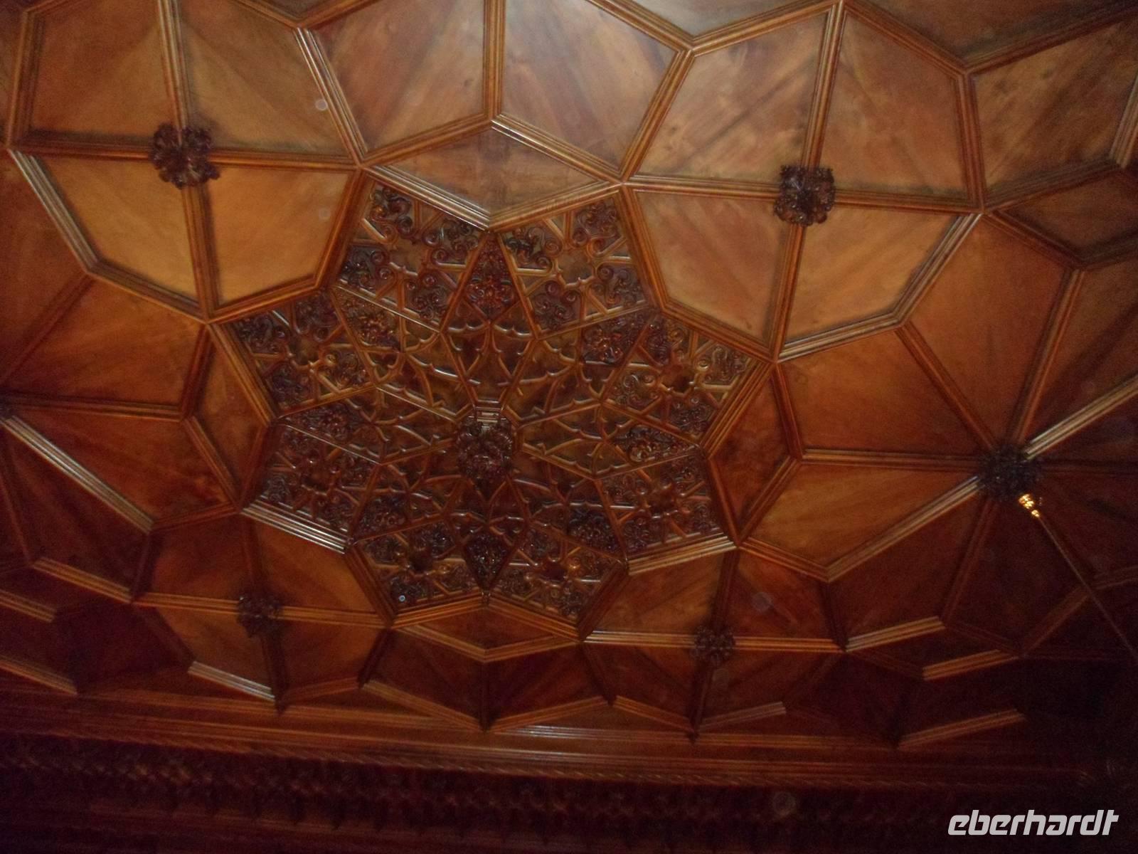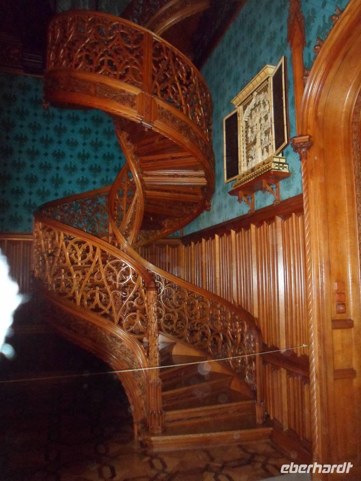 Unsere Schlossbesichtigung führte uns durch farblich unterschiedlich gestaltete Salons mit schweren Kassettendecken, sowie durch die reich mit Schnitzarbeiten verzierte Bibliothek - eine Besonderheit ist dort die sich selbst tragende kunstvolle Wendeltreppe aus Eichenholz.