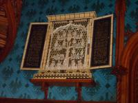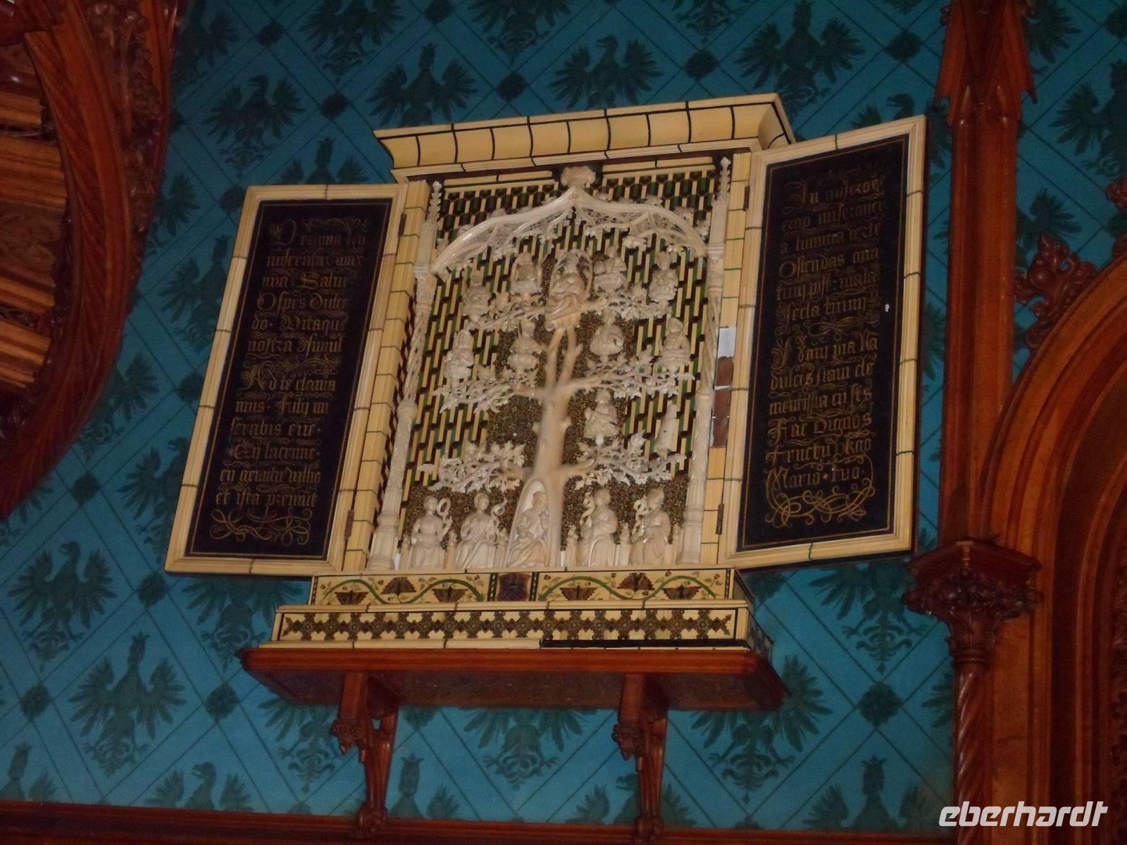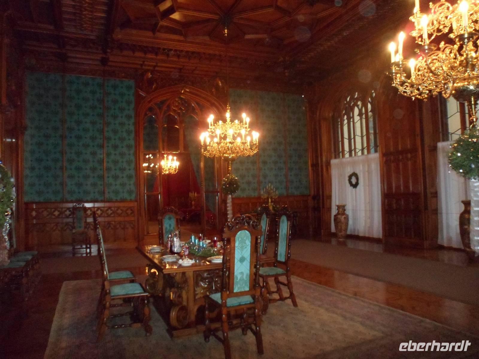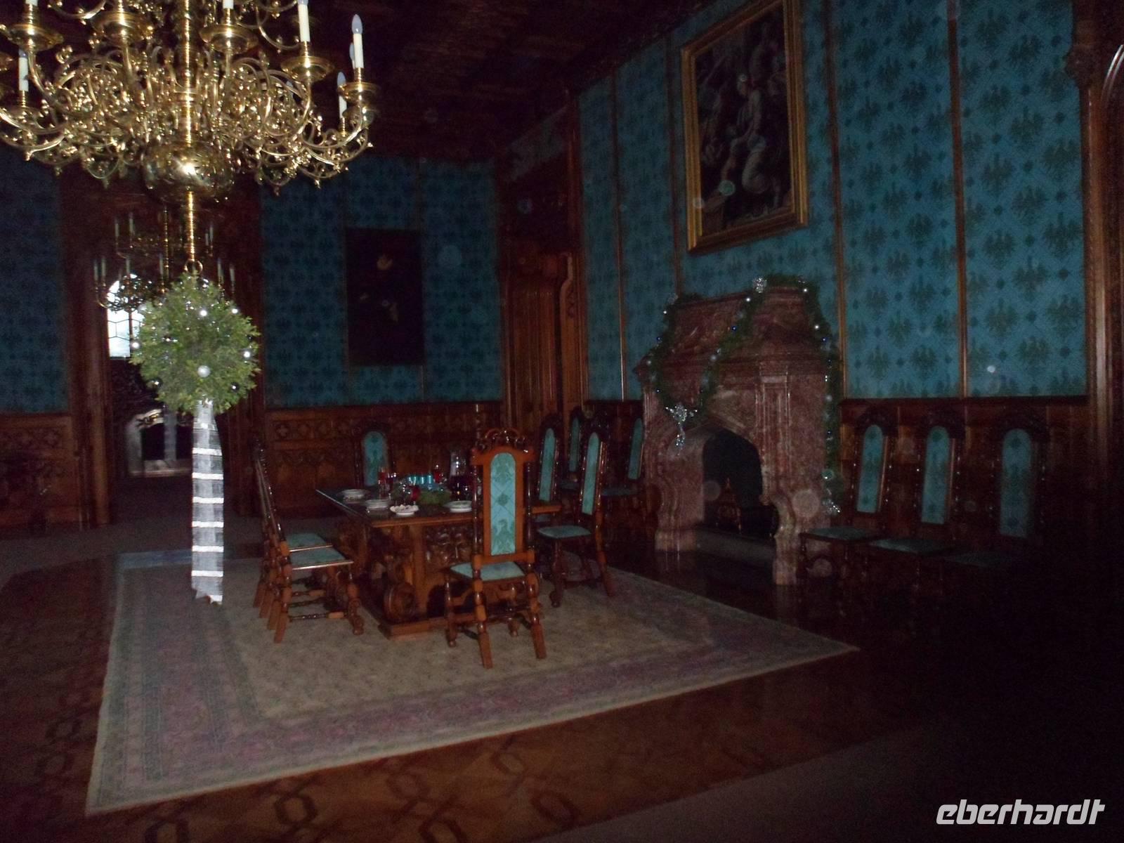 Unsere Schlossbesichtigung führte uns durch farblich unterschiedlich gestaltete Salons mit schweren Kassettendecken, sowie durch die reich mit Schnitzarbeiten verzierte Bibliothek - eine Besonderheit ist dort die sich selbst tragende kunstvolle Wendeltreppe aus Eichenholz.