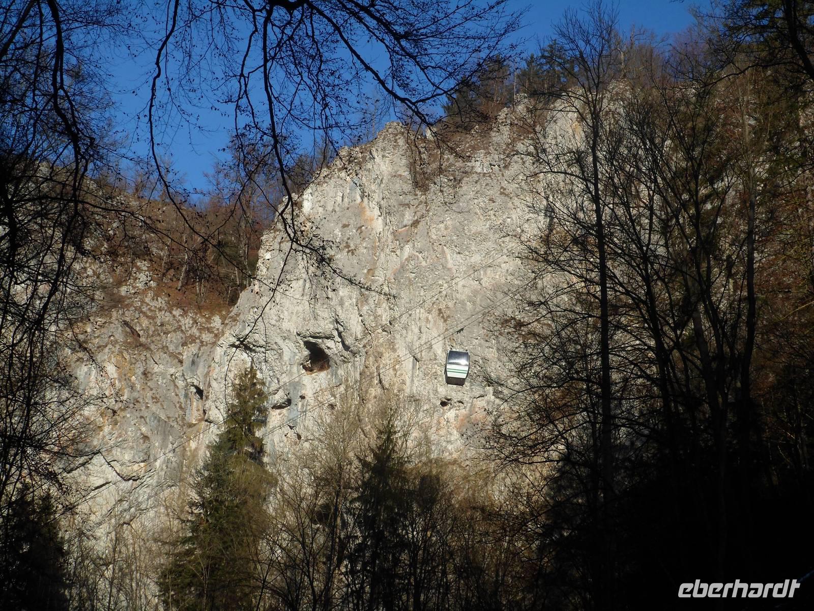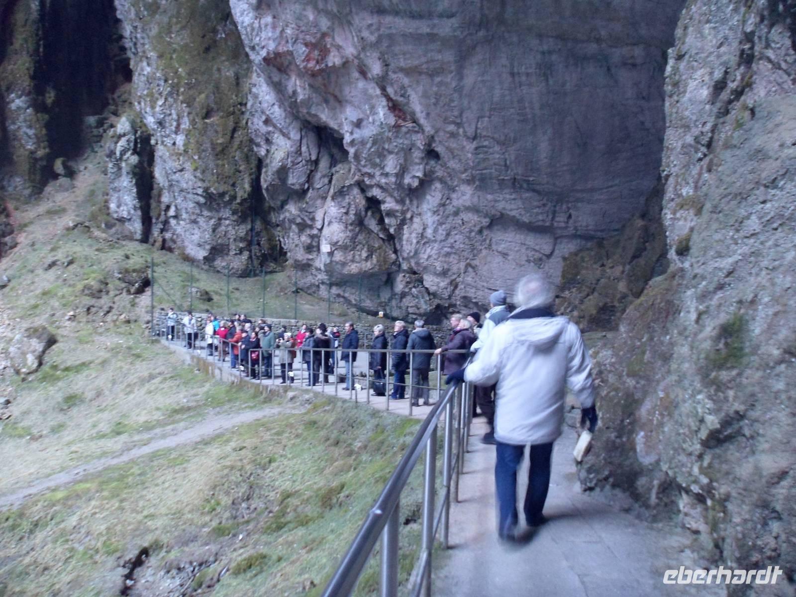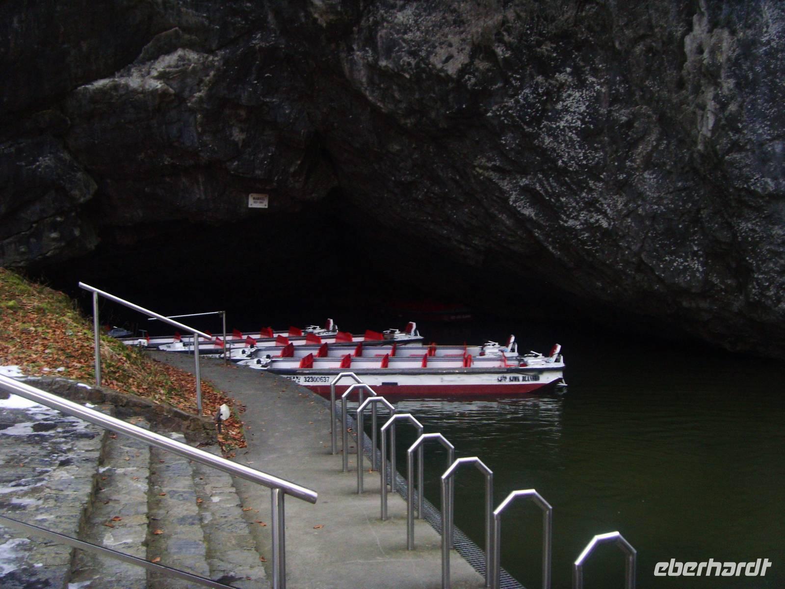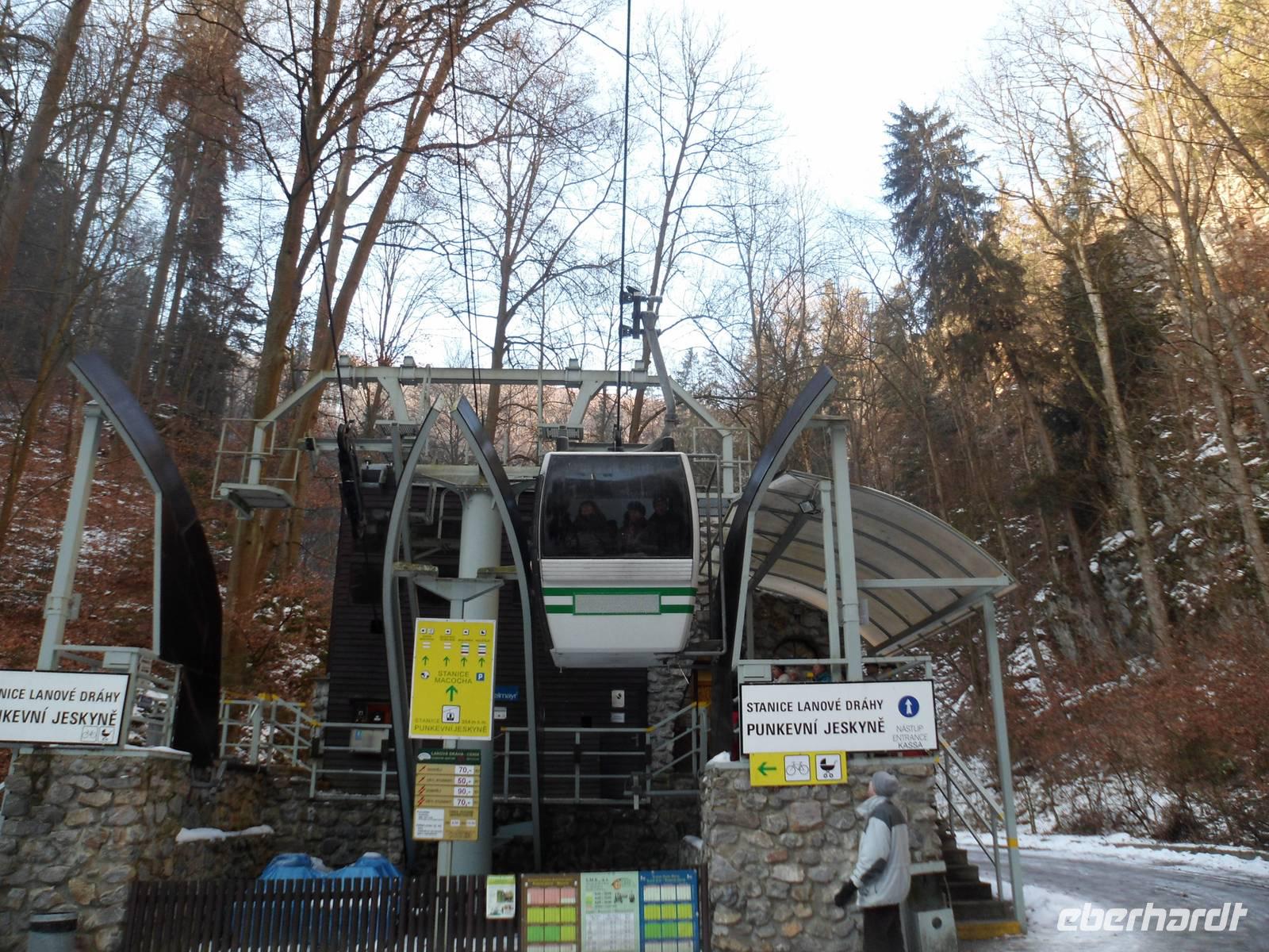 Unser Weg führte uns wieder ins Innere der Höhle. Hier warteten schon die Kähne auf uns. Die 450 m lange Bootsstraße auf dem Punkvafluss war für uns ein unvergessliches Erlebnis. Highlight war die Besichtigung des Masaryk Doms mit herrlichen weißen Tropfsteinformationen. Weiter fuhren wir mit dem Boot bis zum Ausgang (an der Höhlendecke hingen kleine Fledermäuse). Hier erwartete uns herrlicher Sonnenschein, genau passend für die Fahrt mit der Seilbahn zur Anhöhe über den Höhlen. Von der Aussichtsplattform konnten wir einen Blick in die Schlucht wagen, wo wir noch vor wenigen Minuten standen.