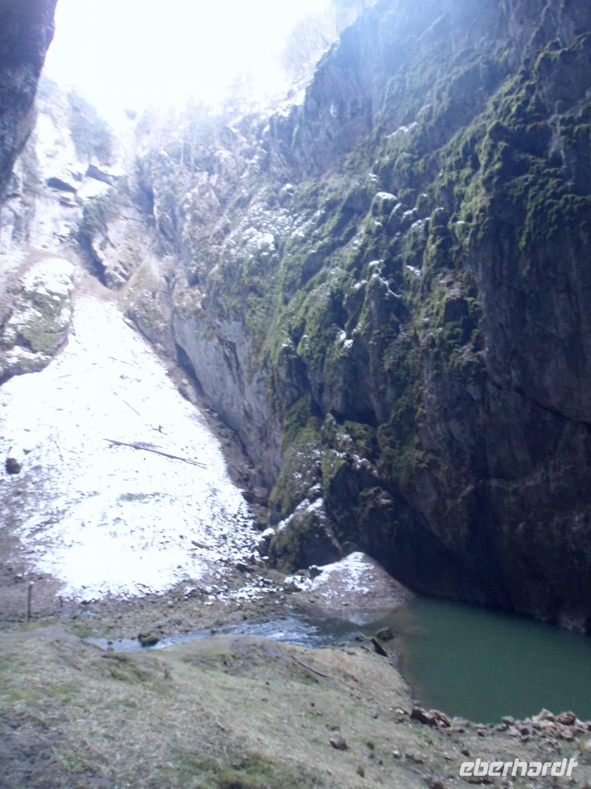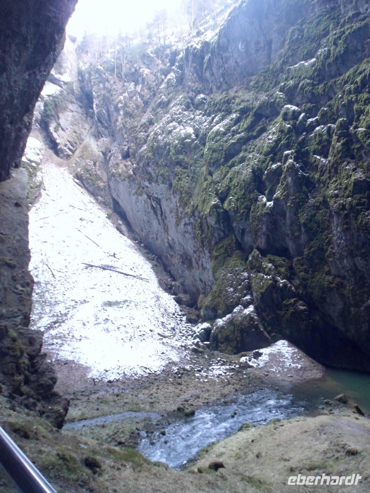 Unser Höhlenweg endete am Grund der moosbewachsenen Macocha Schlucht. Gewaltige Felswände ragten zum Himmel. Ihren Namen bekam die Schlucht einer Legende nach von einer bösen Stiefmutter (Macecha), sie wollte hier ihr Stiefkind entsorgen, welches aber zum Glück von einem gutmütigen Holzfäller gerettet wurde. Tatsache ist aber, dass die Schlucht durch den Deckeneinsturz einer mächtigen Karsthöhle entstand.