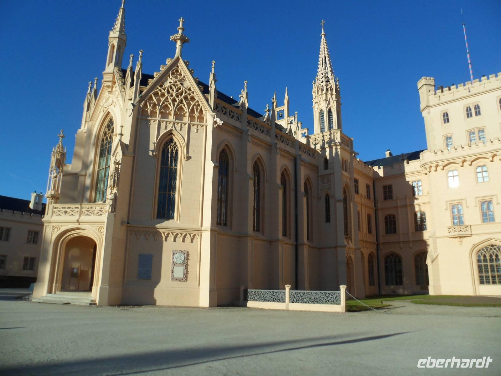 Sie liegt nur etwa 2 km von der österreichischen Grenze entfernt. Hoch über der Stadt thront das riesige Schloss und etwas abseits auf dem heiligen Berg sahen wir die kleine Wallfahrtskirche St. Sebastian. Nach einem kleinen Rundgang durch die Stadt Mikulov fuhren wir weiter vorbei an der Weinstadt Valtice nach Lednice.