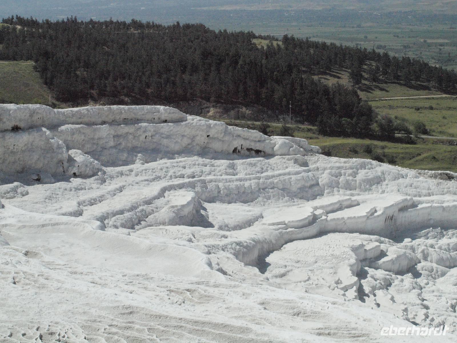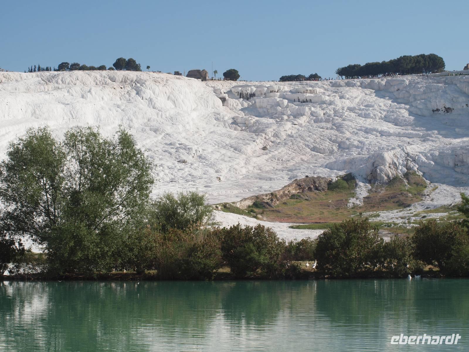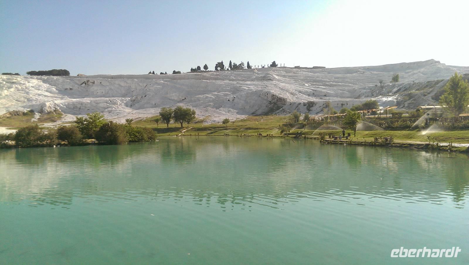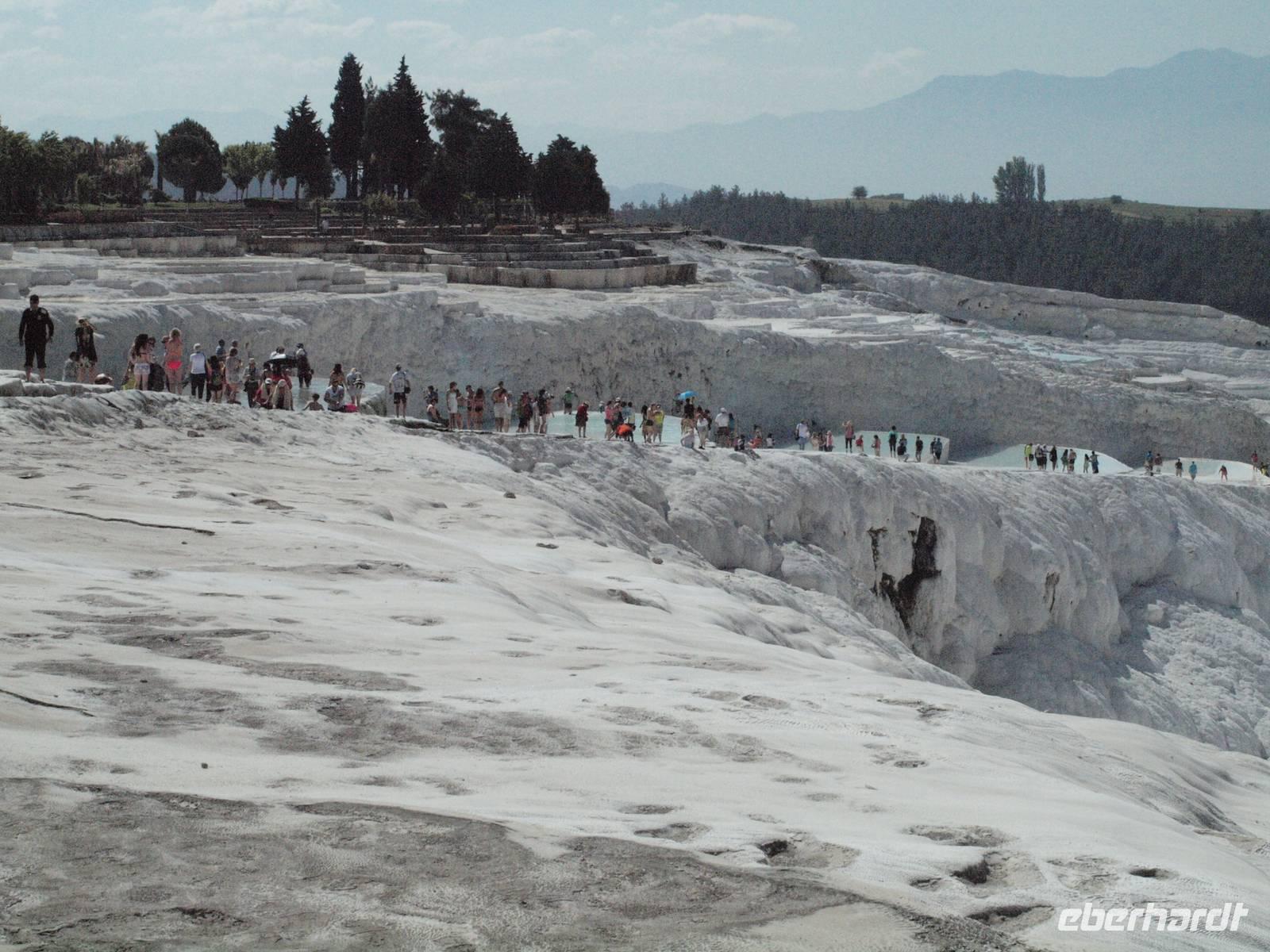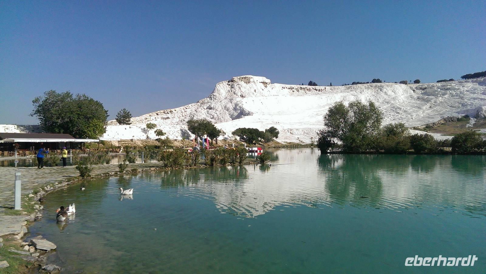 Am letzen Tag unserer Rundreise stehen die Kalksinterterassen von Pamukkale auf dem Programm. Wir beginnen unsere Tour mit einem kleinen Spaziergang, wo uns Serdar die Geschichte um die Entstehung und die Bedeutung der kalkhaltigen Thermalquellen erklärt.