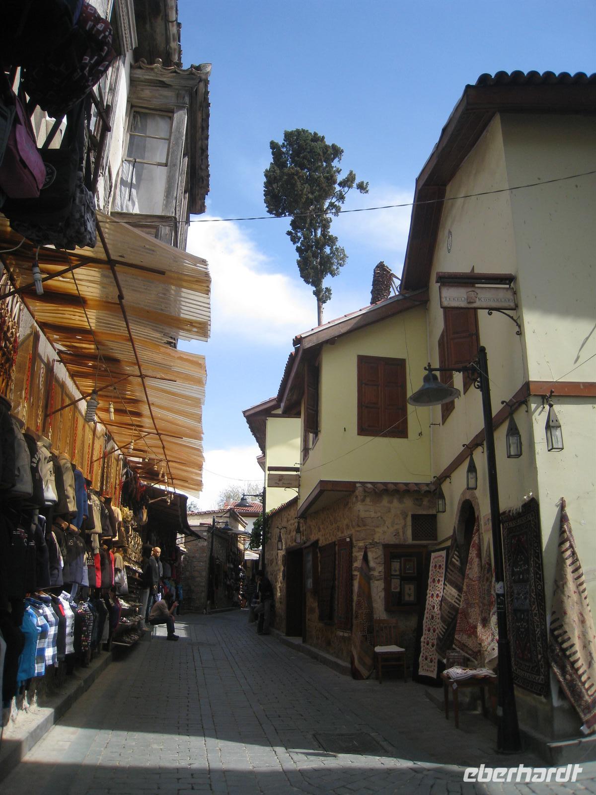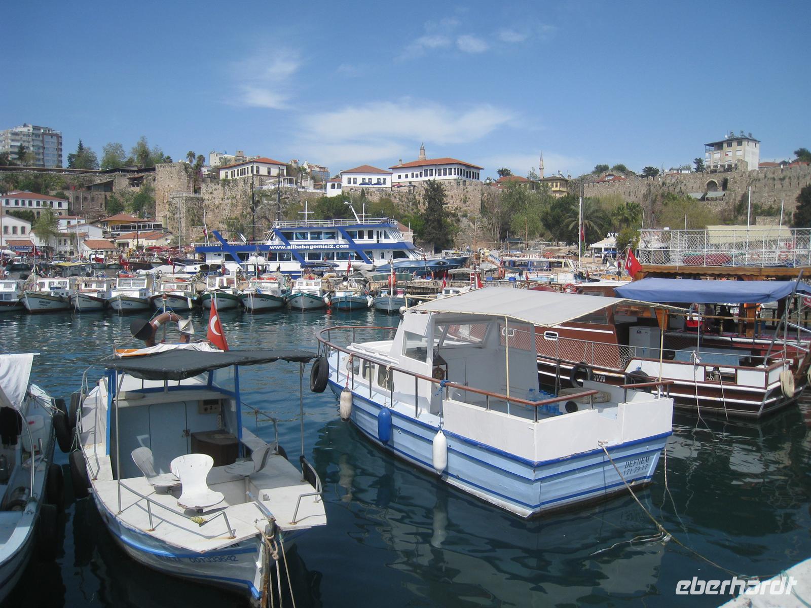 Der einzige Schlechtwettertag der Reise ließ uns nicht unter einem Zeltdach vis a vis der Festung Platz nehmen, sondern im naheliegenden Restaurant und frischen gebratenem Fisch genießen. An den großen türkischen Badeorten, wie Alanya, ging es dann zurück nach Antalya. Im großen Nordbogen machten wir eine Orientierungsfahrt durch die Stadt; vorbei an kurdischen Vorstädten, dem riesigen Universitätsgelände, modernen Wohn- und Geschäftshäusern und immer mal wieder heran ans Mittelmeer, natürlich auch vorbei an Märkten, ehemaligen Basaren, dem Hadrianstor und Ausblicken zur Altstadt mit Hafen und Zitadelle.