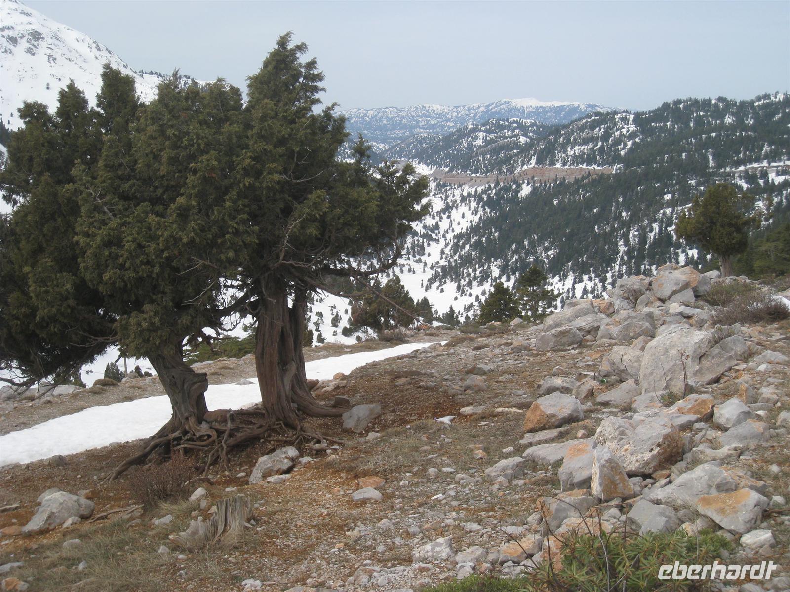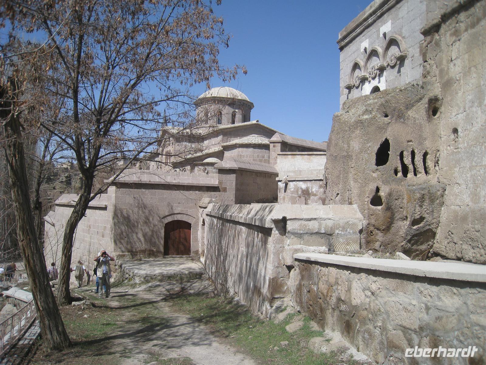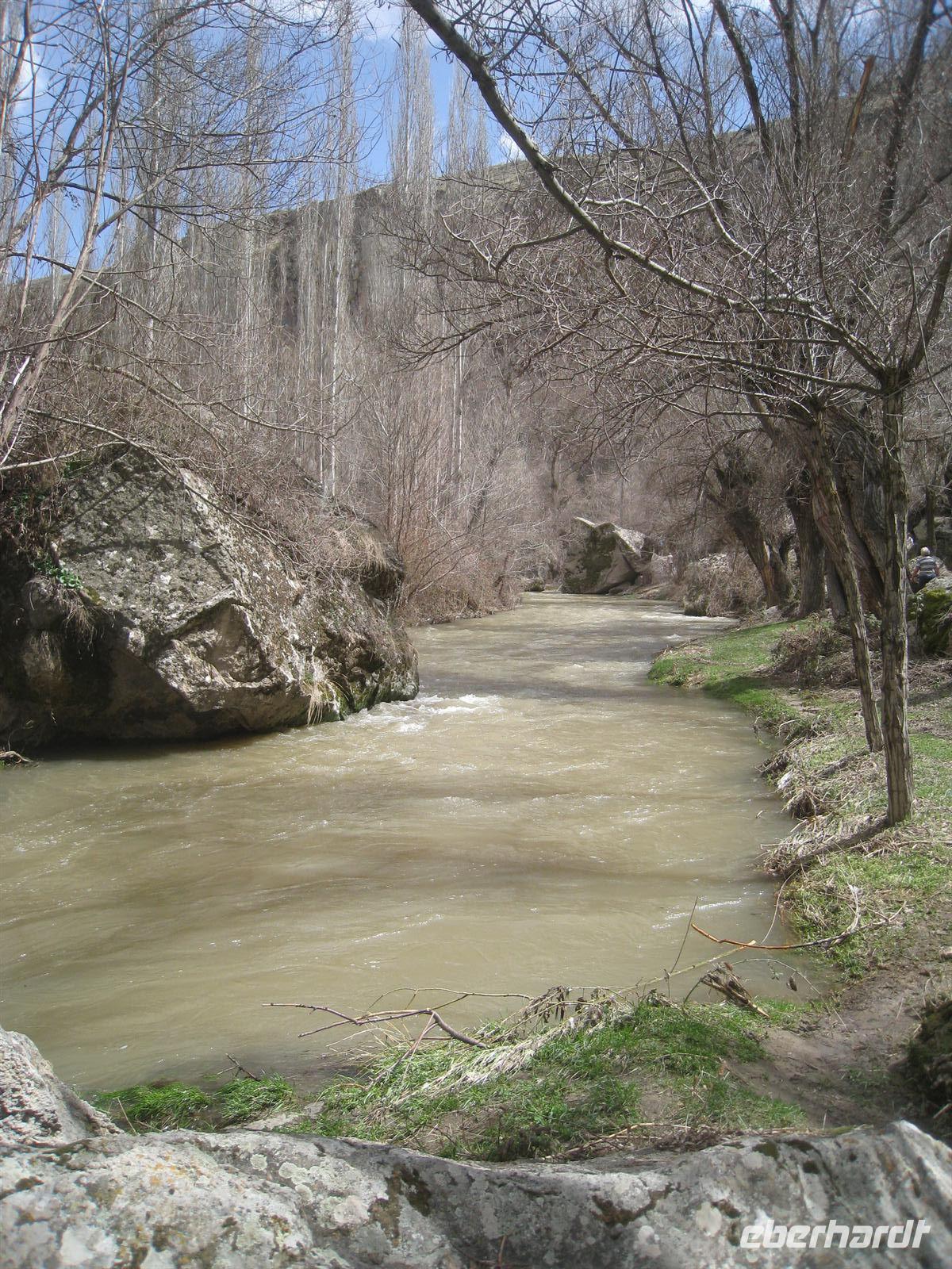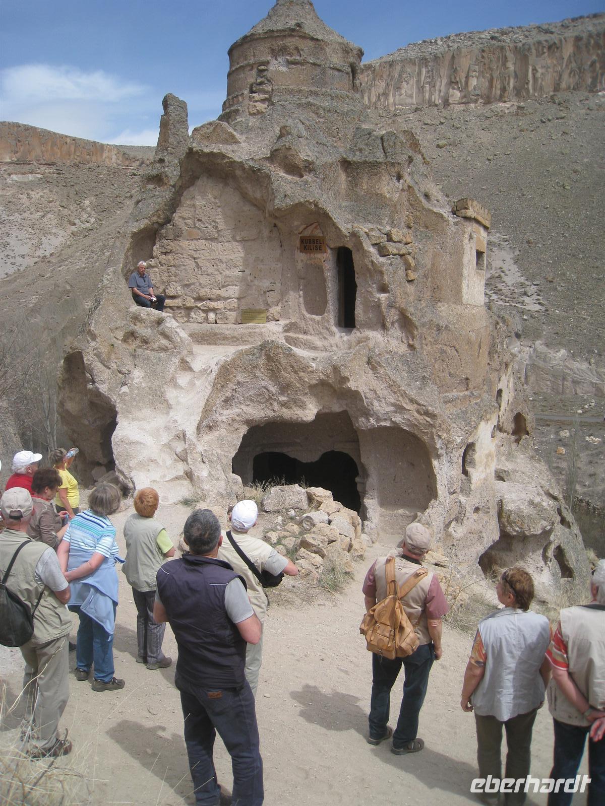 Heute stand der Südwesten Kappadokiens auf dem Programm. Fast 1,5 Stunden ging es in Richtung des schneebedeckten 3226 m hohen Hassan-Berges. Im Vorgebirge querten wir bei Ciftlike einen Pass in 1700 m Höhe und fuhren zur Roten Kirche, der wohl ältesten christlichen Kirche Kappadokiens. Auch die Wissenschaftler bewegt die Frage, ob sie byzantinischen, armenischen oder georgischen Ursprungs ist. Nun ging es nach Güzelyurt mit seiner, in eine orthodoxe Kirche gebauten, Moschee. Auf steilen alten Felsenwegen bestiegen wir den Dorfhang und schauten in ehemalige Felsenwohnungen und auf dörfliches Leben. Gegen Mittag trafen wir im Ilhara-Tal ein. Zunächst standen wir an der Kante eines Canyons und blicken in die Tiefe des Tales. Tief unten am Bachbett angekommen, machten wir nach dem Mittagessen einen Osterspaziergang durch die noch nicht grüne, oasenartige Landschaft, eingezwängt in steile Felswände.