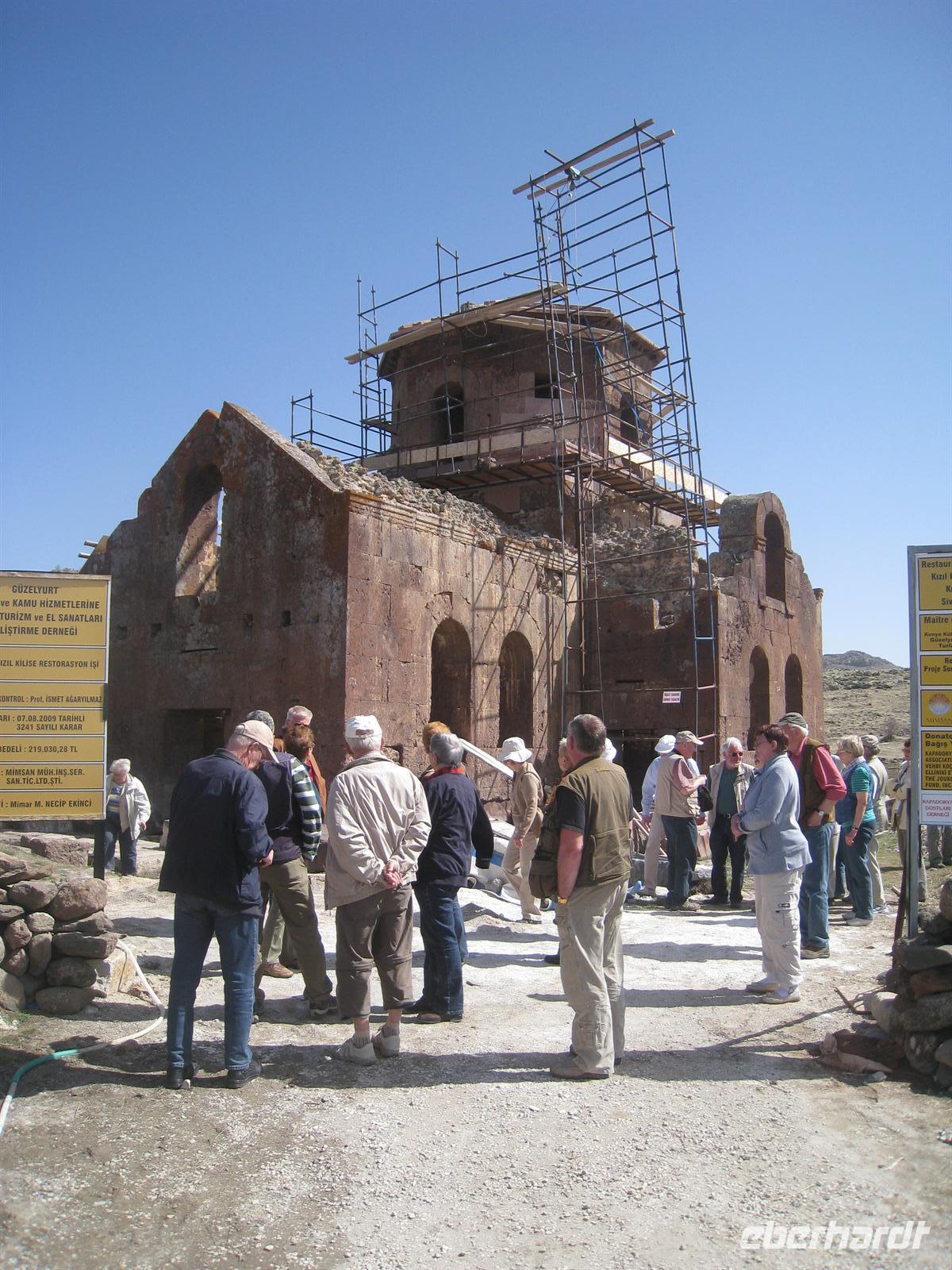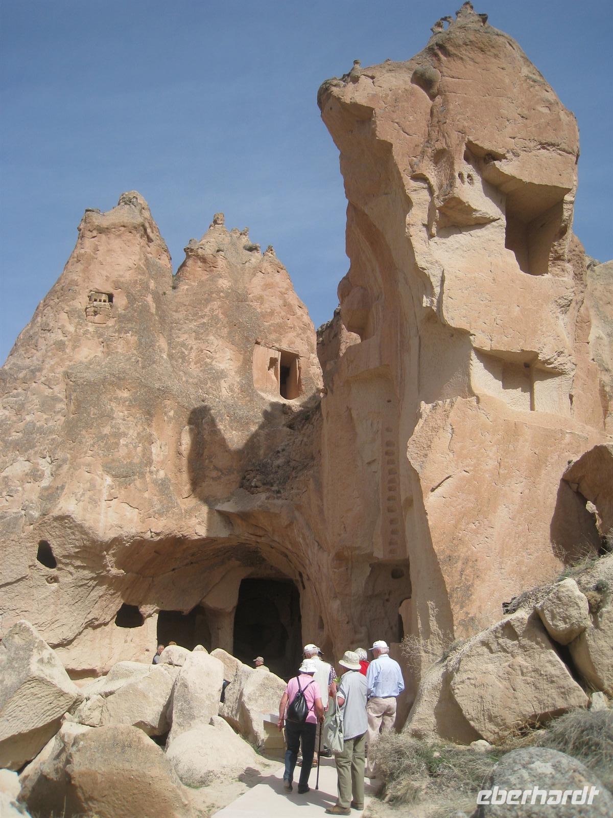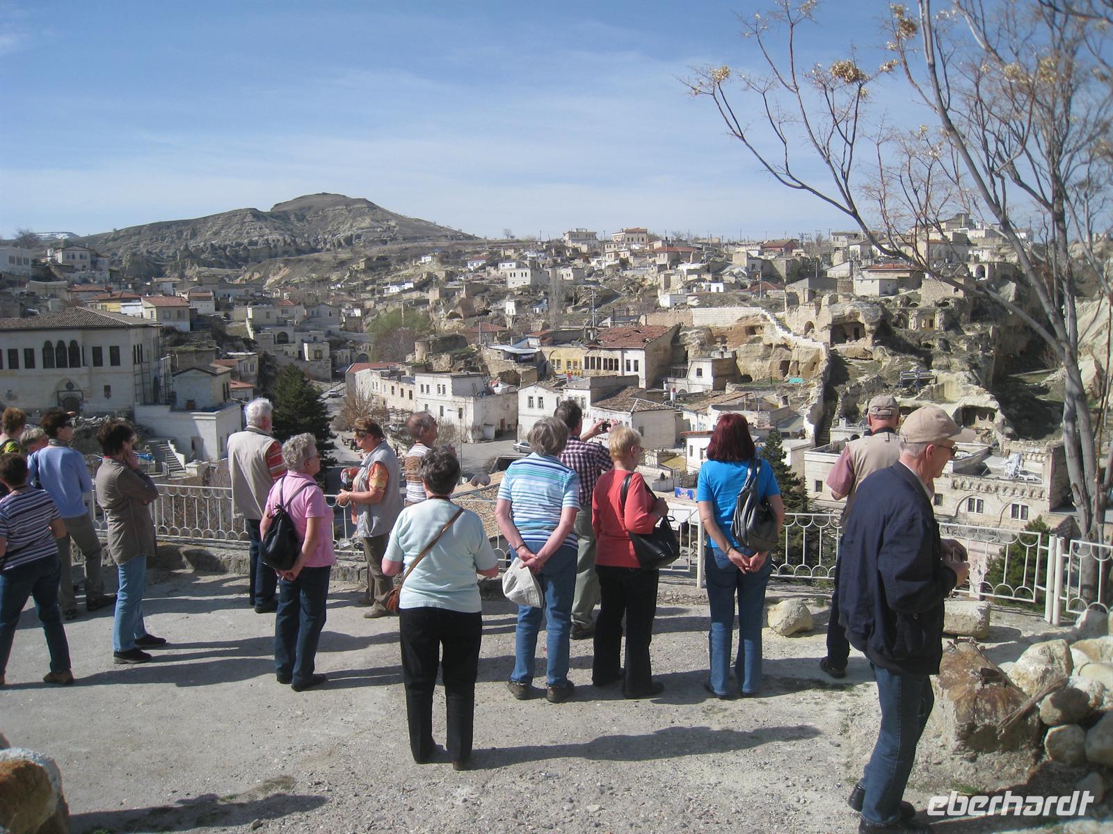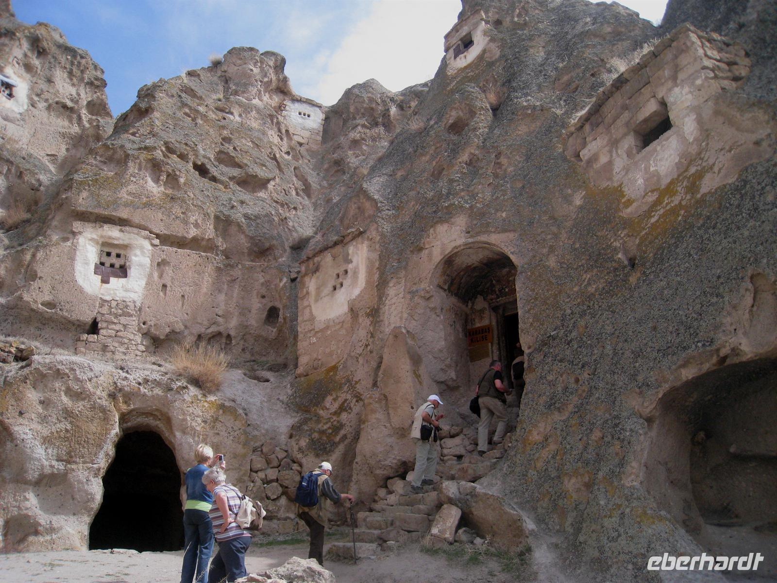 Der Muezzin weckte gegen 5:00 Uhr nicht nur die Ballonfahrer… Diese erlebten dann aber eine imposante Ballonfahrt mit Tiefblick auf die Tuffsteinlandschaft Kappadokiens. Gemeinsam ging es nach dem Frühstück zunächst nach Altürgüp, wo wir Felsenwohnungen der ehemals zumeist griechischen Bevölkerung sahen. Anschließend begannen wir den südöstlichen Teil Kappadokiens zu erkunden. Der Weg führte über Mustafapasa, dem ehemaligen Sinassos, einem Ort mit griechischer Bevölkerungstradition bis 1923. Weiter ging es nach Süden über eine Hochebene mit Blick auf schneebedeckte Berge in der Ferne bis Sorganli. Unsere kleine Wanderung begannen wir nochmals mit einem gedanklichen Abstecher in die Wege der Menschwerdung und Besiedlung. Dann ging es im Tal zu ehemaligen Felsenkirchen und vorbei an Höhlennistplätzen der hier zum Zwecke der Naturdüngerproduktion gehaltenen Tauben. Zurück führte die meisten aus der Gruppe ein Ziegenpfad oberhalb des Tales, vorbei an alten Kirchen, Höhlenwohnungen und wieder weißglänzenden Taubenschlägen im Felsen. Ein idyllisches Gartenrestaurant unter noch kahlen Apfelbäumen war mittäglicher Ruheplatz. Der Bus brachte uns nach der körperlichen Aktivität in die unterirdische Stadt von Derinkuyu. Acht Etagen stiegen wir hinab, um Wohn- und Schlafräume, Lager, Klosterkomplex und Stallungen im Fels zu erkunden, die einst tausenden Einwohnern Schutz boten.