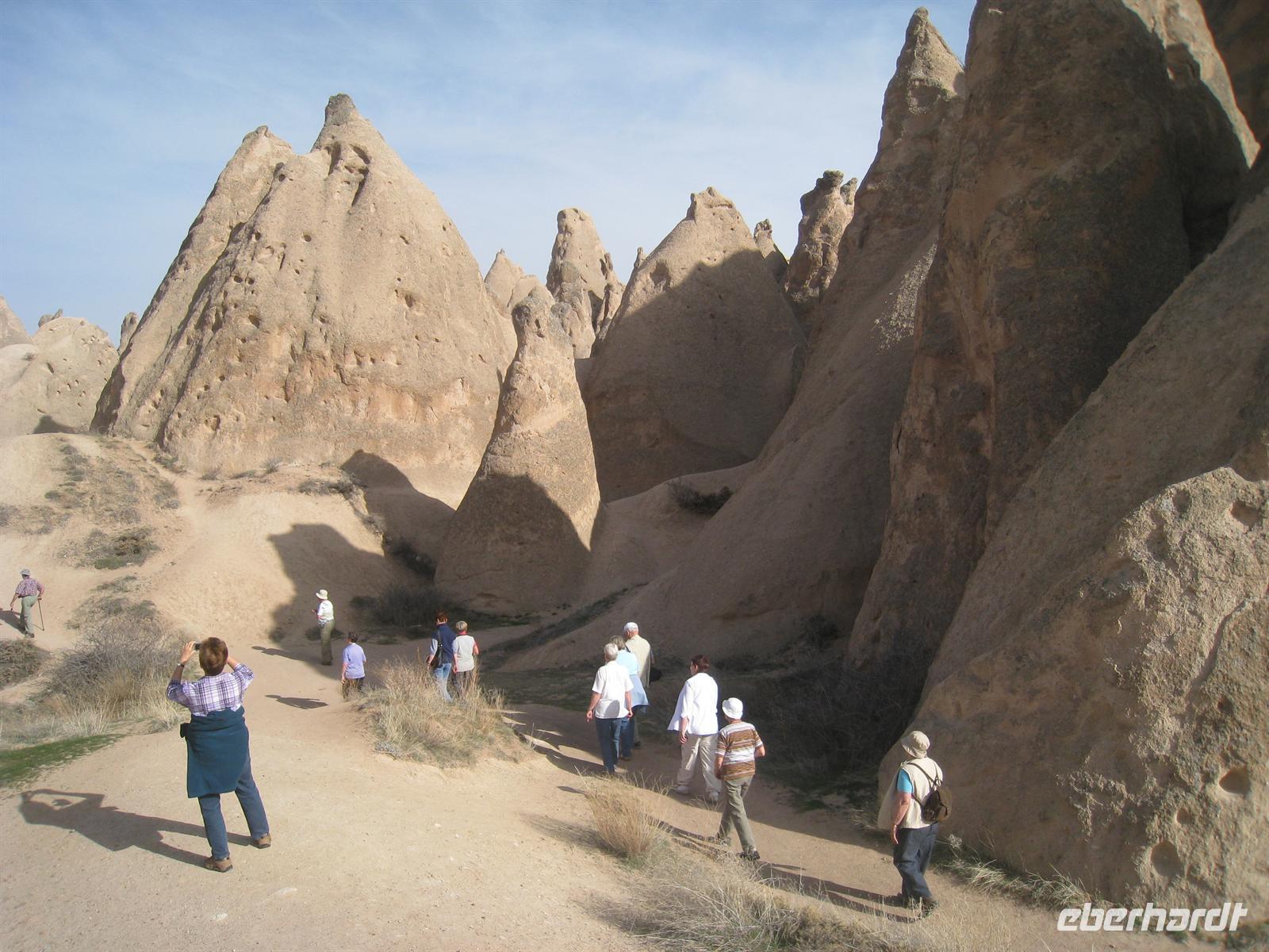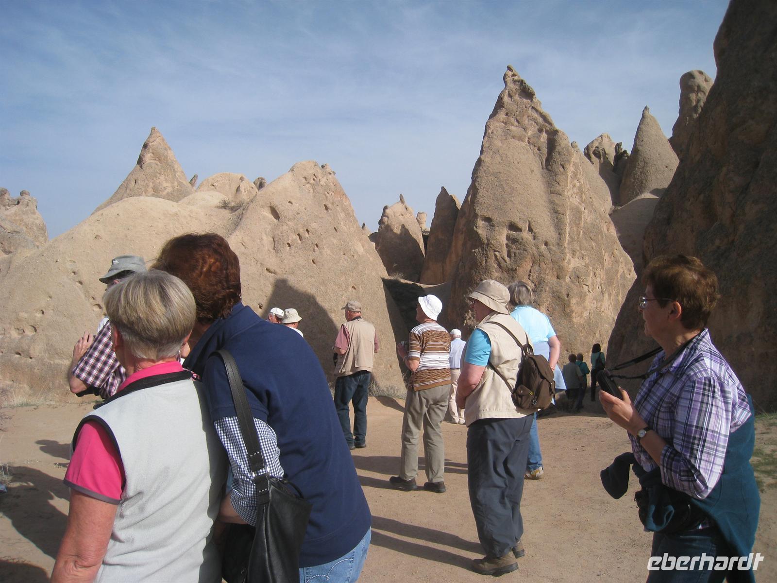 Den Tag verbrachten wir im nahen Umfeld von Göreme. Zunächst ging es in das Kameltal, wo wir über Hügelketten direkt neben den Tuffsteinkegeln kletterten. Anschließend ging es ins Zelvetal, mehrere Täler in denen einst die Menschen in Höhlenwohnungen lebten. Über neusanierte Wege gelangten wir bis zur ehemaligen christlichen Kirche im 2. Tal. Nur wenige hundert Meter entfernt befindet sich der Weinberg des Pashas - Pashabag mit den höchsten und imposantesten Feenkaminen Kappadokiens. Mancher stieg auf das weissandige Riff oberhalb der von Weingärten umgebenen Zwillings- und Drillingstürme aus Tuffstein. Noch vor dem Mittagessen besichtigten wir dann das Weltkulturerbe Göreme mit seinen vielhundertjährigen Felsenkirchen, der Apfelkirche und der Schlangenkirche.Auf unserer nachmittäglichen Weiterfahrt stoppten wir in einer Teppichkooperative, wo wir neben den bunten Teppichen auch mehr über die Bedeutung der Teppichknüpferei für die wirtschaftliche Entwicklung der Türkei erfuhren.