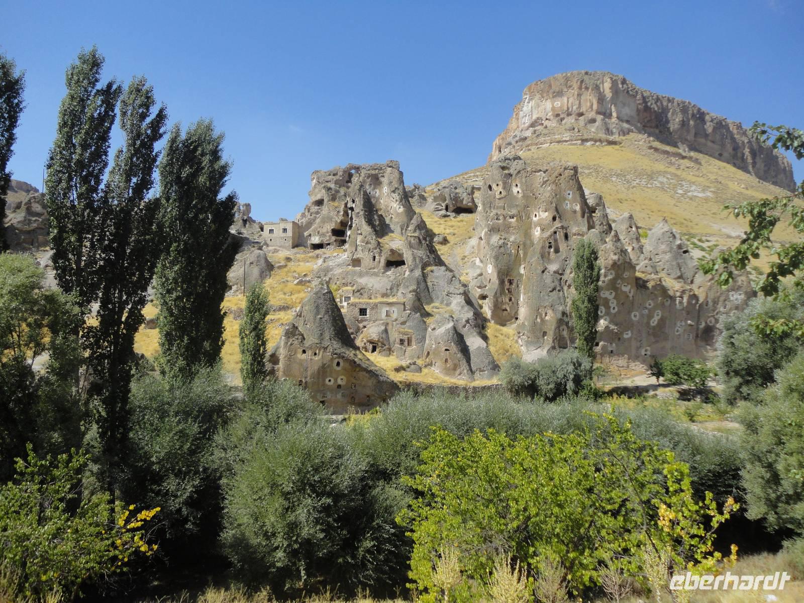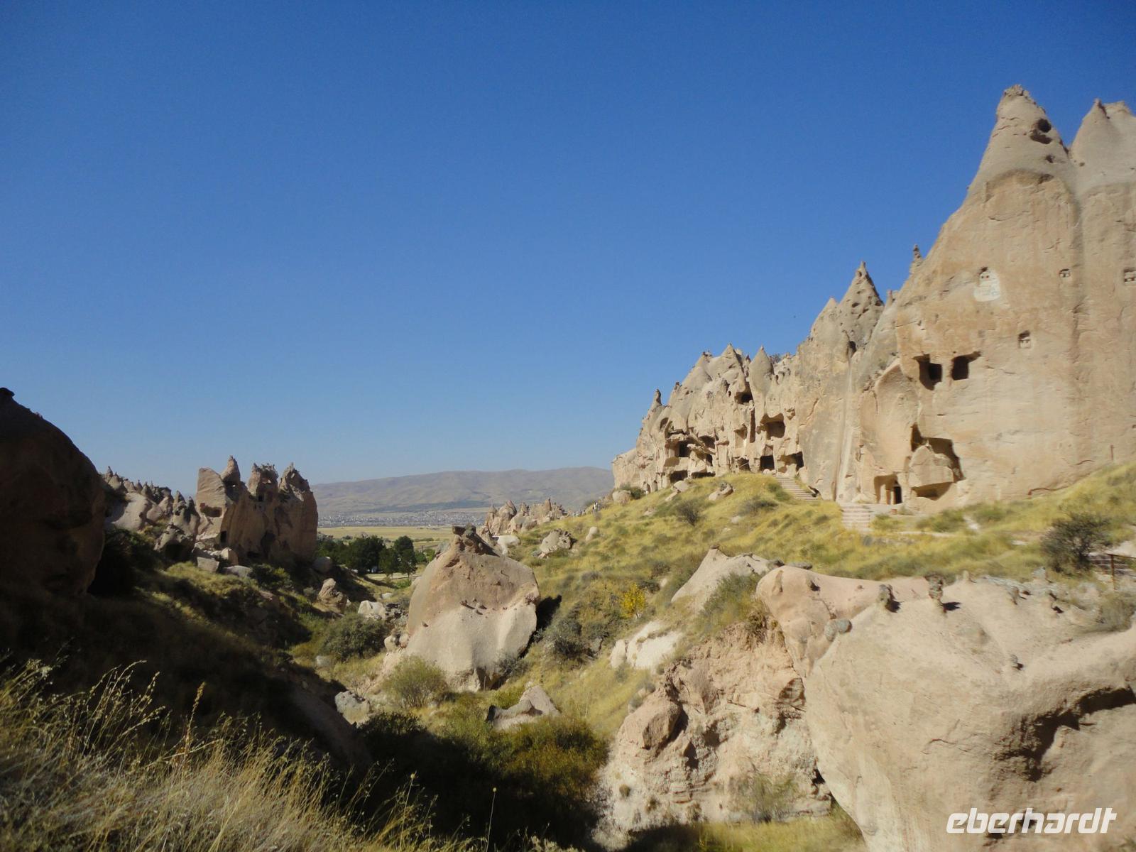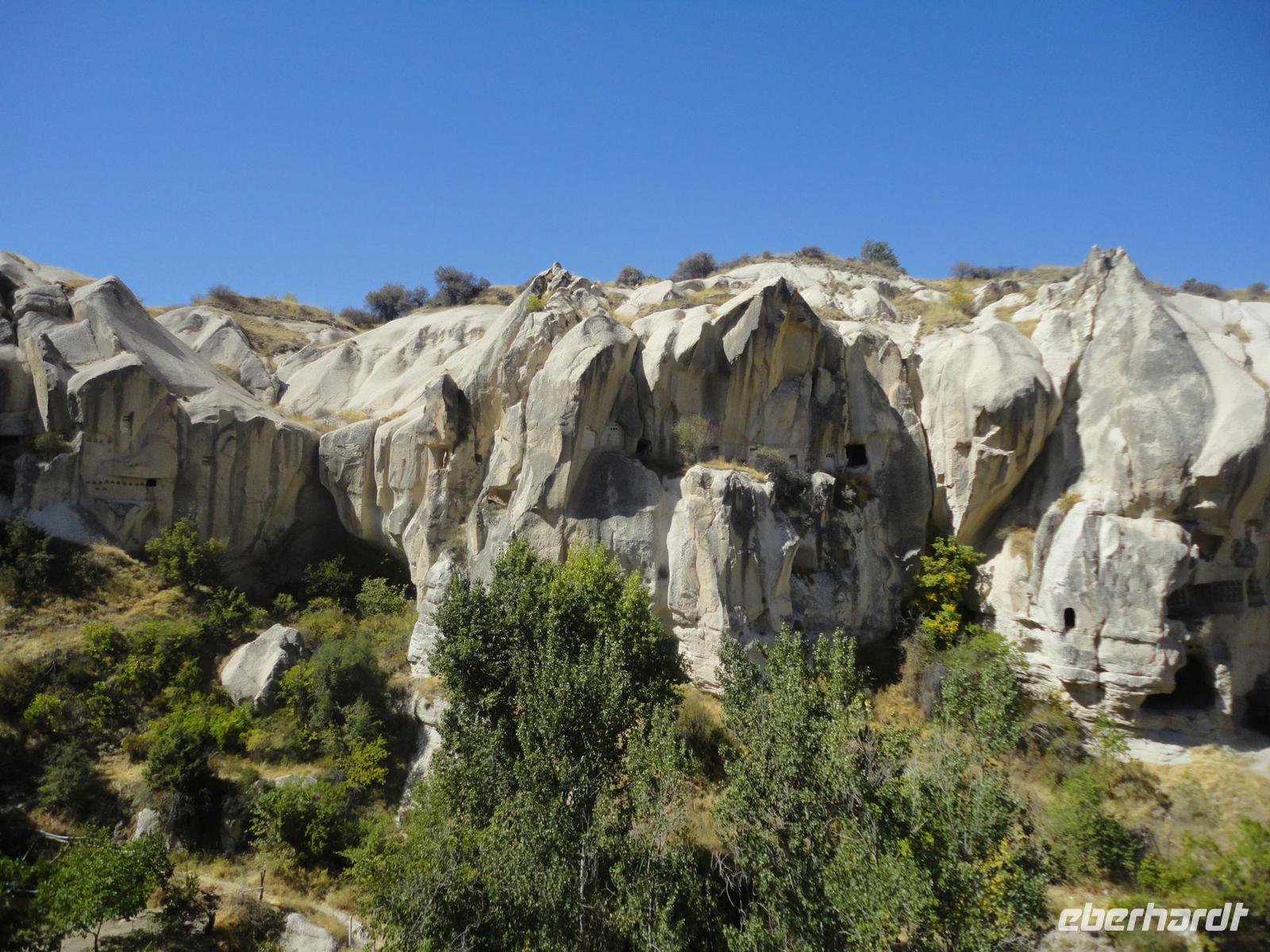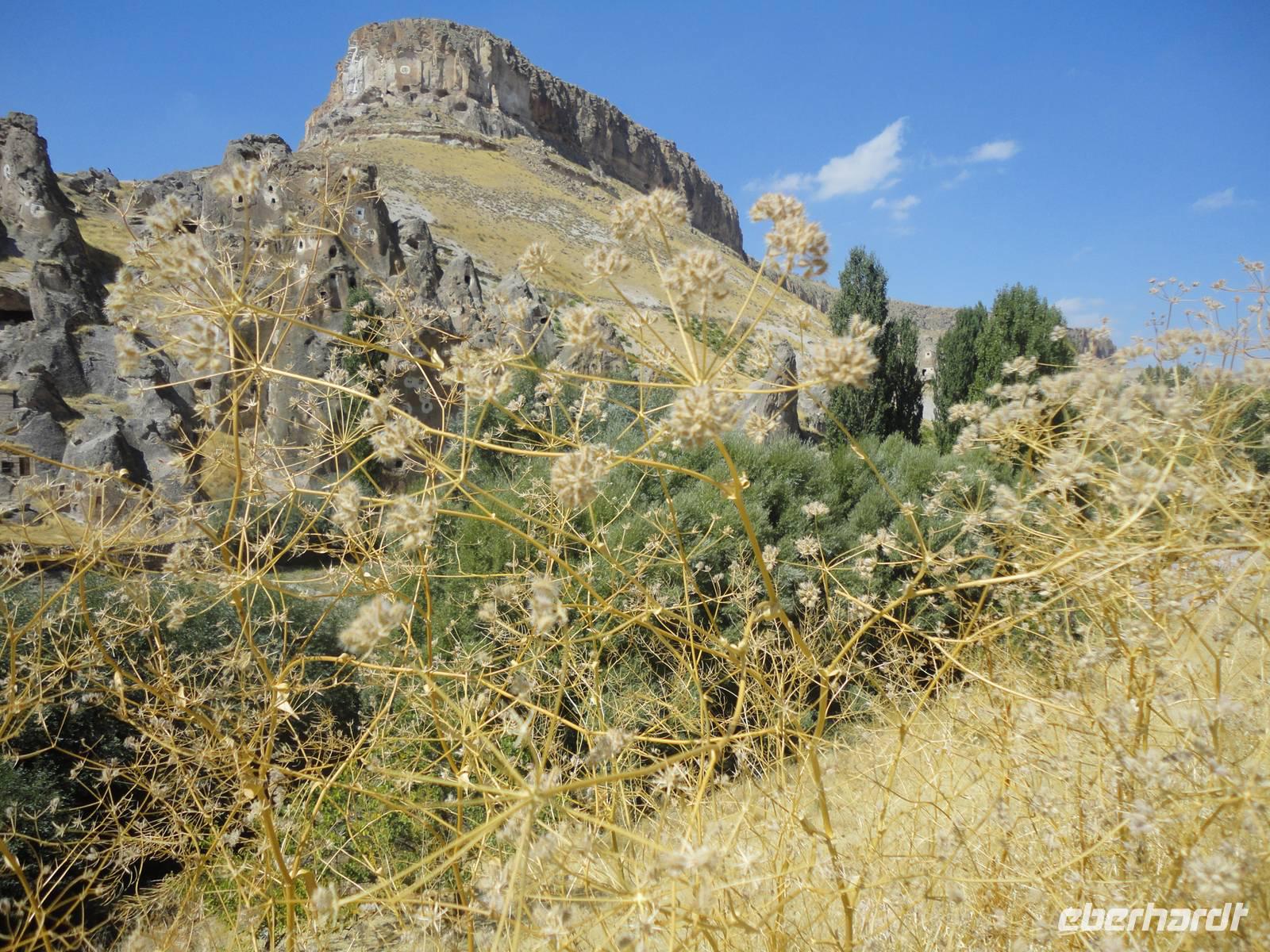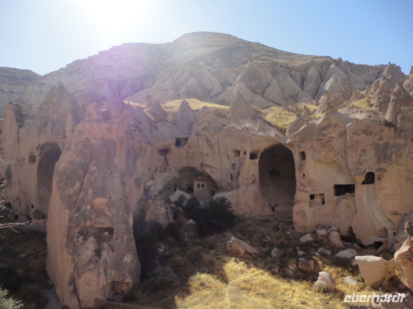 Danach fuhren wir weiter ins etwa 40 km entfernte Soganli-Tal mit seinen typischen byzantinischen christlichen Kirchen, Höhlenwohnungen und Taubenschlägen. Die Taubenschschläge im Soganli-Tal entscheiden dich von anderen durch den typischen weißen Kreis, der die Einbuchtungen umgibt. Wir hatten wieder Freizeit, um durch das Tal zu spazieren bzw. zu wandern oder klettern.