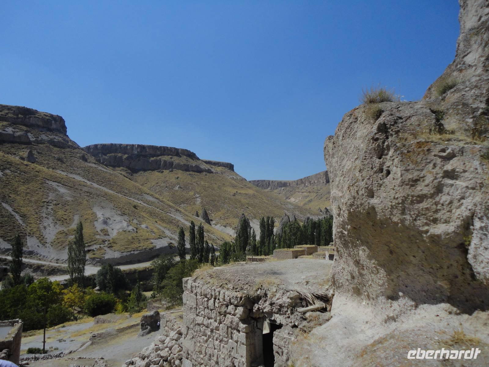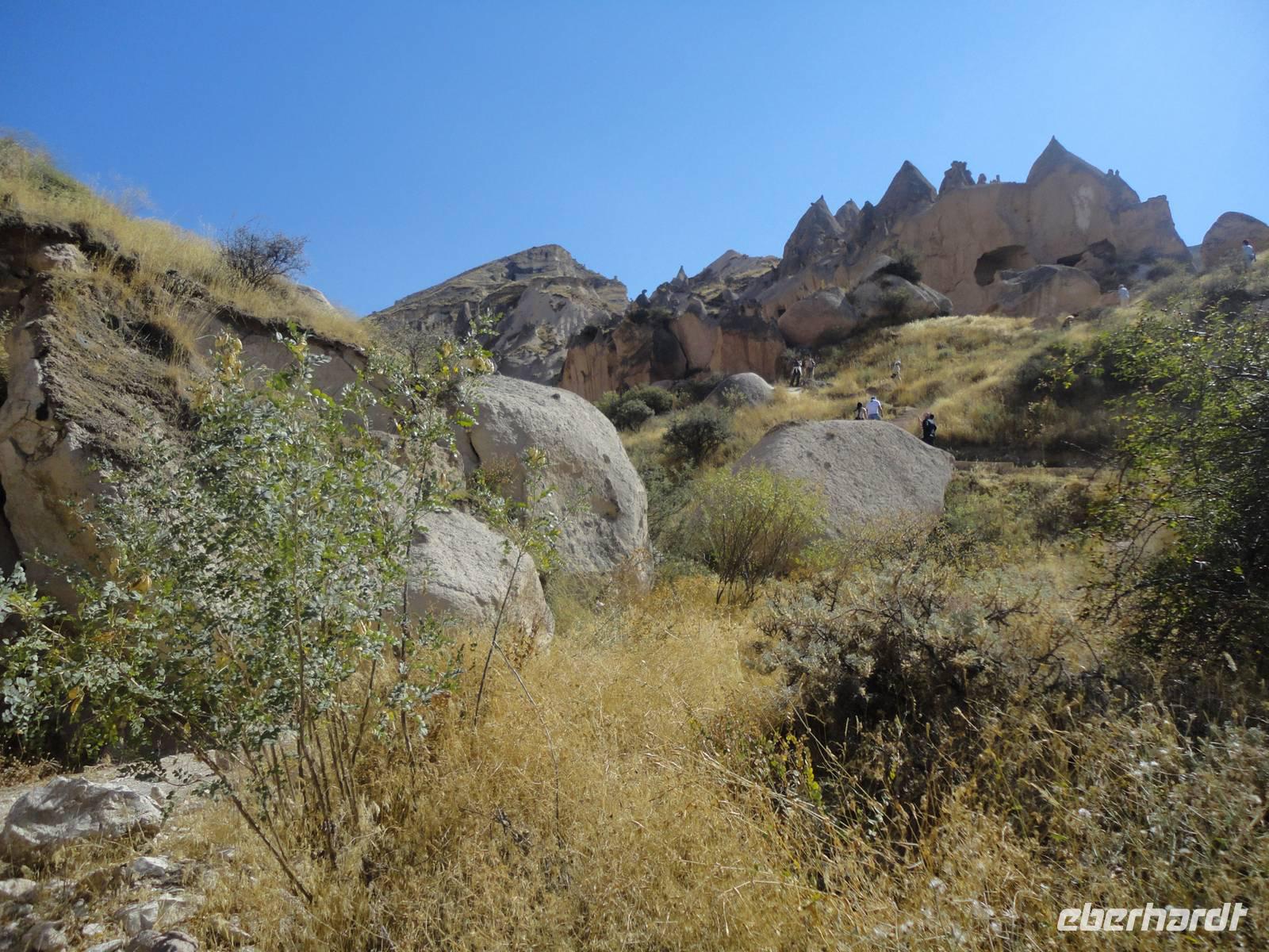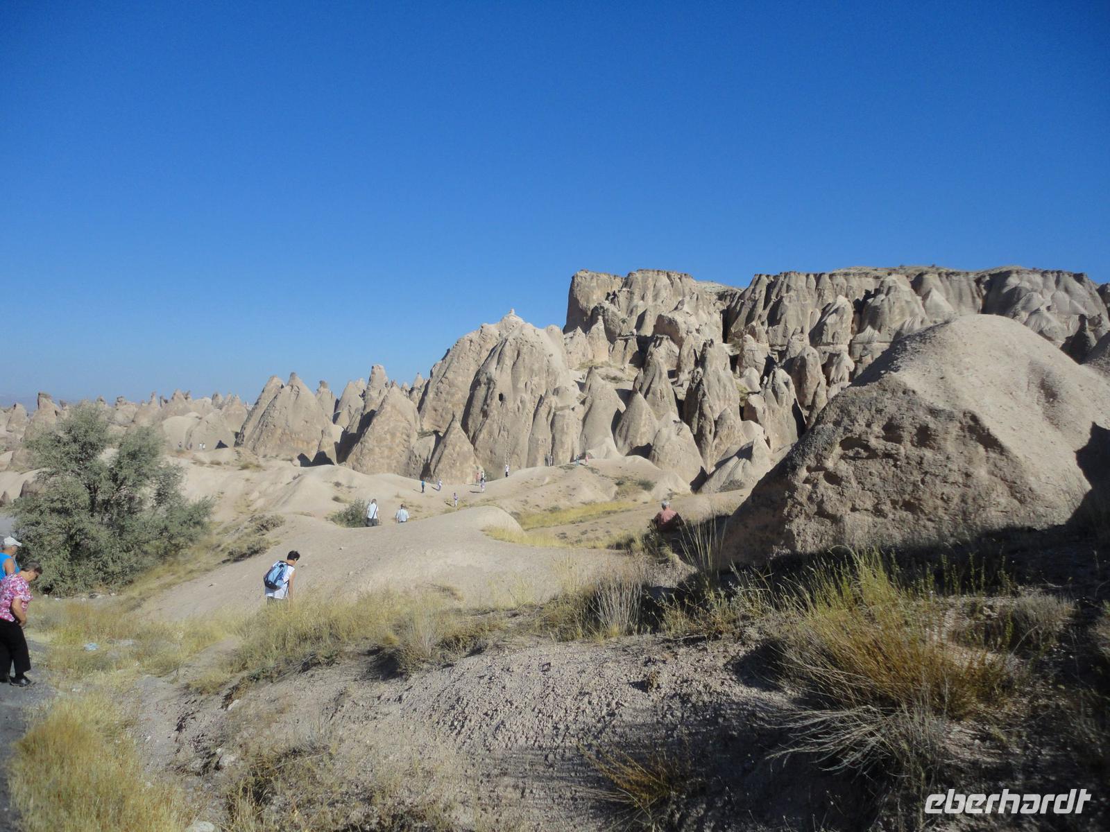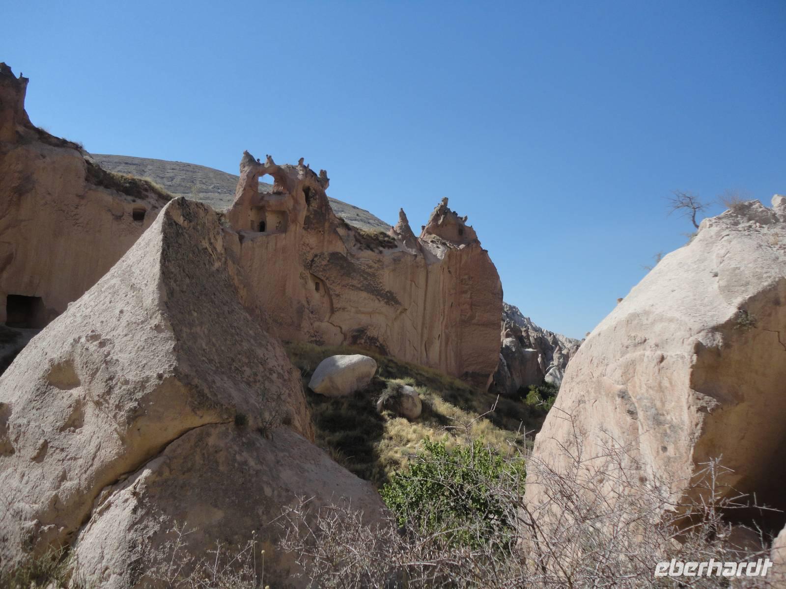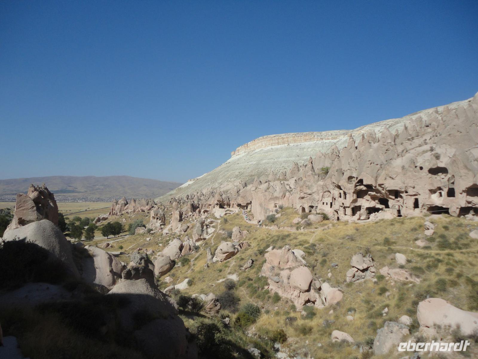 Danach fuhren wir weiter ins etwa 40 km entfernte Soganli-Tal mit seinen typischen byzantinischen christlichen Kirchen, Höhlenwohnungen und Taubenschlägen. Die Taubenschschläge im Soganli-Tal entscheiden dich von anderen durch den typischen weißen Kreis, der die Einbuchtungen umgibt. Wir hatten wieder Freizeit, um durch das Tal zu spazieren bzw. zu wandern oder klettern.