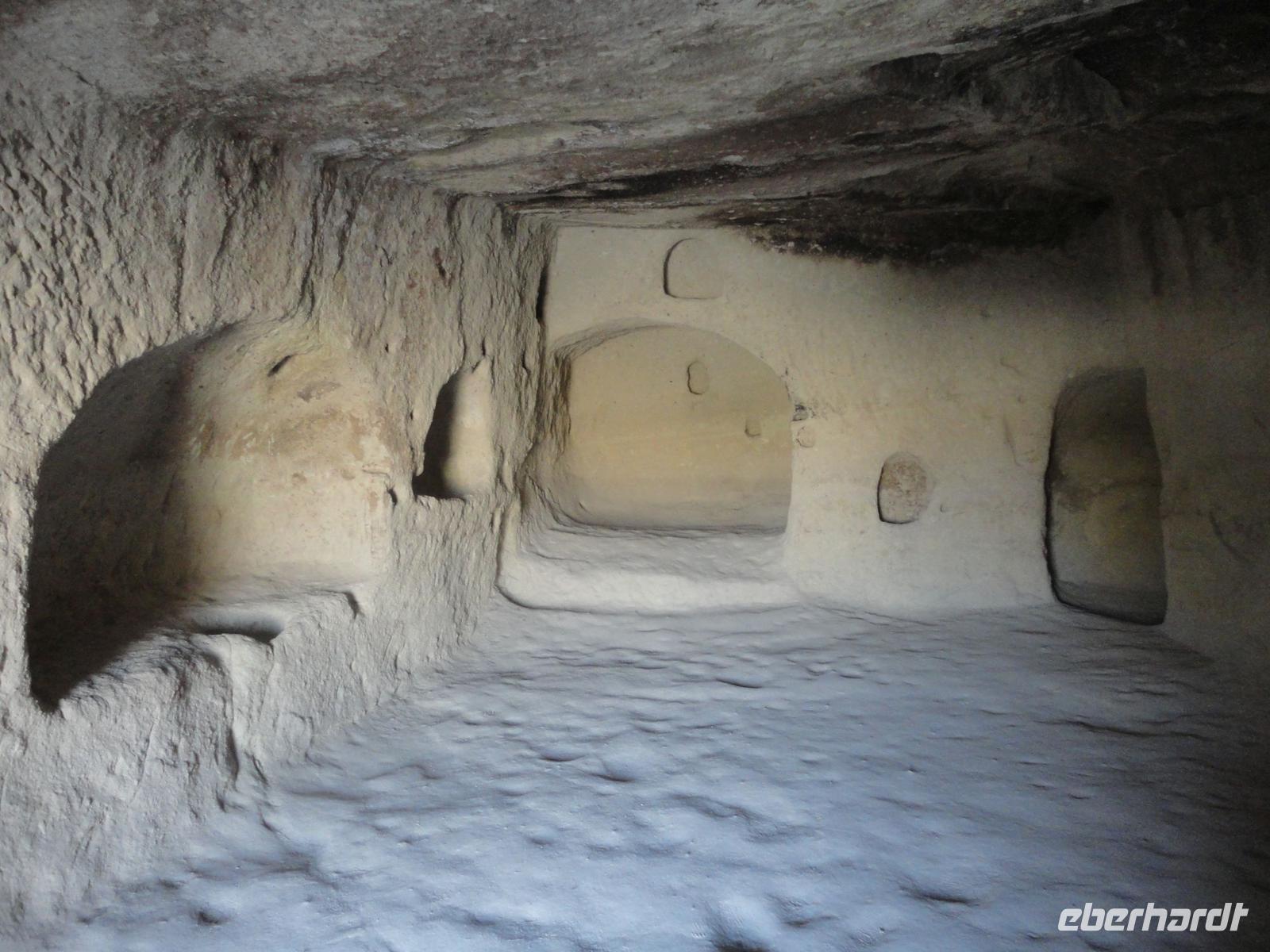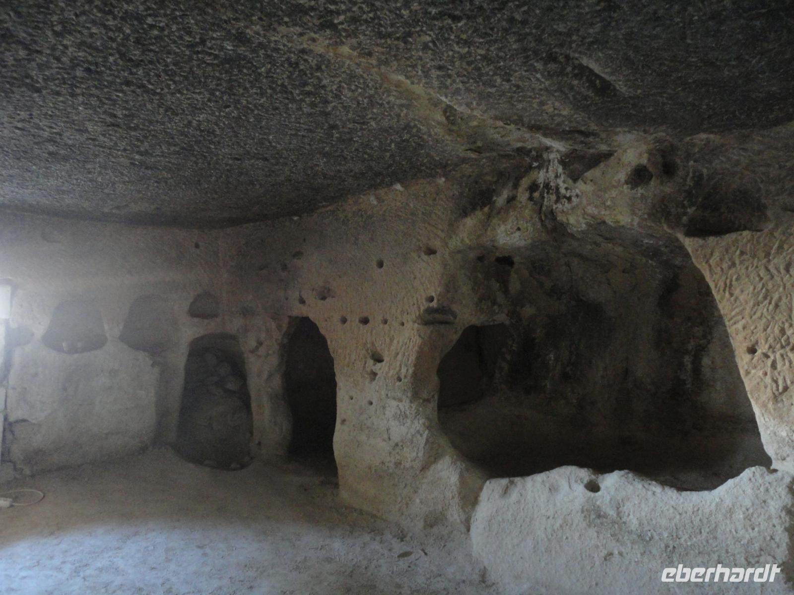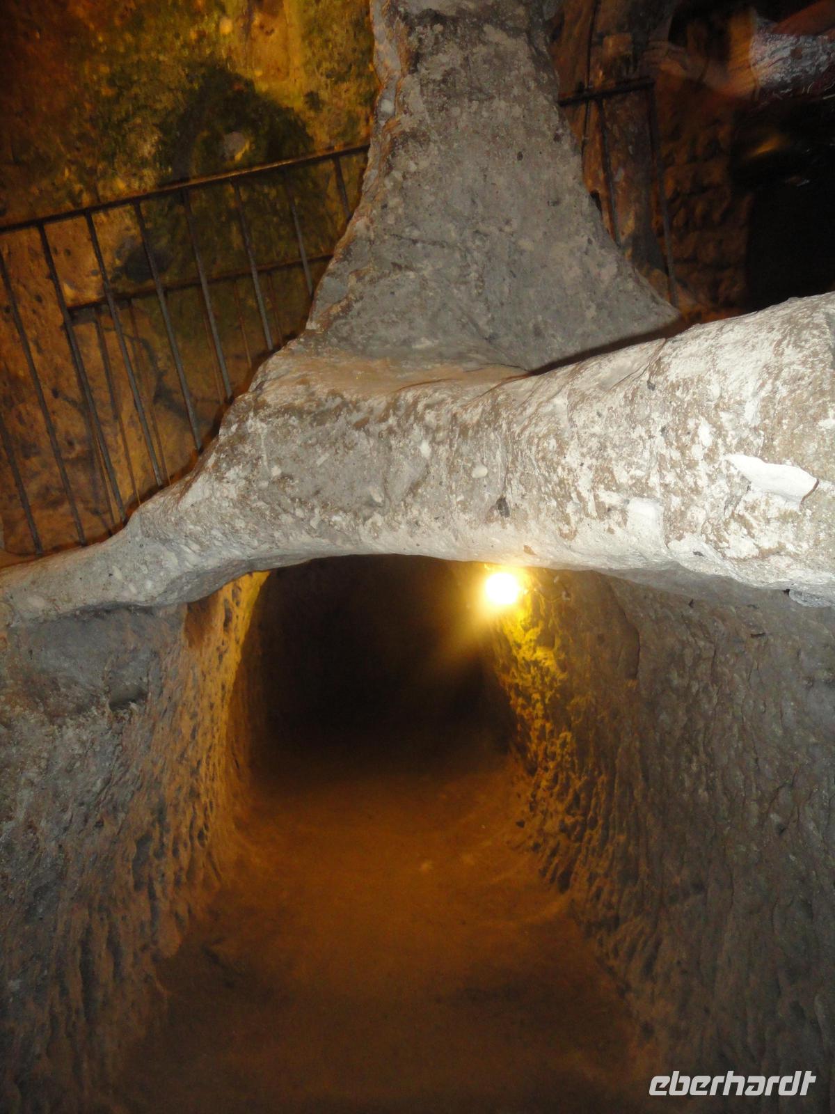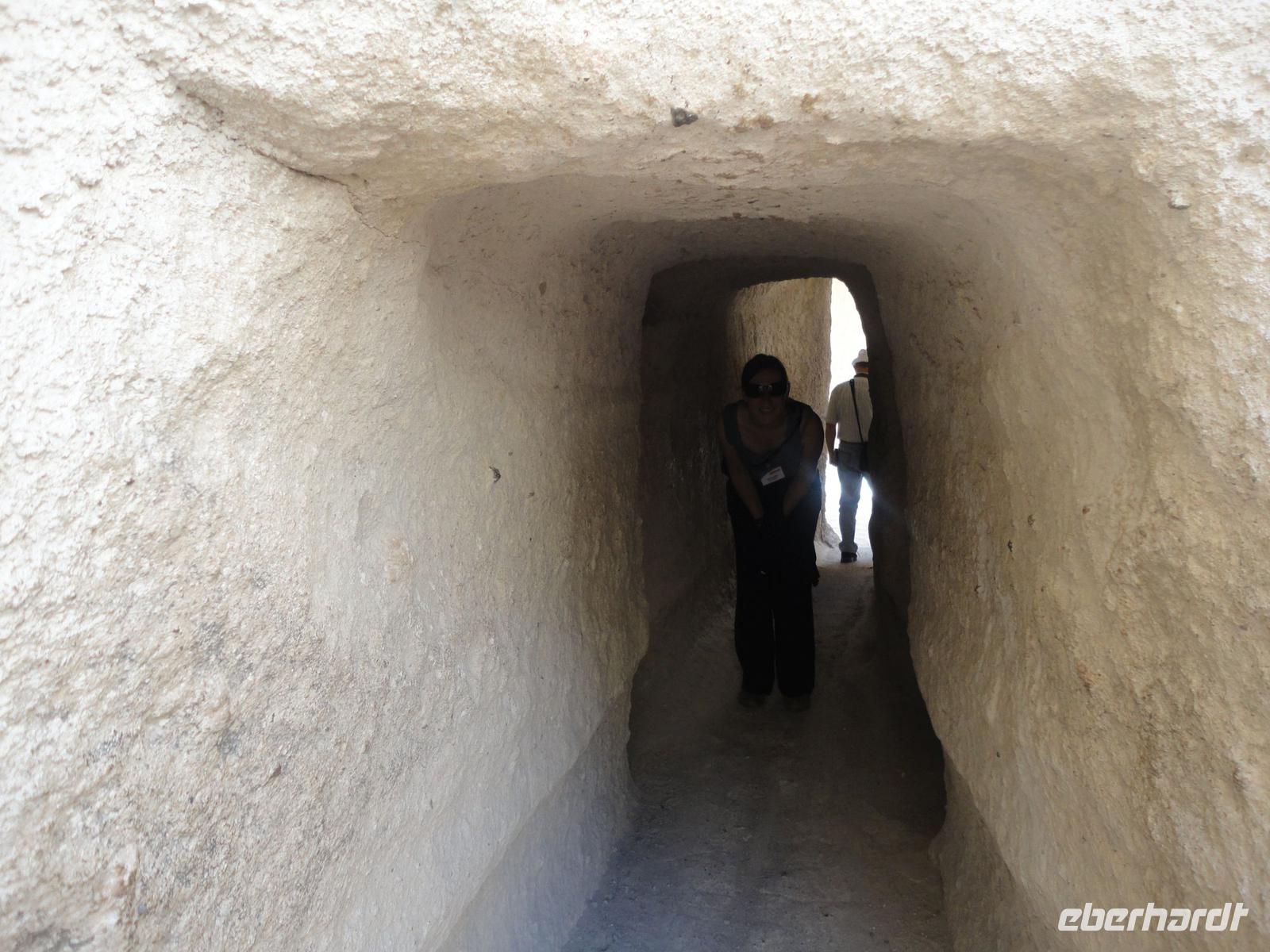 Nach der Ankunft und dem Frühstück im Hotel hieß es 09:00 Uhr Abfahrt nach Derinkuyu. Diese unterirdische Höhlenstadt besteht aus 8 Etagen und ist eine von 22 Städten, die wahrscheinlich netzwerkartig miteinander verbunden sind - zumindest gehen Archäologen heutzutage davon aus. Der Besuch der Höhlen war wirklich ein Highlight, nur leider ging die Zeit viel zu schnell rum. Gerne wären wir noch tiefer in dieses beeindruckende Labyrinth vorgedrungen. Leider konnten wir die griechisch-orthodoxe Kirche aus dem 19. Jahrhundert nicht besuchen, da sie geschlossen war.