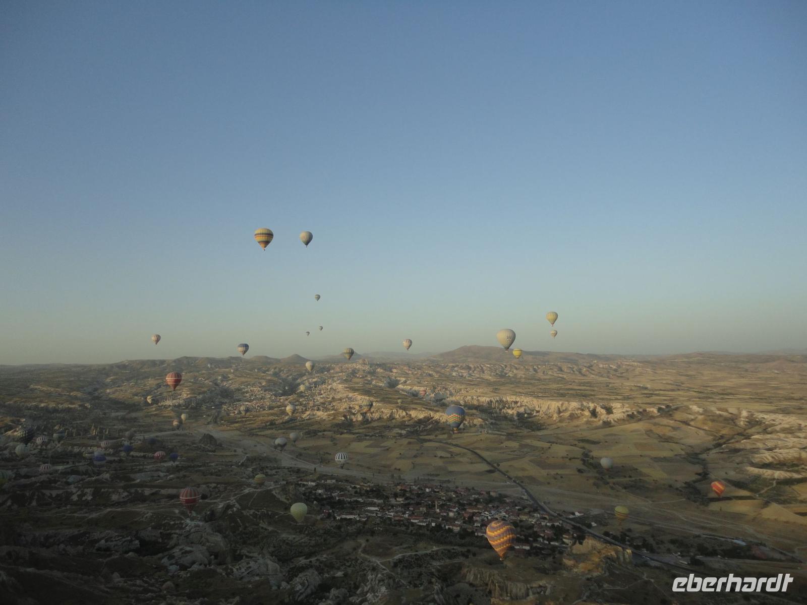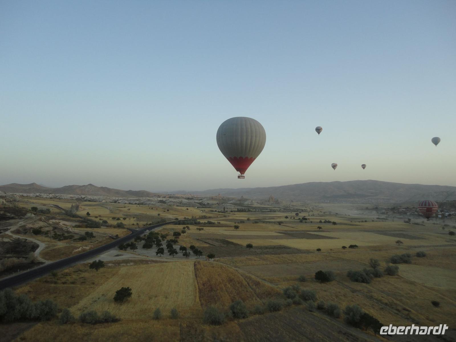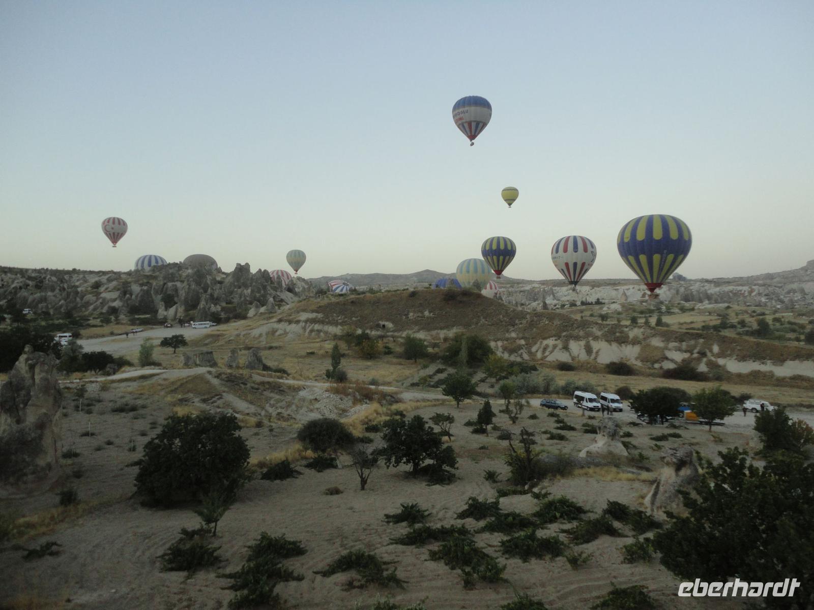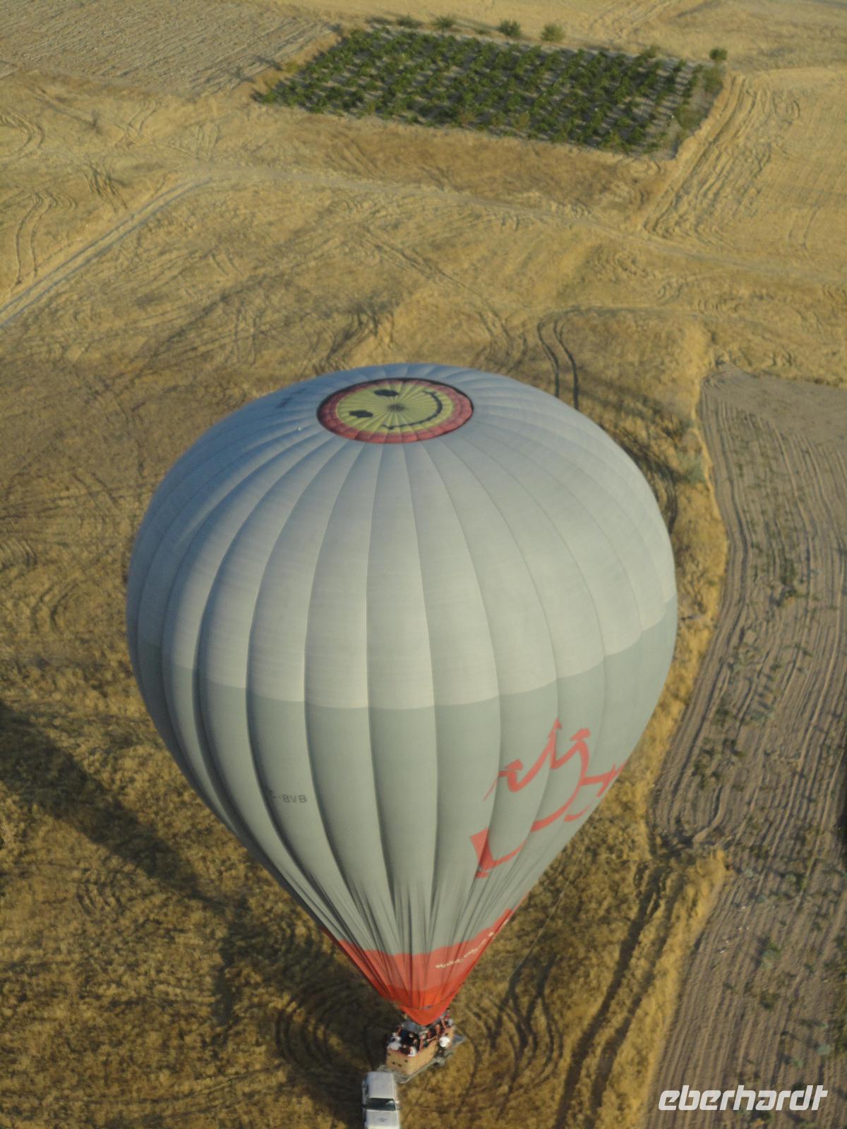 Heute ging es für 20 von uns schon sehr zeitig, eigentlich noch mitten in der Nacht raus, als 04:45 Uhr unser Wecker klingelte. Noch etwas verschlafen, aber doch schon sehr vorfreudig und ein wenig aufgeregt, fuhren wir mit unserer Reisebegleiterin Ivonne zum Startpunkt unserer Ballonfahrt nach Göreme. Dort angekommen erhielten wir eine kleine Stärkung. Kurz nach 06:00 Uhr starteten unsere beiden Ballons mit hunderten anderen in die Luft. Was für ein Augenblick! Wir erlebten eine tolle Stunde bei bestem Wetter und herrlichen Blicken über die Felsformationen von Göreme, hatten Blick auf die Geisterhöhlen von Uchisar, schwebten über dem Roten und Weißen Berg entlang. Auch Avanos und Pasa Bagi lagen vor uns in der Ferne. Der Erciyes Vulkan und die aufgehende Sonne waren ein prächtiges Fotomotiv und werden uns wohl lange im Gedächtnis bleiben! Leider ging die Stunde viel zu schnell rum, sodass wir kurz nach 07:00 Uhr wieder sicher auf dem Anhänger eines PKWs landeten. Anschließend hielt unser Pilot noch eine kurze Rede und wir stießen alle mit Sekt an. Über unsere Zertifikate und die Möglichkeit ein oder zwei tolle Fotos zu erwerben, freuten wir uns sehr. Der Morgen startete wirklich gut!