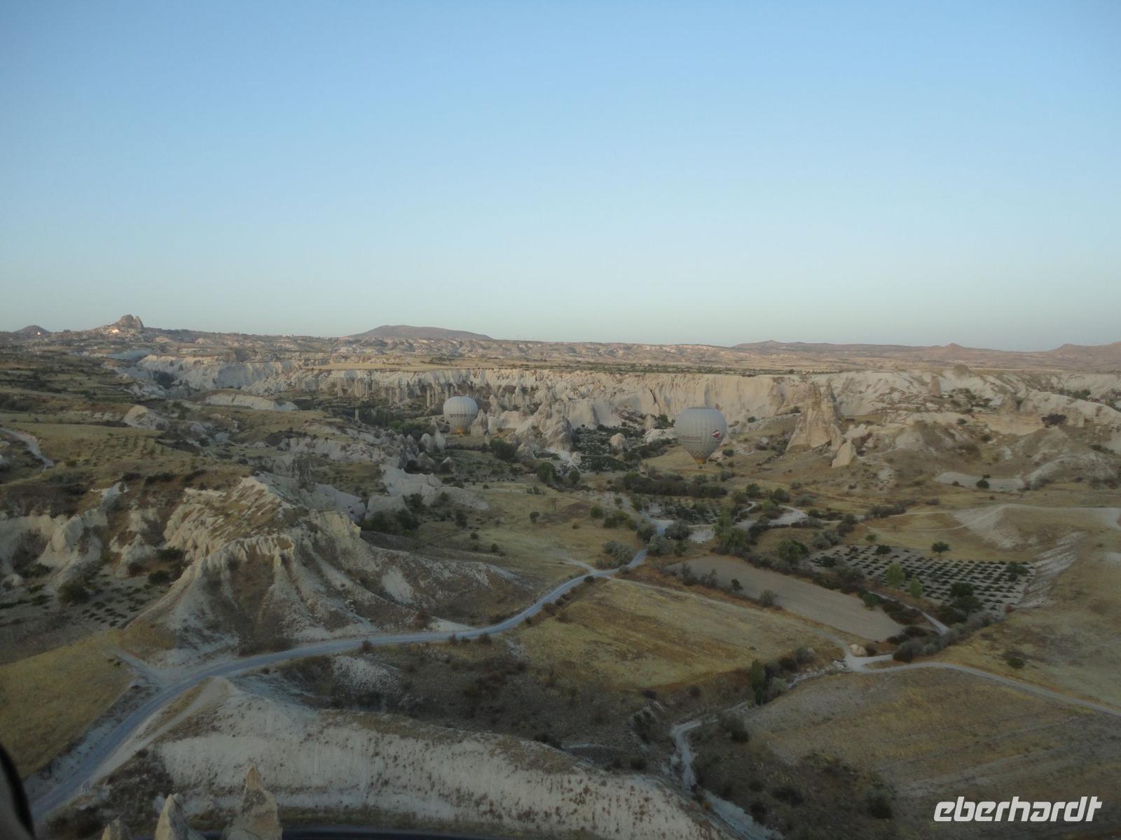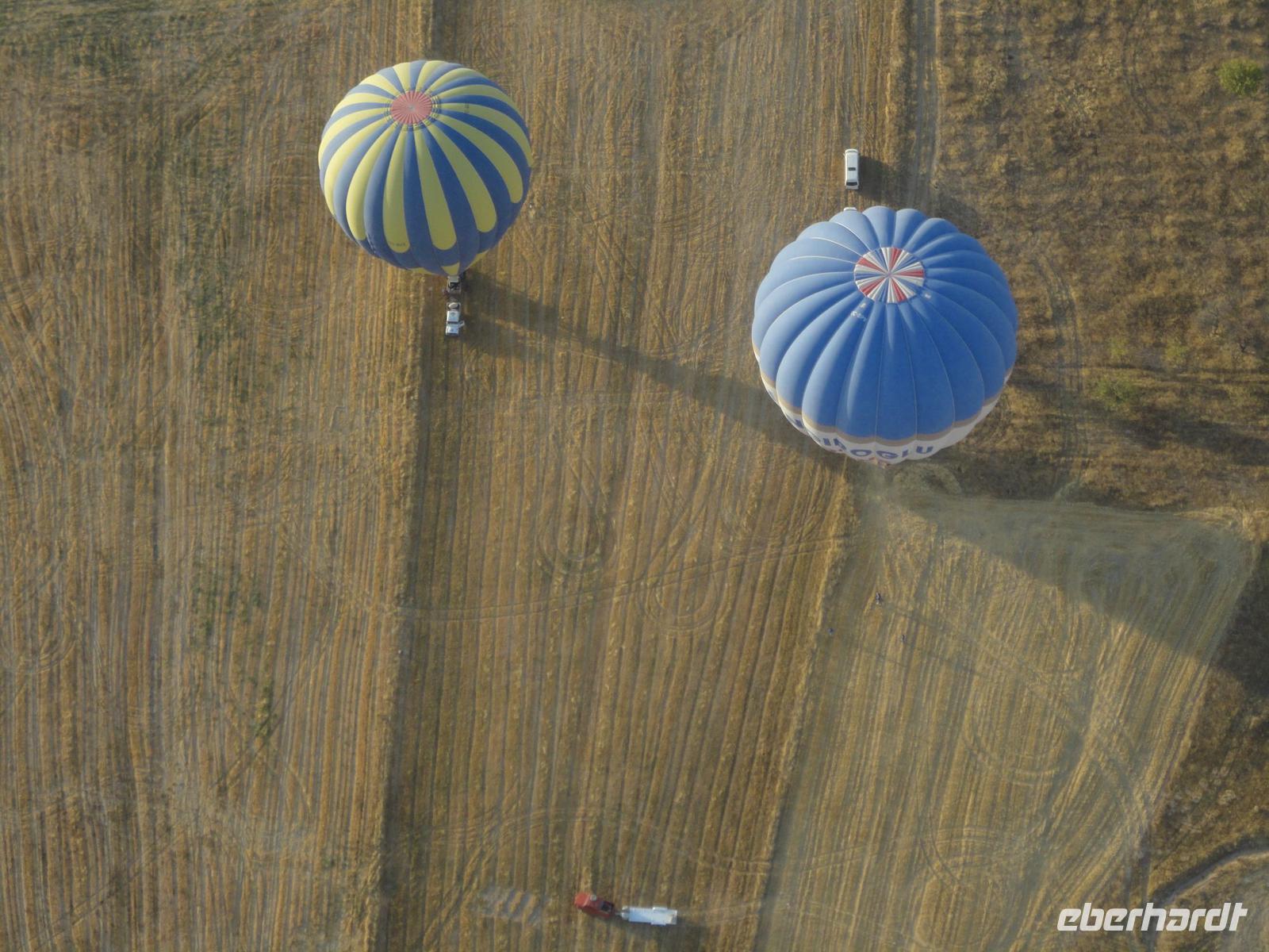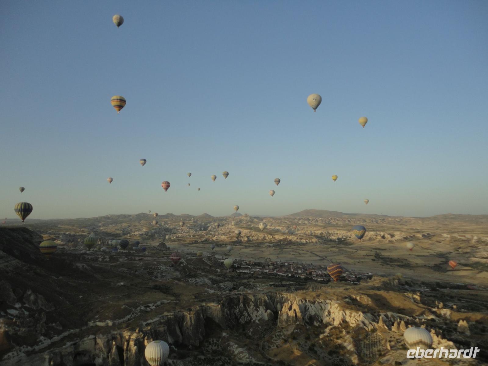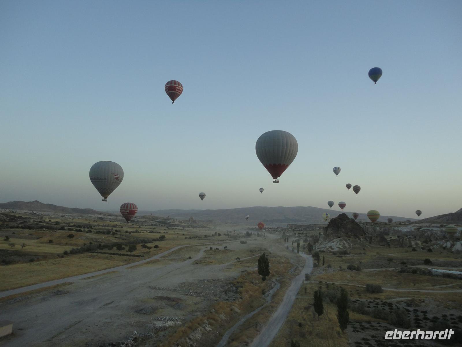 Heute ging es für 20 von uns schon sehr zeitig, eigentlich noch mitten in der Nacht raus, als 04:45 Uhr unser Wecker klingelte. Noch etwas verschlafen, aber doch schon sehr vorfreudig und ein wenig aufgeregt, fuhren wir mit unserer Reisebegleiterin Ivonne zum Startpunkt unserer Ballonfahrt nach Göreme. Dort angekommen erhielten wir eine kleine Stärkung. Kurz nach 06:00 Uhr starteten unsere beiden Ballons mit hunderten anderen in die Luft. Was für ein Augenblick! Wir erlebten eine tolle Stunde bei bestem Wetter und herrlichen Blicken über die Felsformationen von Göreme, hatten Blick auf die Geisterhöhlen von Uchisar, schwebten über dem Roten und Weißen Berg entlang. Auch Avanos und Pasa Bagi lagen vor uns in der Ferne. Der Erciyes Vulkan und die aufgehende Sonne waren ein prächtiges Fotomotiv und werden uns wohl lange im Gedächtnis bleiben! Leider ging die Stunde viel zu schnell rum, sodass wir kurz nach 07:00 Uhr wieder sicher auf dem Anhänger eines PKWs landeten. Anschließend hielt unser Pilot noch eine kurze Rede und wir stießen alle mit Sekt an. Über unsere Zertifikate und die Möglichkeit ein oder zwei tolle Fotos zu erwerben, freuten wir uns sehr. Der Morgen startete wirklich gut!