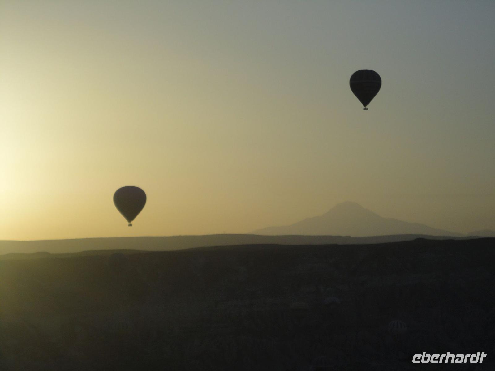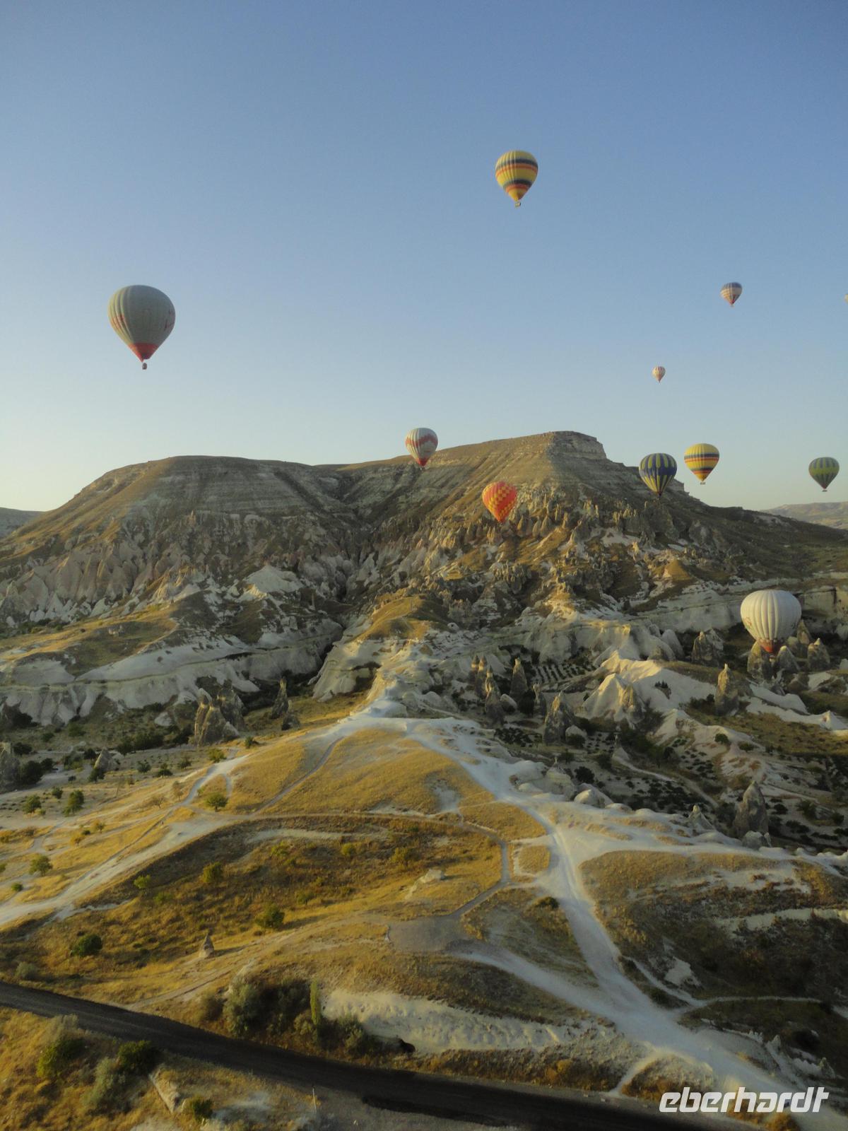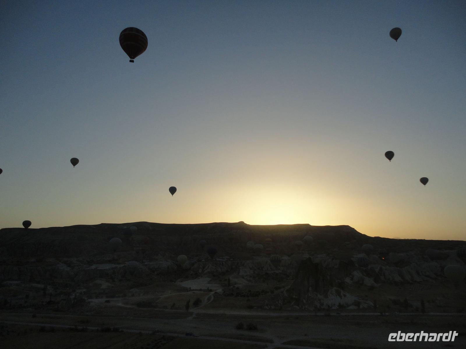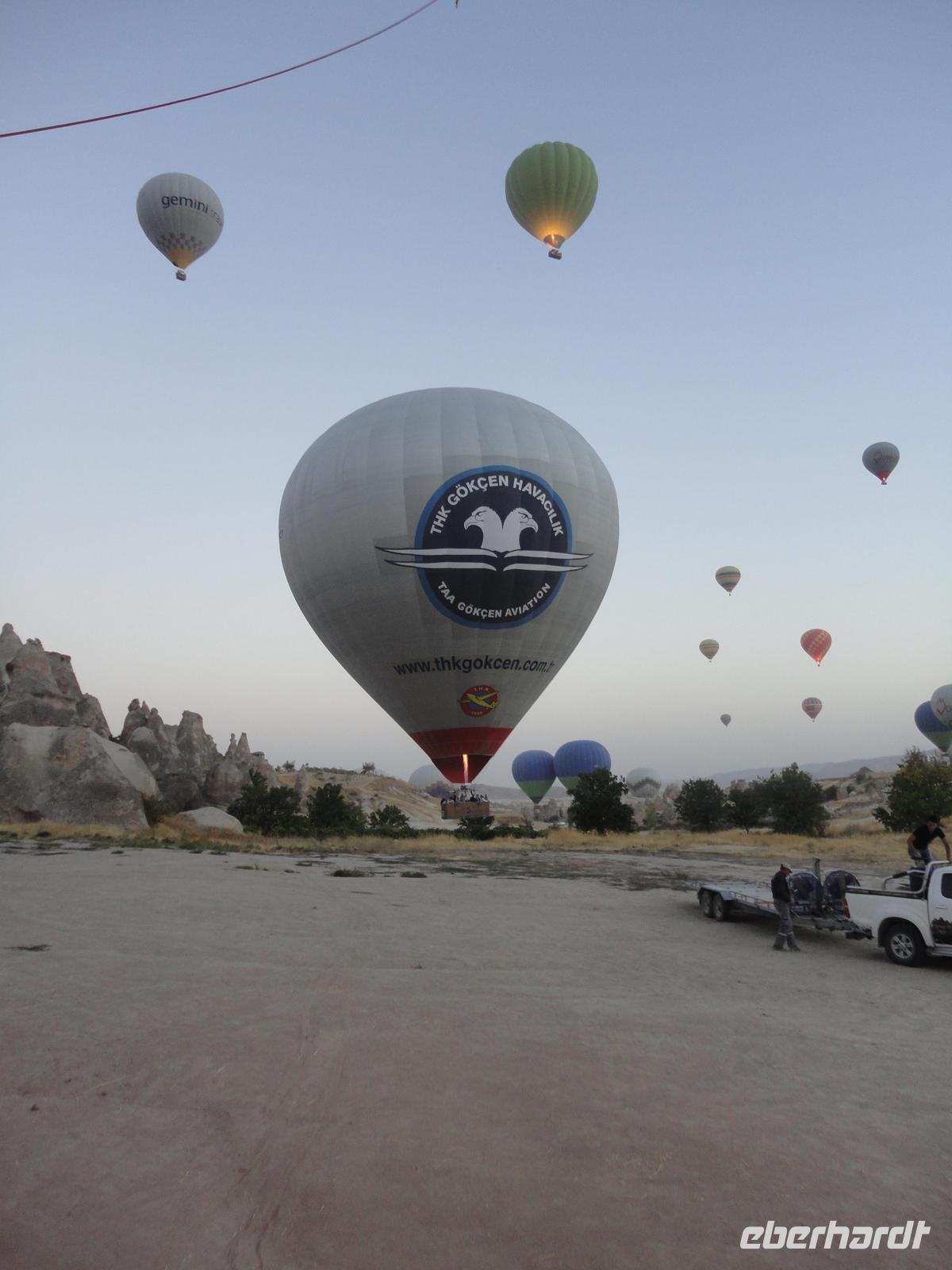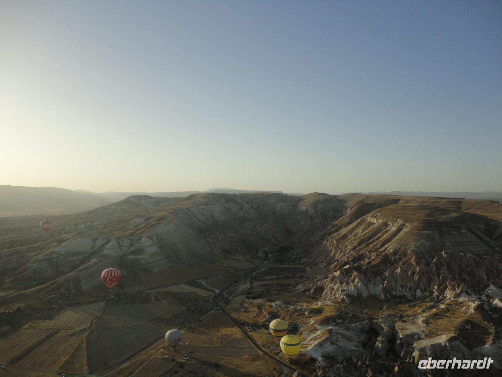 Heute ging es für 20 von uns schon sehr zeitig, eigentlich noch mitten in der Nacht raus, als 04:45 Uhr unser Wecker klingelte. Noch etwas verschlafen, aber doch schon sehr vorfreudig und ein wenig aufgeregt, fuhren wir mit unserer Reisebegleiterin Ivonne zum Startpunkt unserer Ballonfahrt nach Göreme. Dort angekommen erhielten wir eine kleine Stärkung. Kurz nach 06:00 Uhr starteten unsere beiden Ballons mit hunderten anderen in die Luft. Was für ein Augenblick! Wir erlebten eine tolle Stunde bei bestem Wetter und herrlichen Blicken über die Felsformationen von Göreme, hatten Blick auf die Geisterhöhlen von Uchisar, schwebten über dem Roten und Weißen Berg entlang. Auch Avanos und Pasa Bagi lagen vor uns in der Ferne. Der Erciyes Vulkan und die aufgehende Sonne waren ein prächtiges Fotomotiv und werden uns wohl lange im Gedächtnis bleiben! Leider ging die Stunde viel zu schnell rum, sodass wir kurz nach 07:00 Uhr wieder sicher auf dem Anhänger eines PKWs landeten. Anschließend hielt unser Pilot noch eine kurze Rede und wir stießen alle mit Sekt an. Über unsere Zertifikate und die Möglichkeit ein oder zwei tolle Fotos zu erwerben, freuten wir uns sehr. Der Morgen startete wirklich gut!