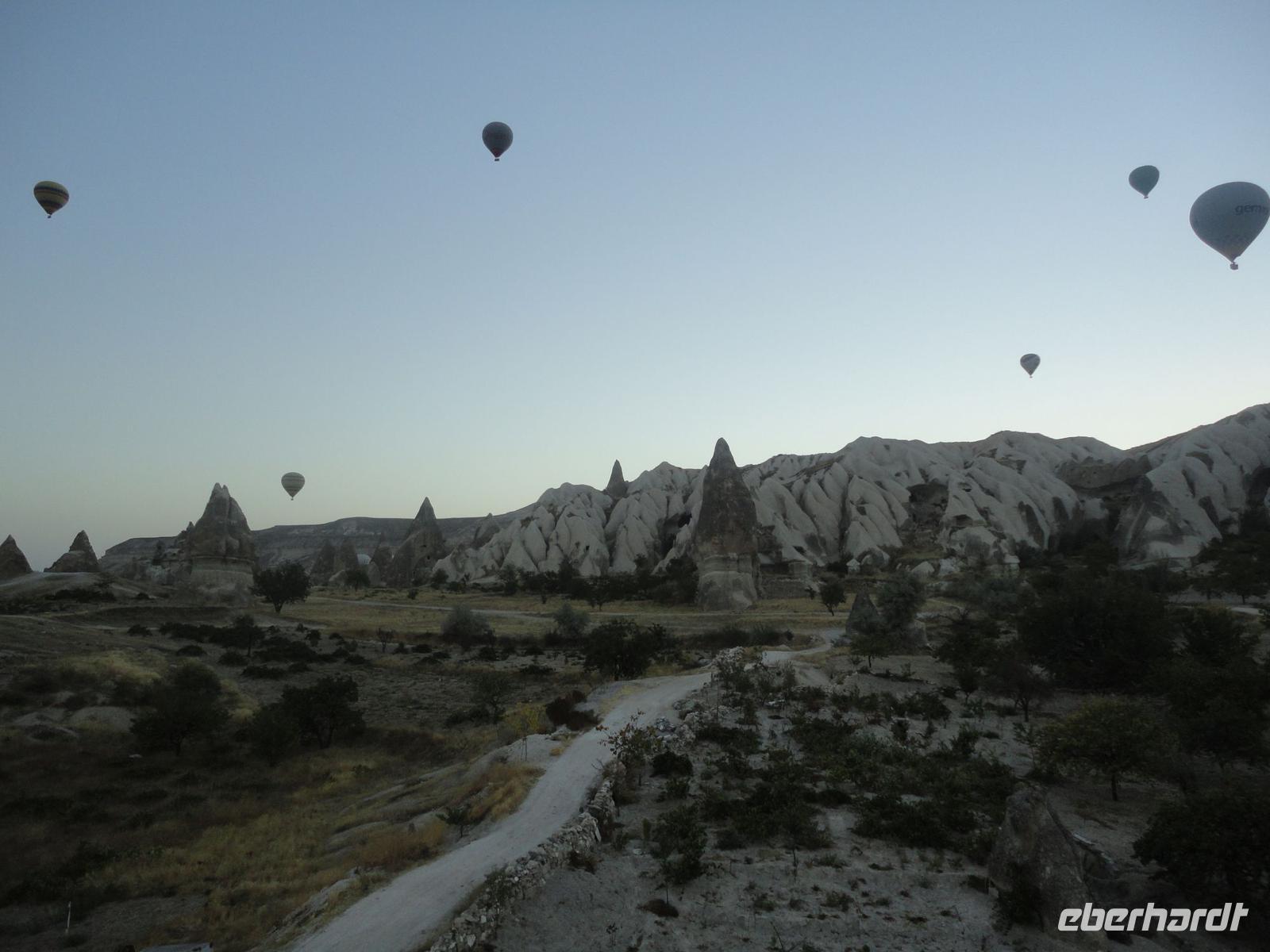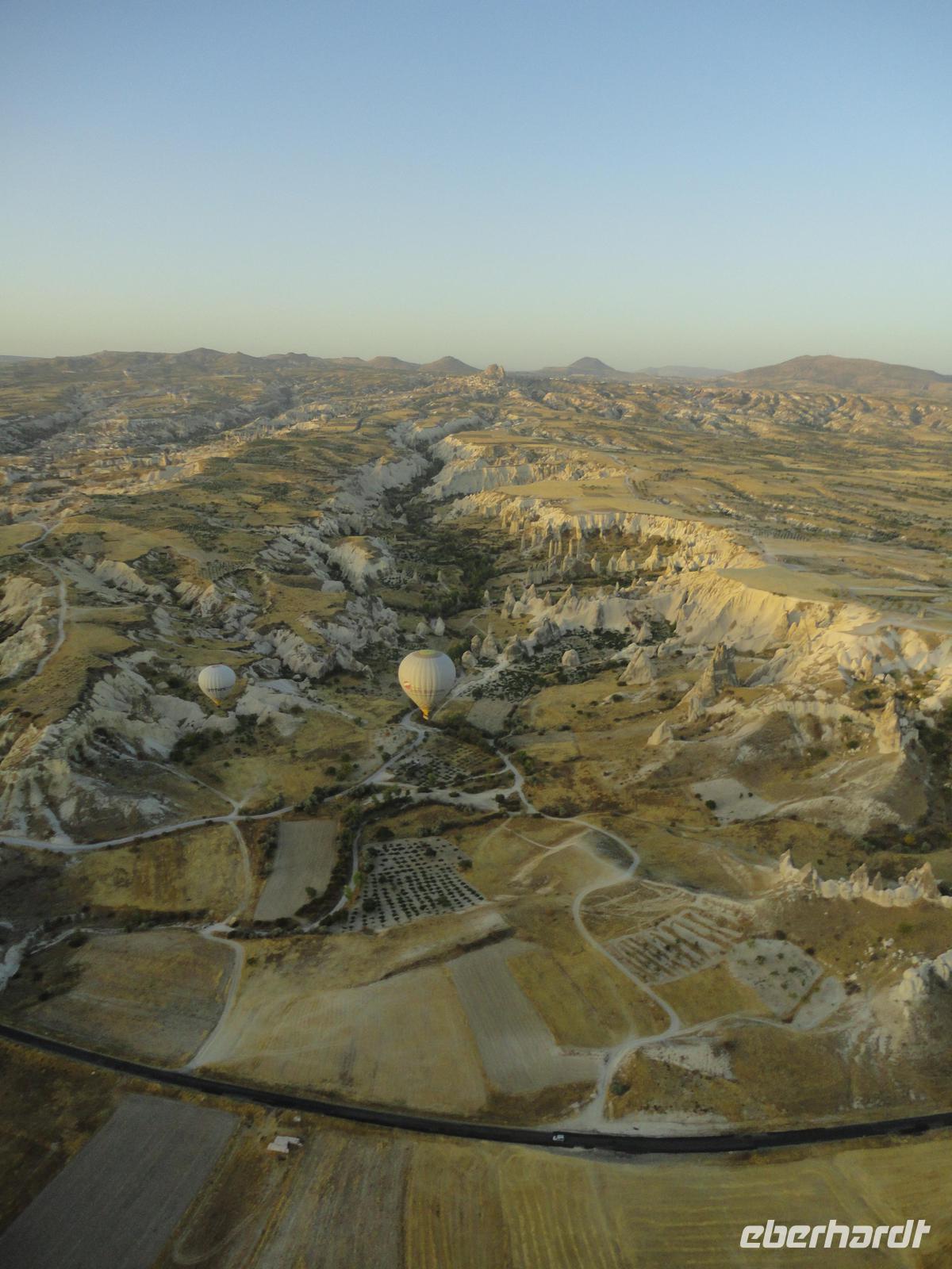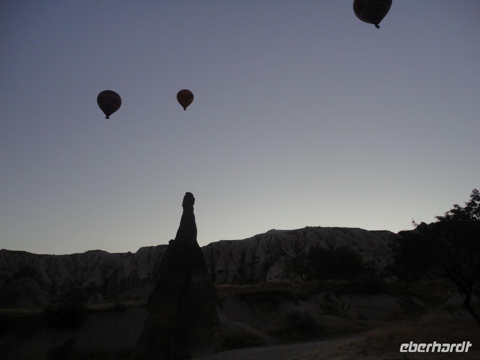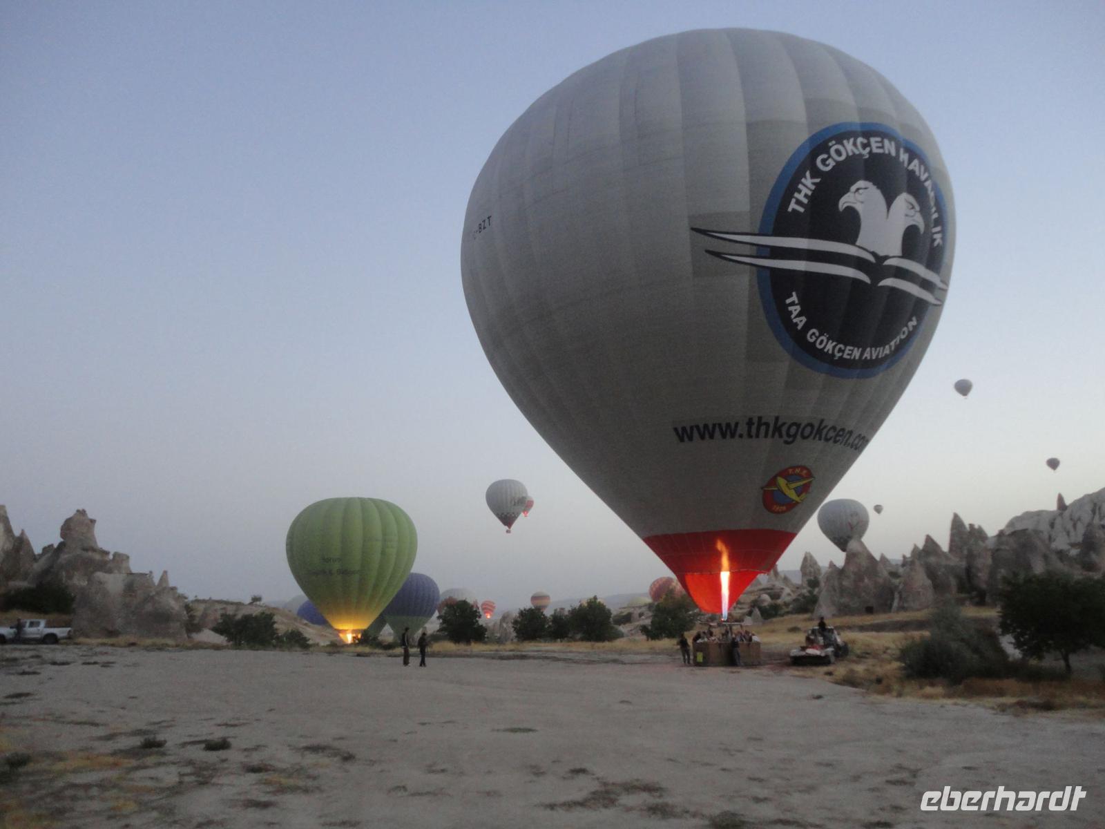 Heute ging es für 20 von uns schon sehr zeitig, eigentlich noch mitten in der Nacht raus, als 04:45 Uhr unser Wecker klingelte. Noch etwas verschlafen, aber doch schon sehr vorfreudig und ein wenig aufgeregt, fuhren wir mit unserer Reisebegleiterin Ivonne zum Startpunkt unserer Ballonfahrt nach Göreme. Dort angekommen erhielten wir eine kleine Stärkung. Kurz nach 06:00 Uhr starteten unsere beiden Ballons mit hunderten anderen in die Luft. Was für ein Augenblick! Wir erlebten eine tolle Stunde bei bestem Wetter und herrlichen Blicken über die Felsformationen von Göreme, hatten Blick auf die Geisterhöhlen von Uchisar, schwebten über dem Roten und Weißen Berg entlang. Auch Avanos und Pasa Bagi lagen vor uns in der Ferne. Der Erciyes Vulkan und die aufgehende Sonne waren ein prächtiges Fotomotiv und werden uns wohl lange im Gedächtnis bleiben! Leider ging die Stunde viel zu schnell rum, sodass wir kurz nach 07:00 Uhr wieder sicher auf dem Anhänger eines PKWs landeten. Anschließend hielt unser Pilot noch eine kurze Rede und wir stießen alle mit Sekt an. Über unsere Zertifikate und die Möglichkeit ein oder zwei tolle Fotos zu erwerben, freuten wir uns sehr. Der Morgen startete wirklich gut!