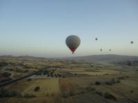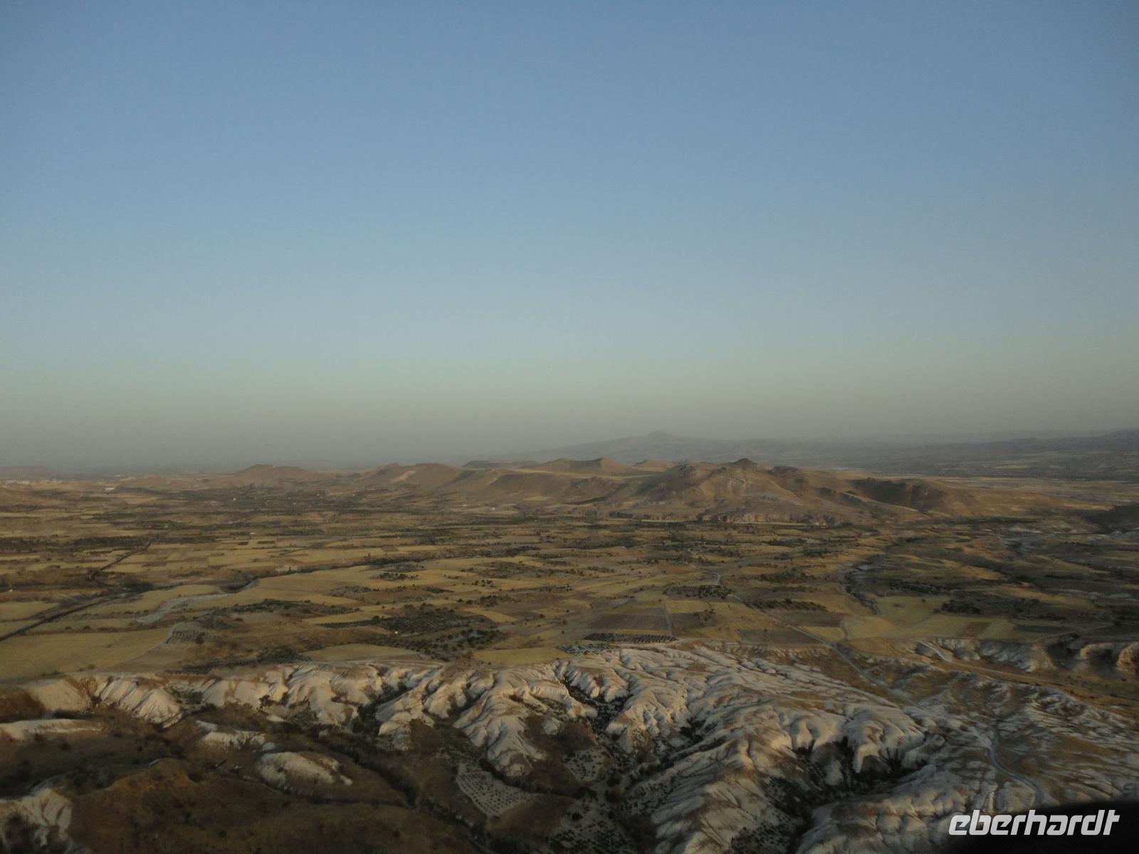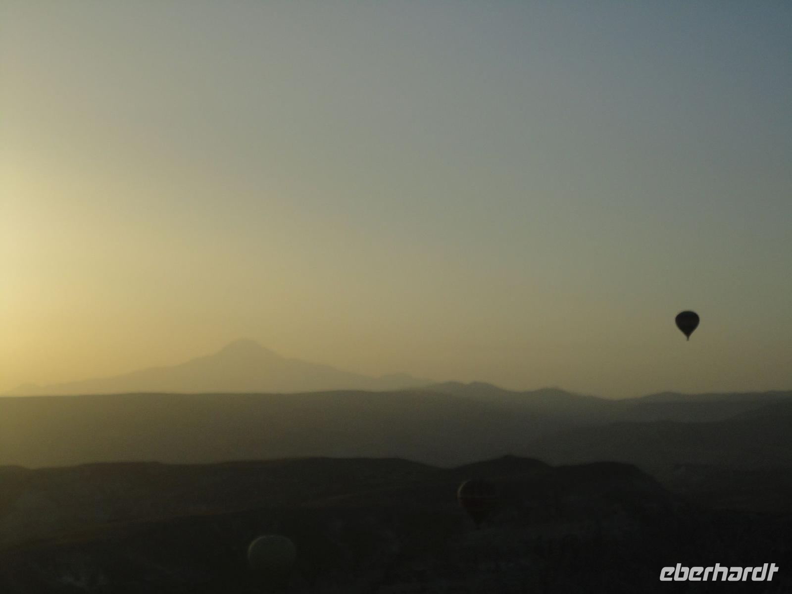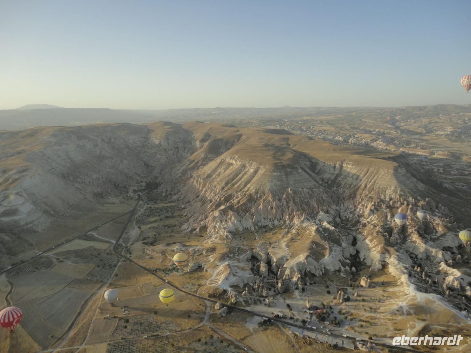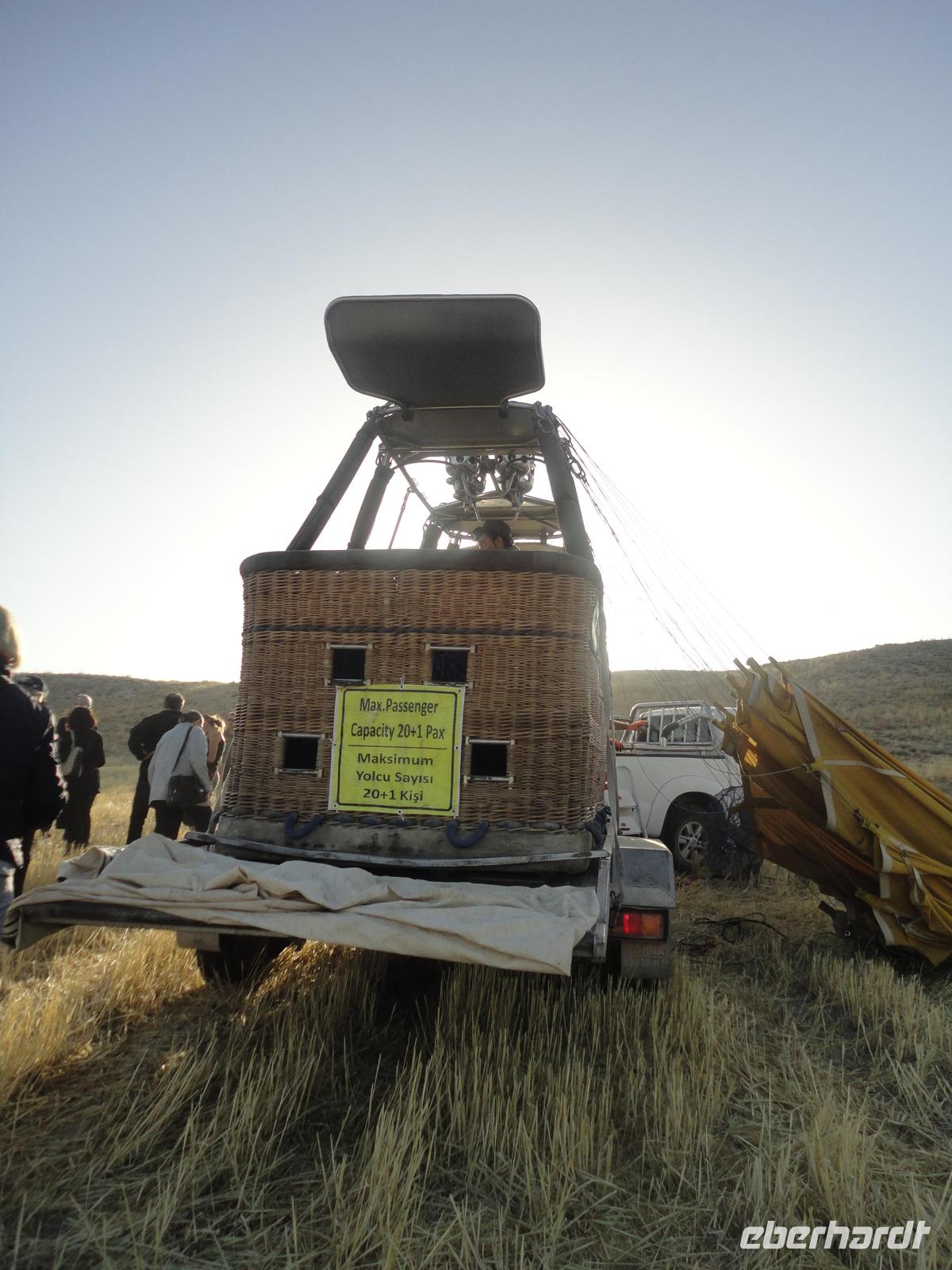 Heute ging es für 20 von uns schon sehr zeitig, eigentlich noch mitten in der Nacht raus, als 04:45 Uhr unser Wecker klingelte. Noch etwas verschlafen, aber doch schon sehr vorfreudig und ein wenig aufgeregt, fuhren wir mit unserer Reisebegleiterin Ivonne zum Startpunkt unserer Ballonfahrt nach Göreme. Dort angekommen erhielten wir eine kleine Stärkung. Kurz nach 06:00 Uhr starteten unsere beiden Ballons mit hunderten anderen in die Luft. Was für ein Augenblick! Wir erlebten eine tolle Stunde bei bestem Wetter und herrlichen Blicken über die Felsformationen von Göreme, hatten Blick auf die Geisterhöhlen von Uchisar, schwebten über dem Roten und Weißen Berg entlang. Auch Avanos und Pasa Bagi lagen vor uns in der Ferne. Der Erciyes Vulkan und die aufgehende Sonne waren ein prächtiges Fotomotiv und werden uns wohl lange im Gedächtnis bleiben! Leider ging die Stunde viel zu schnell rum, sodass wir kurz nach 07:00 Uhr wieder sicher auf dem Anhänger eines PKWs landeten. Anschließend hielt unser Pilot noch eine kurze Rede und wir stießen alle mit Sekt an. Über unsere Zertifikate und die Möglichkeit ein oder zwei tolle Fotos zu erwerben, freuten wir uns sehr. Der Morgen startete wirklich gut!