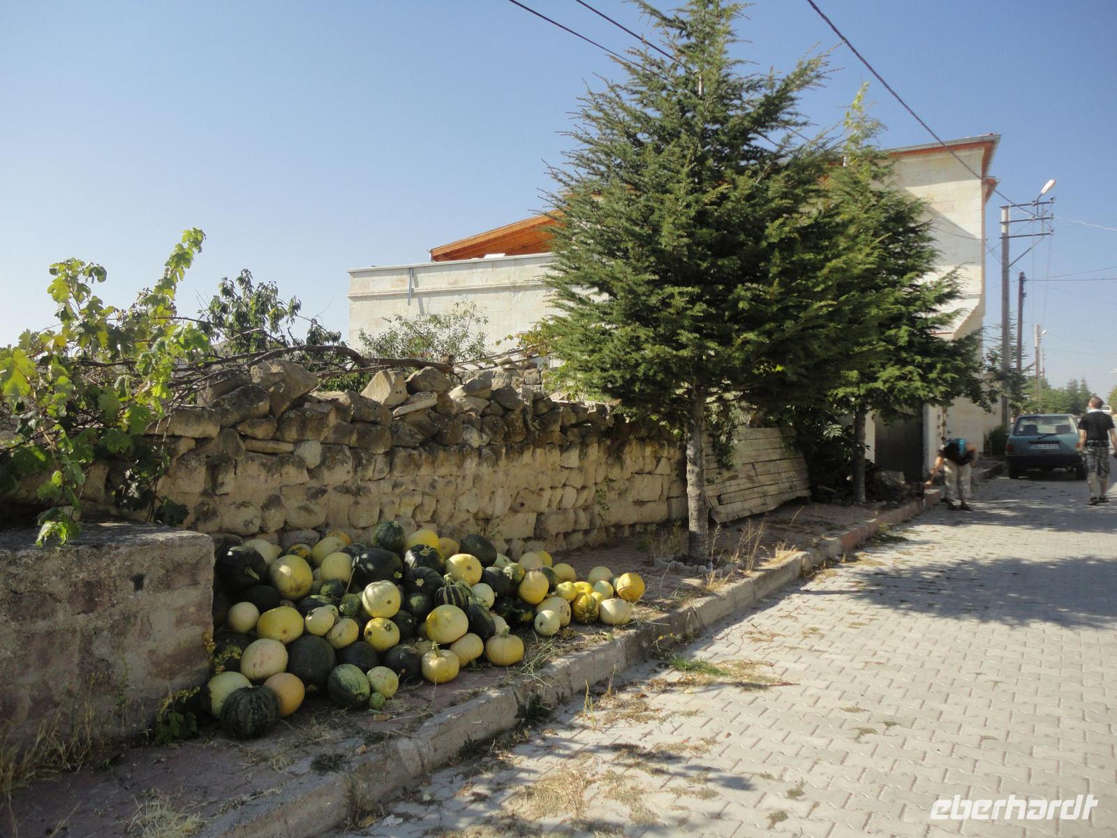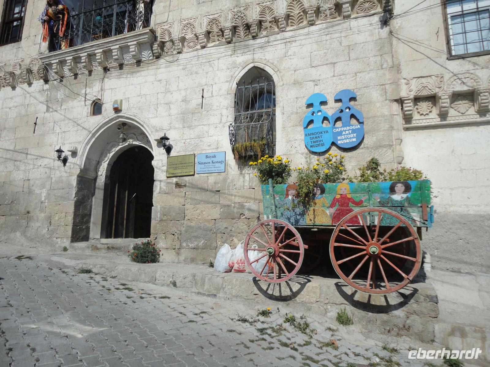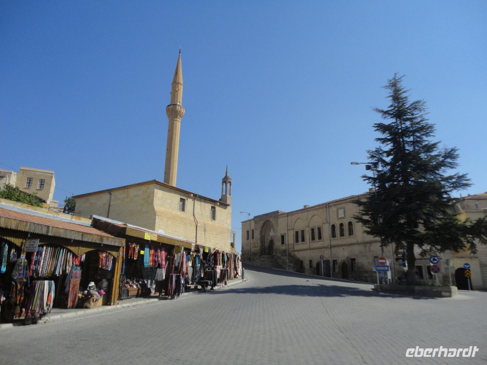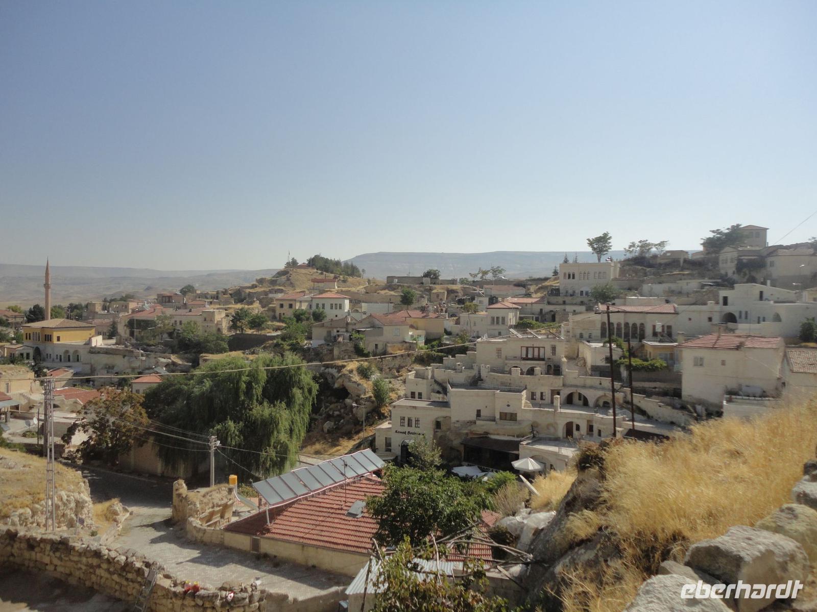 Heute stand die Besichtigung eines der schönsten Dörfers Kappadokiens, des griechisch-orthodoxen Dorfes Mustafapasa auf unserem Programm. Nach der Ankunft am Belediye mit der goldenen Büste hatten wir eine Stunde Freizeit, um einen Spaziergang durch das Dorf zu unternehmen. Das Dorf wirkte teilweise wie ausgestorben, dann wieder überraschten uns Einheimische mit ihren Deutschkenntnisse oder moderne Kunstmuseen. Auch sehr interessant war, wie die Frauen auf der Straße in riesigen Töpfen Tomaten zu Ketchup zubereiteten.