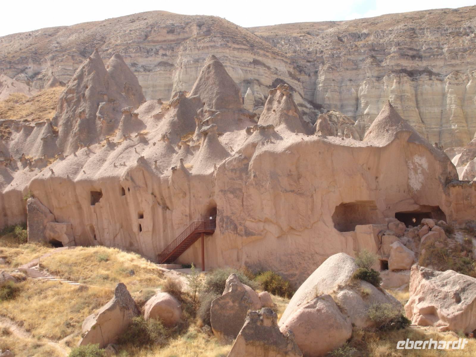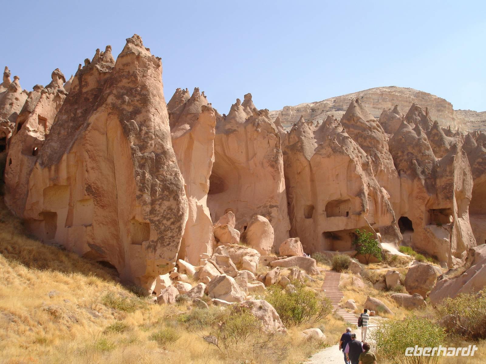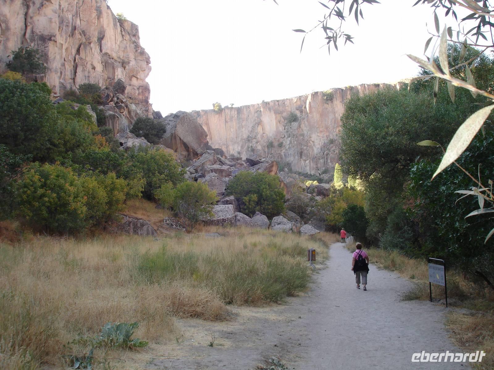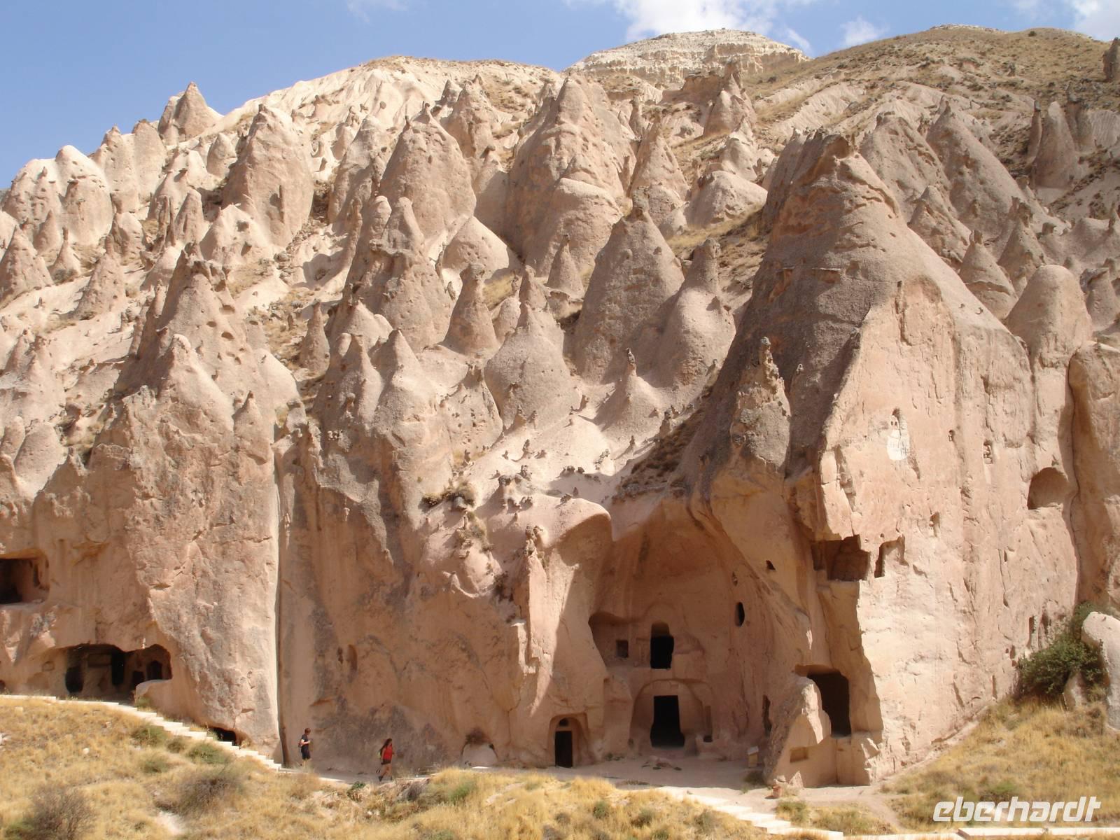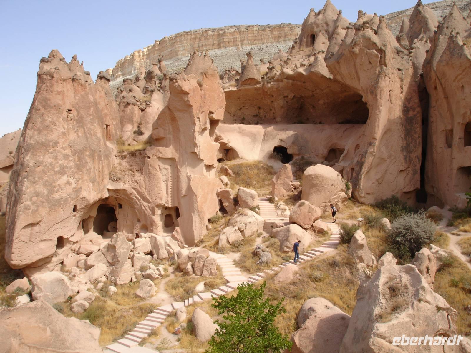 Das Ihlara-Tal liegt in einer Art Canyon. Zuerst schauten wir vom Rand des Canyons in das ca. 100 Meter tiefe Tal, um dann fast 400 Stufen hinab zu steigen. Dieser imposante Abstieg mußte natürlich in einem- für alle Gruppen von Eberhardt Travel schon zur schönenTradition gewordenen- Gruppenfoto festgehalten werden.