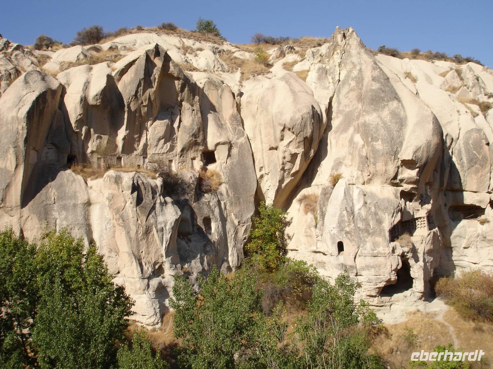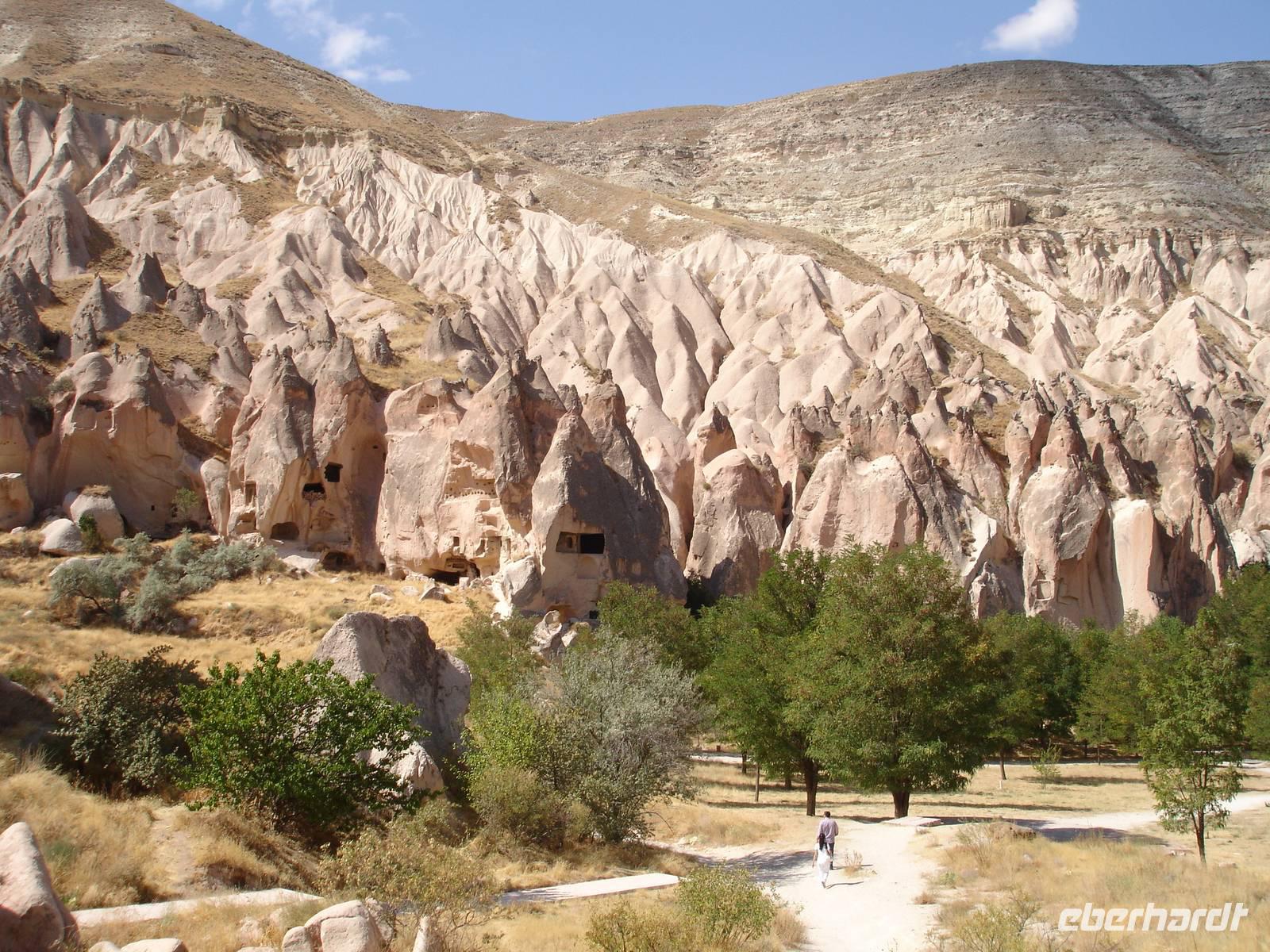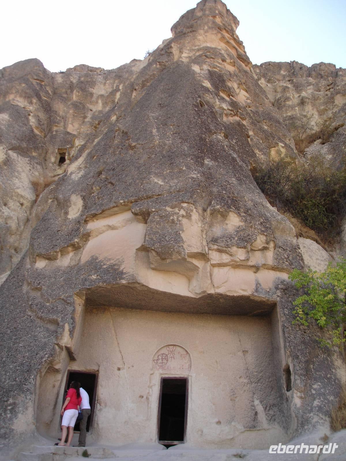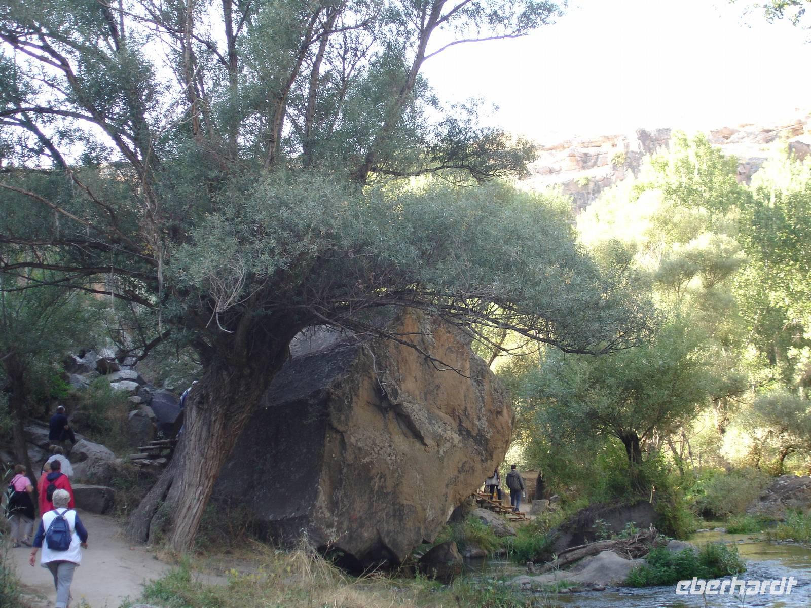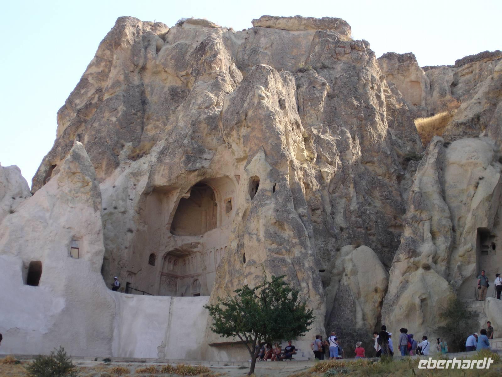 Das Ihlara-Tal liegt in einer Art Canyon. Zuerst schauten wir vom Rand des Canyons in das ca. 100 Meter tiefe Tal, um dann fast 400 Stufen hinab zu steigen. Dieser imposante Abstieg mußte natürlich in einem- für alle Gruppen von Eberhardt Travel schon zur schönenTradition gewordenen- Gruppenfoto festgehalten werden.