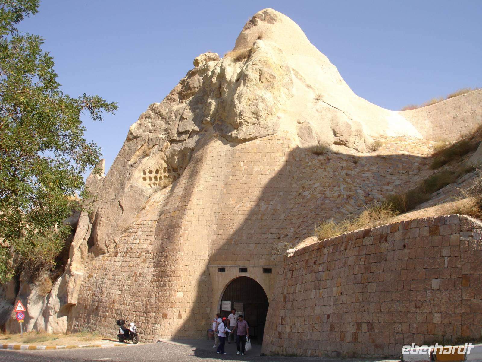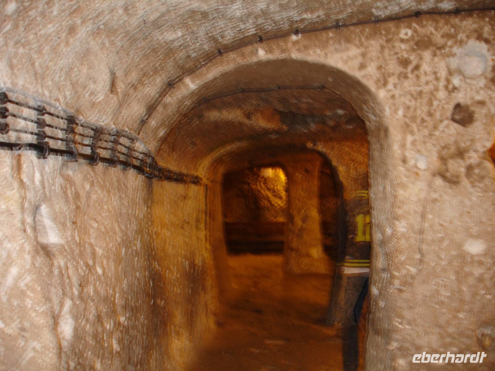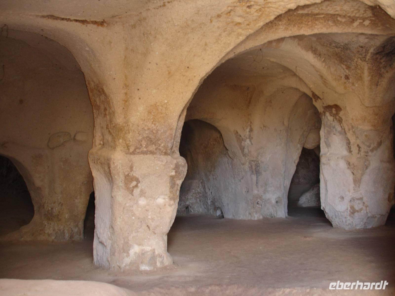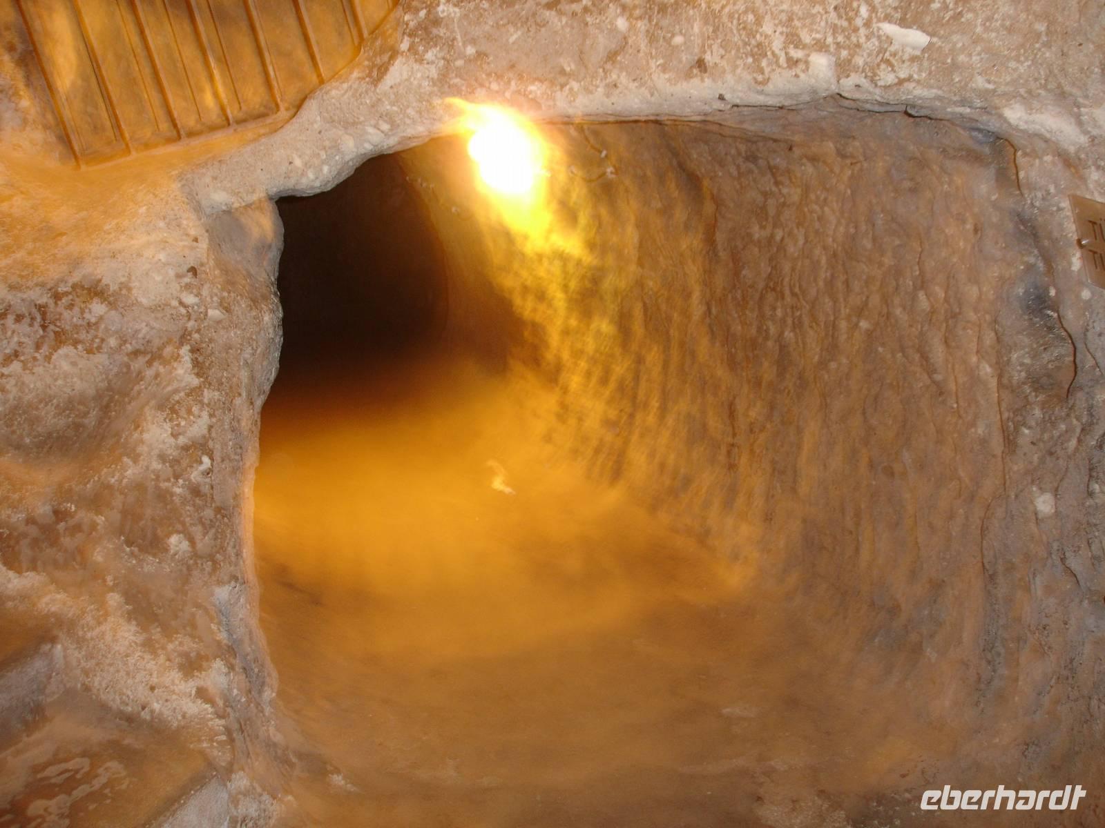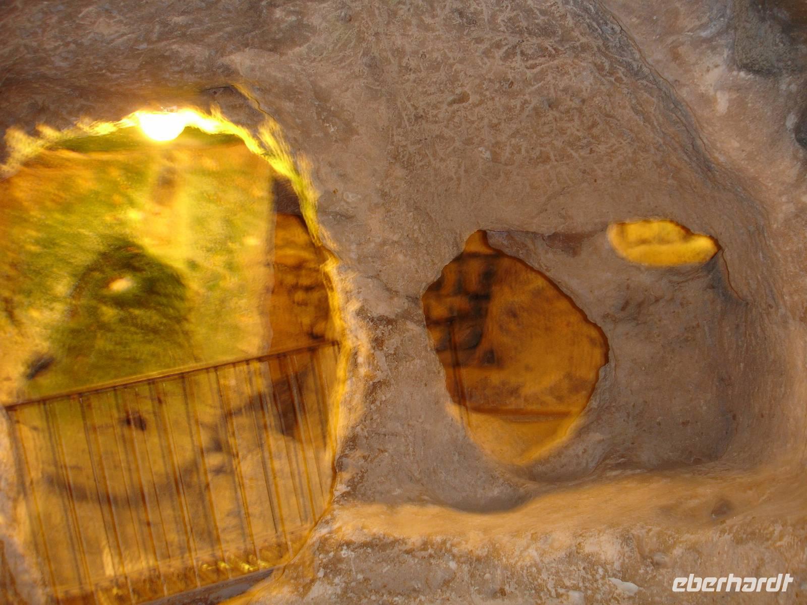 Gestärkt reisten wir weiter nach Derinkuyu und besuchten dort eine unterirdische Stadt. Von den 200 in Kappadokien entdeckten unterirdischen Städten, wobei nur 50 erschlossen wurden, ist die in Derinkuyu die Größte. Sie wurde zufällig 1963 entdeckt und ist 85 Meter tief. Wir stiegen bis zur 4. Etage hinab und konnten uns davon überzeugen, daß bei Gefahr für ein unterirdisches Leben mit belüfteten Wohnräumen, Stallungen, Kirche, Friedhof und auch Toiletten alles vorhanden war. Alle waren jedoch sehr erleichtert nach über 40 Minuten durch die sehr engen Gänge wieder hinauf das Tageslicht erblicken zu können.